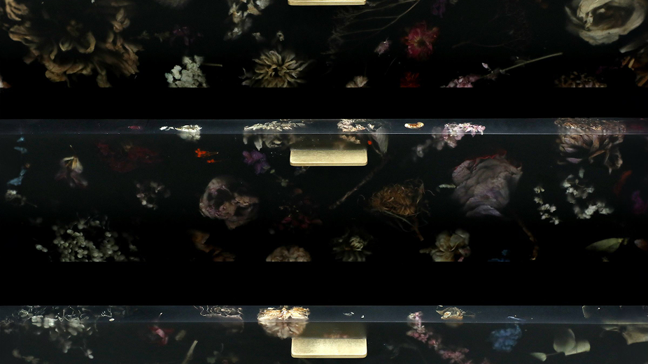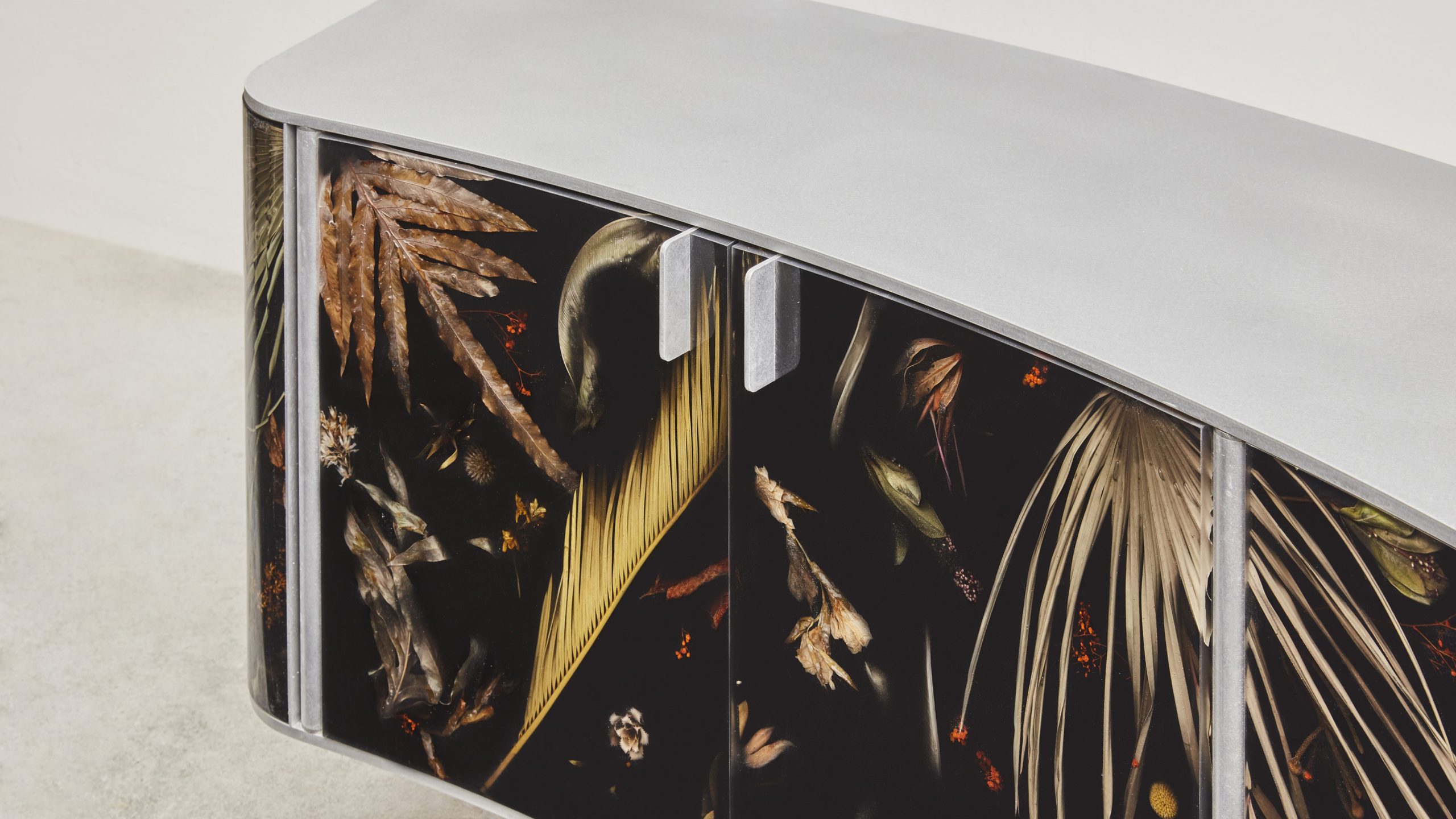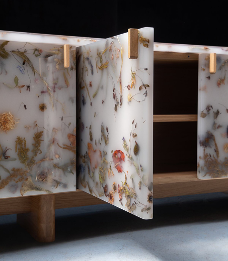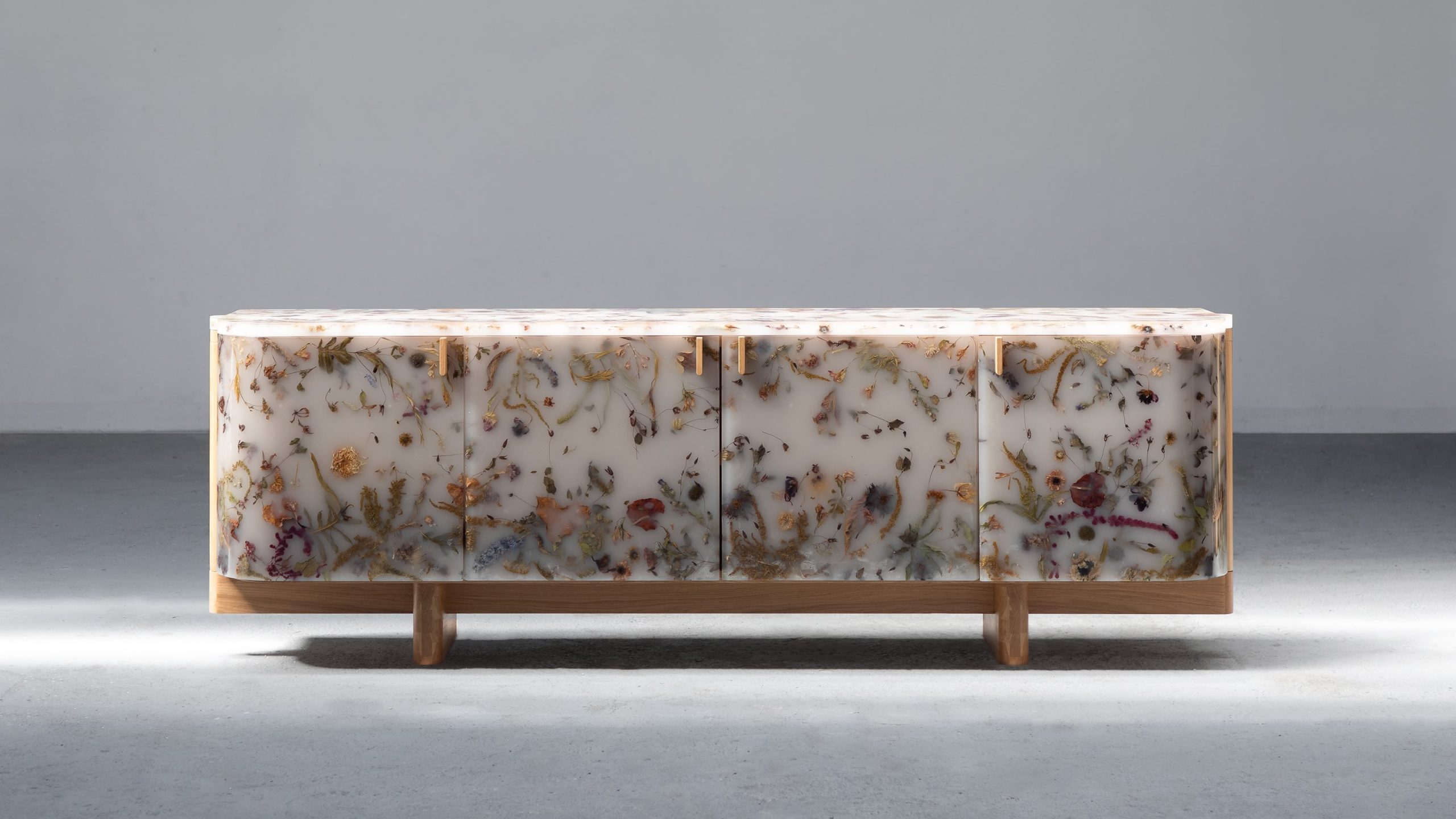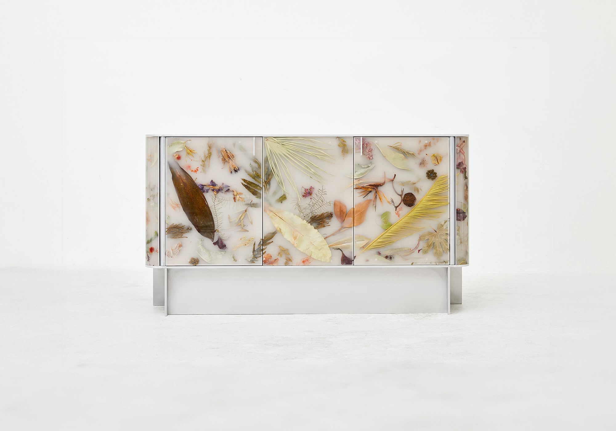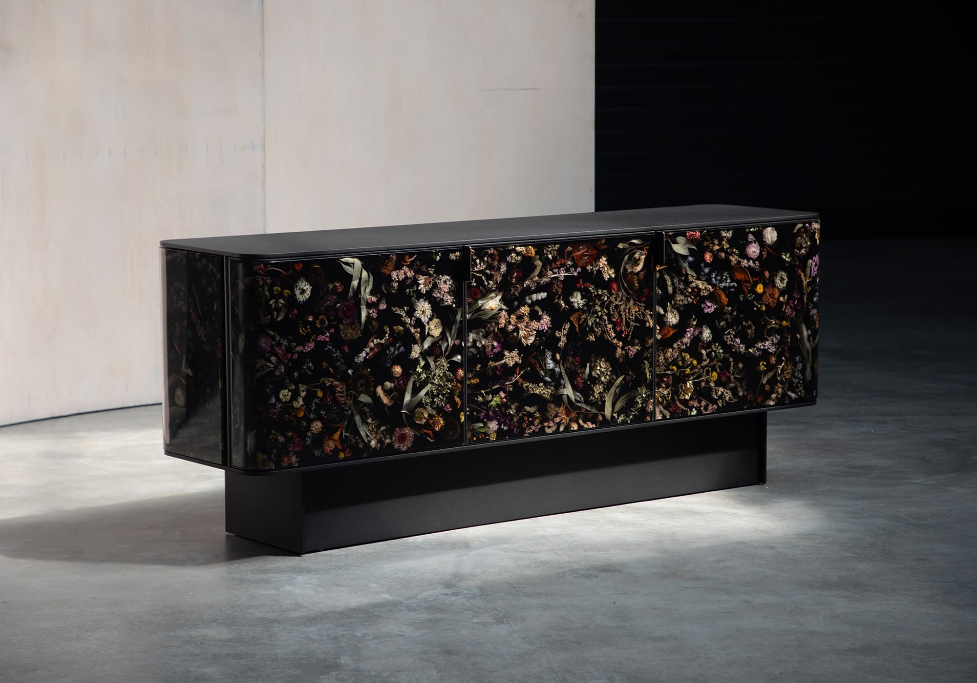 Each Credenza is handmade to order in a labour- and time-consuming process. Everything from collecting and processing the botanical matter, to encapsulating it in cast resin and to setting the material on a handmade wooden or metal frame is done by hand in our studio by our seasoned craftspeople. Thanks to our vast botanical library, each piece features a unique floral composition, where the flowers are chosen for their sculptural shapes, vivid colours, and special significance.