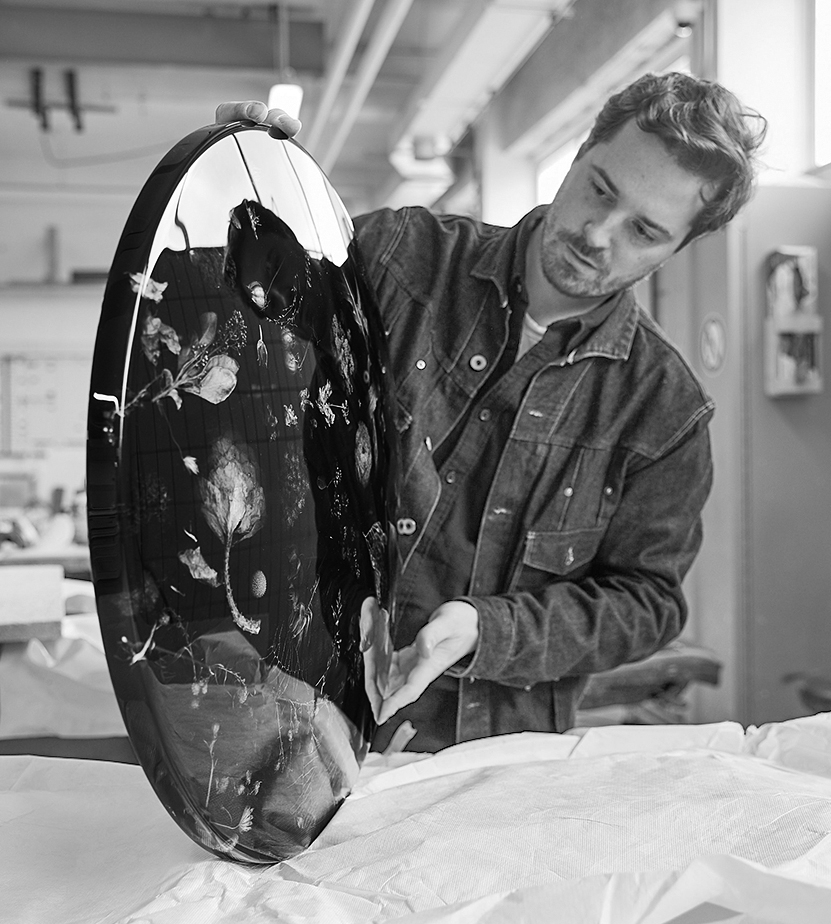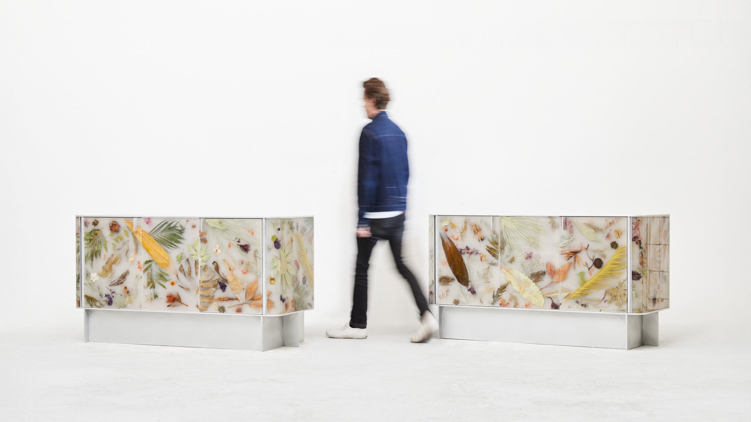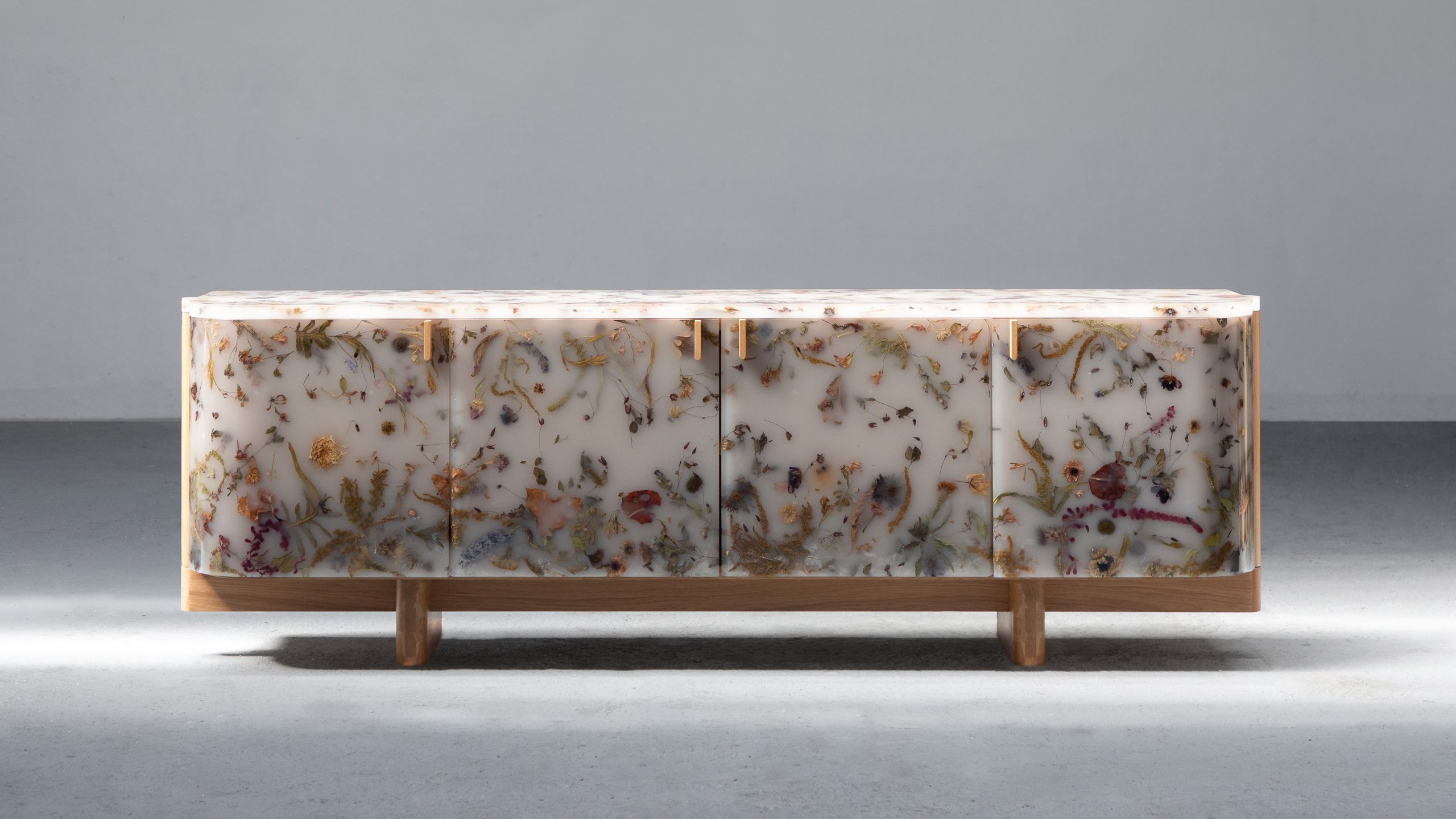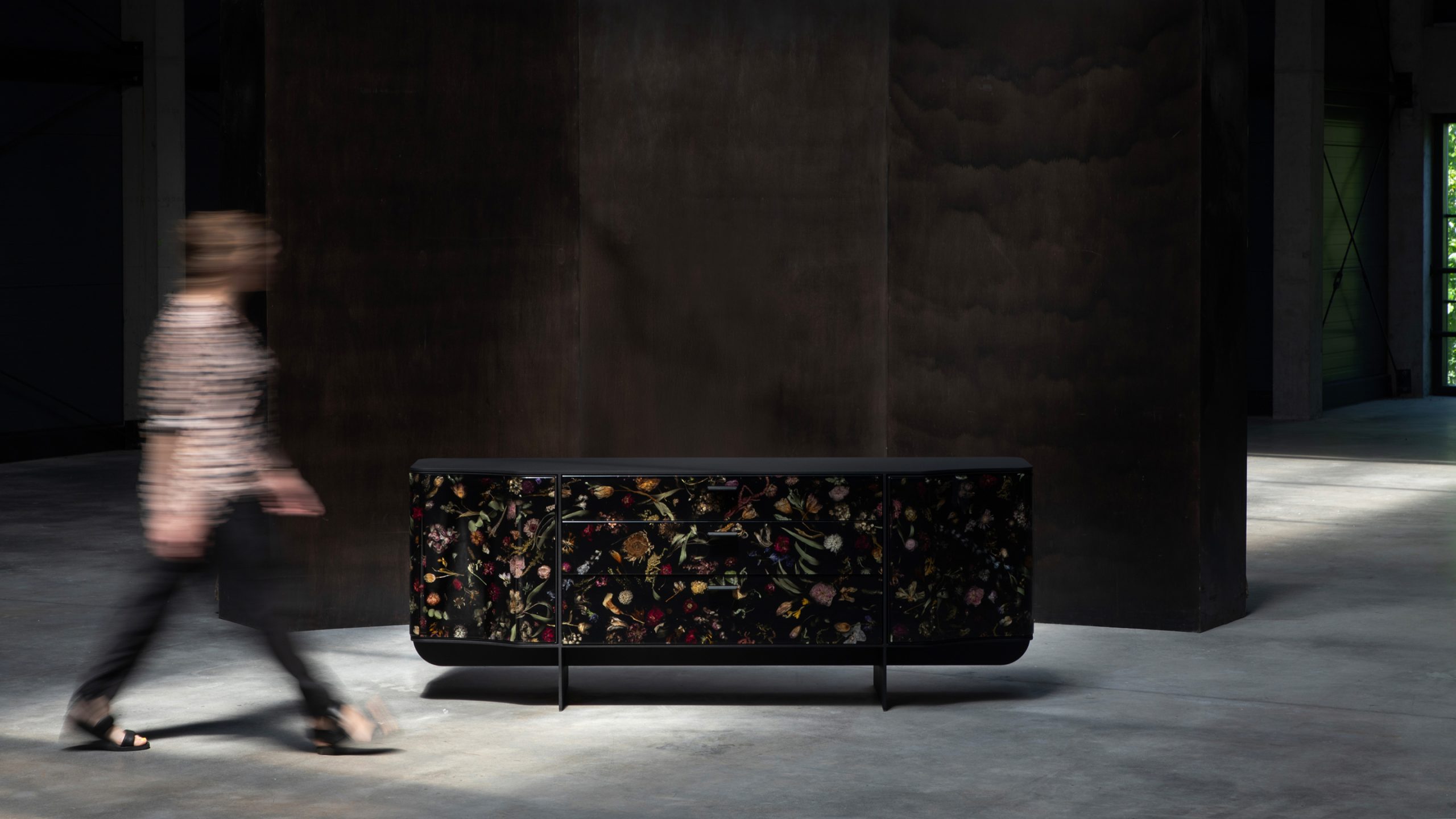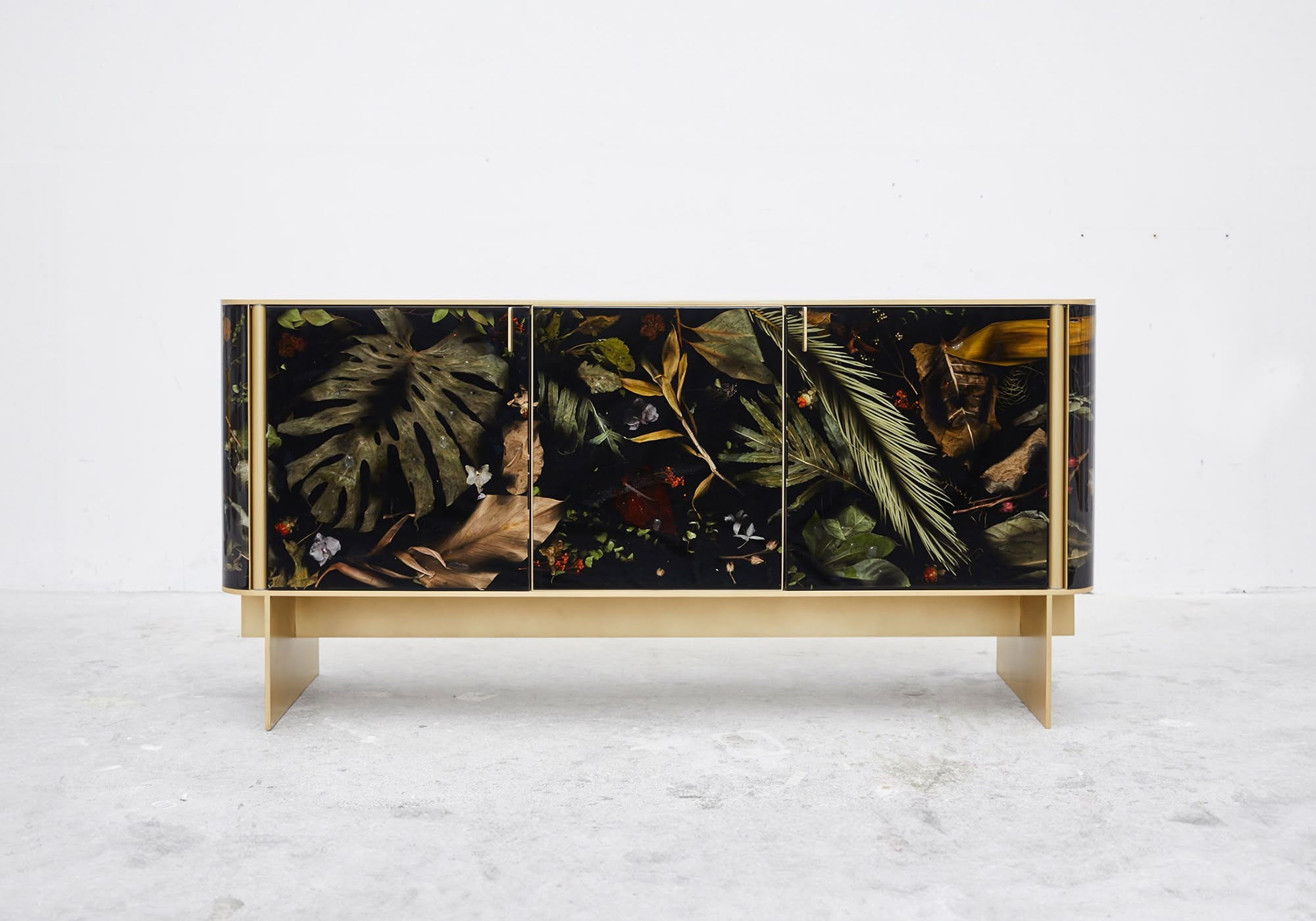 Each Credenza is handmade to order in a labour- and time-consuming process. Everything from collecting and processing the botanical matter, to encapsulating it in cast resin and to setting the material on a handmade wooden or metal frame is done by hand in our studio by our seasoned craftspeople. Thanks to our vast botanical library, each piece features a unique floral composition, where the flowers are chosen for their sculptural shapes, vivid colours, and special significance.