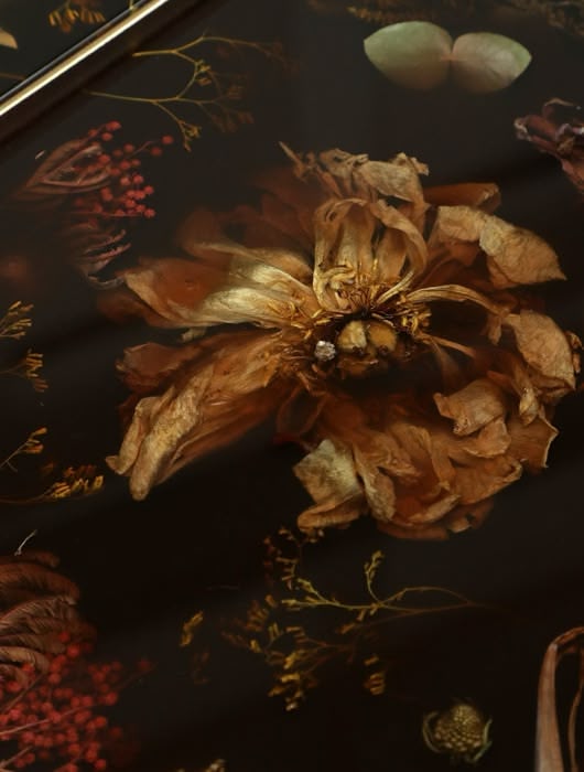Flowers are more than ornament; they are the starting point of every work. Each composition is a framework of meaning — vernacular, drawn from a specific season or landscape; inspired, echoing the atmosphere of an artwork; defined through modes such as field, baroque, classic, or exotic; or rooted in memory, carrying an emotional trace. In every case, the choice of flowers determines the story preserved within the material.