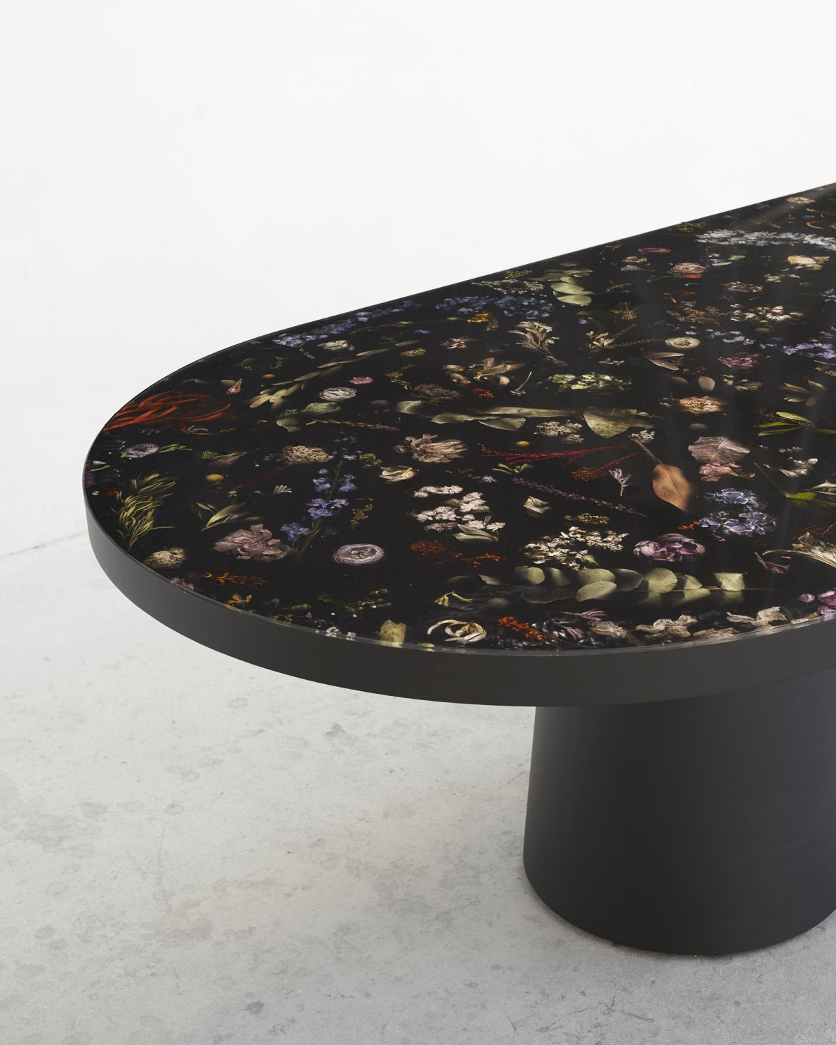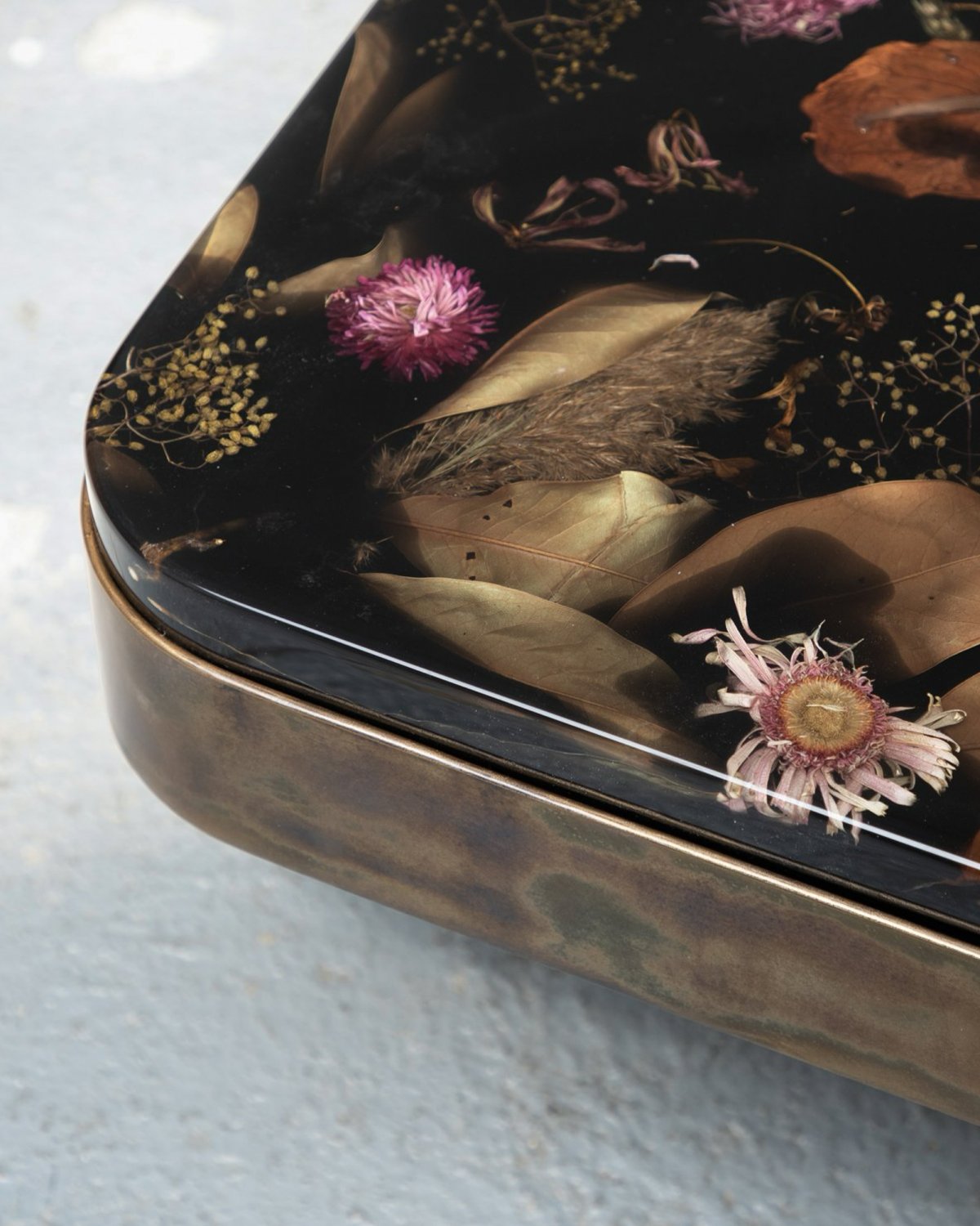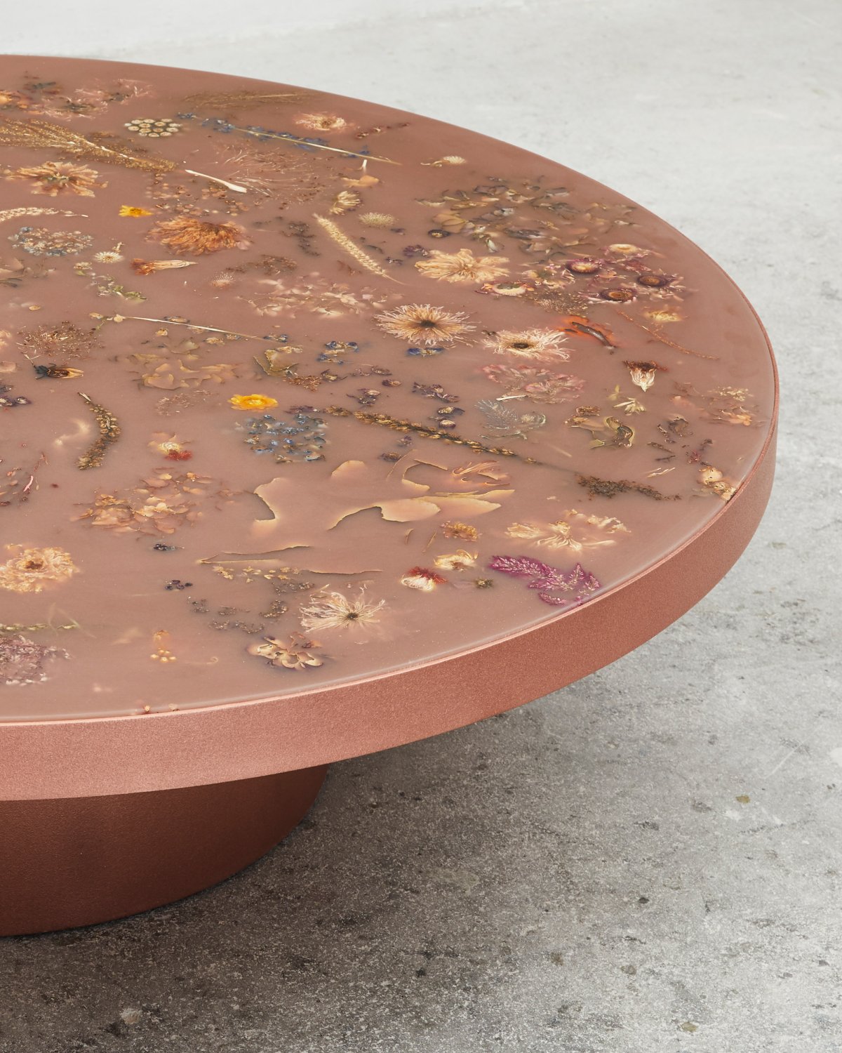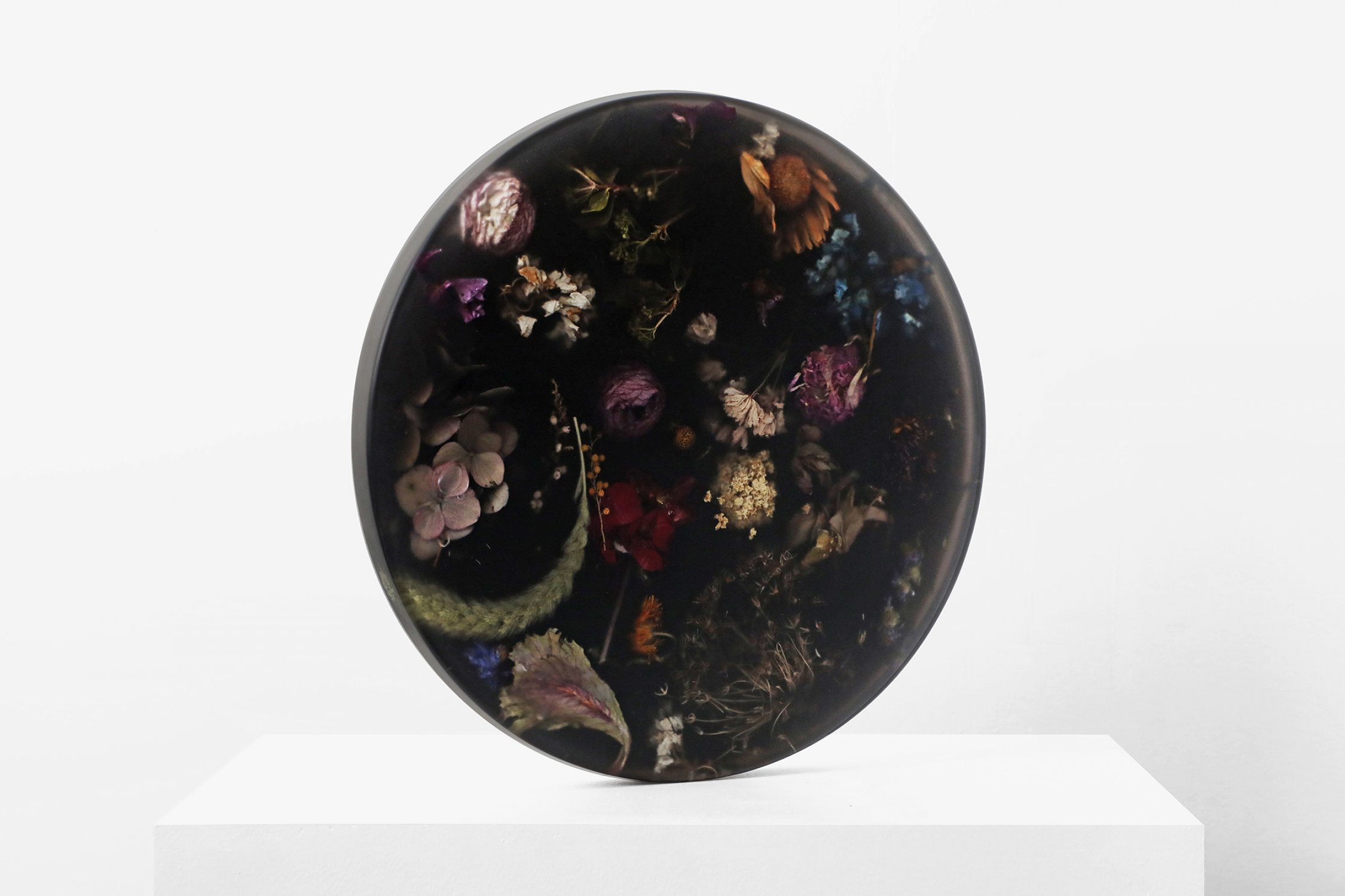 Inspired by the desire to capture and preserve the perishable beauty of flowers, the Flora material combines natural material with resin to create functional and decorative objects that are both durable and timeless. The material acquires a special depth and the flowers infused in the resin float under a shiny surface. Everything from collecting and processing the botanic matter, encapsulating it in cast resin, to setting the material is done by hand in our studio.
