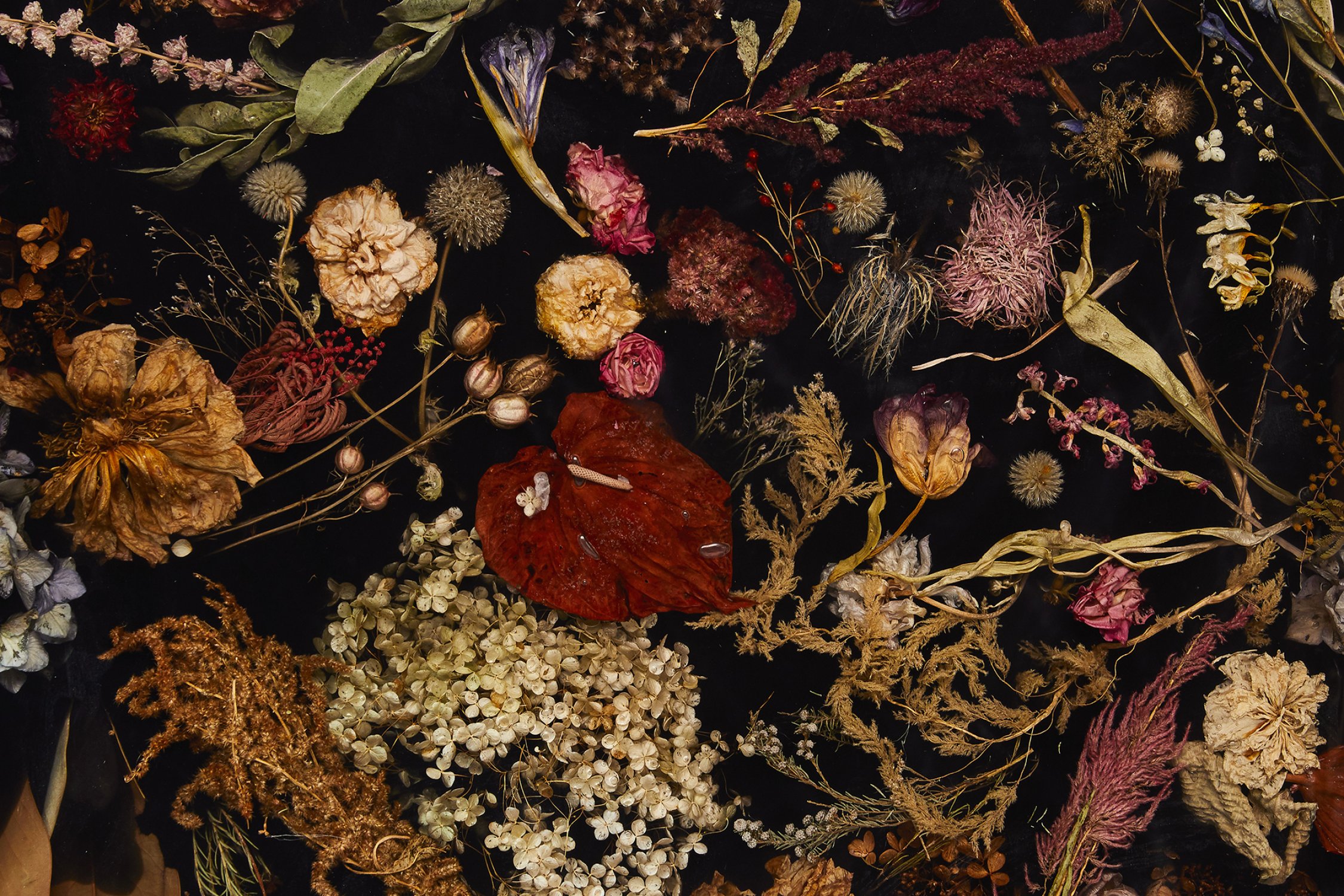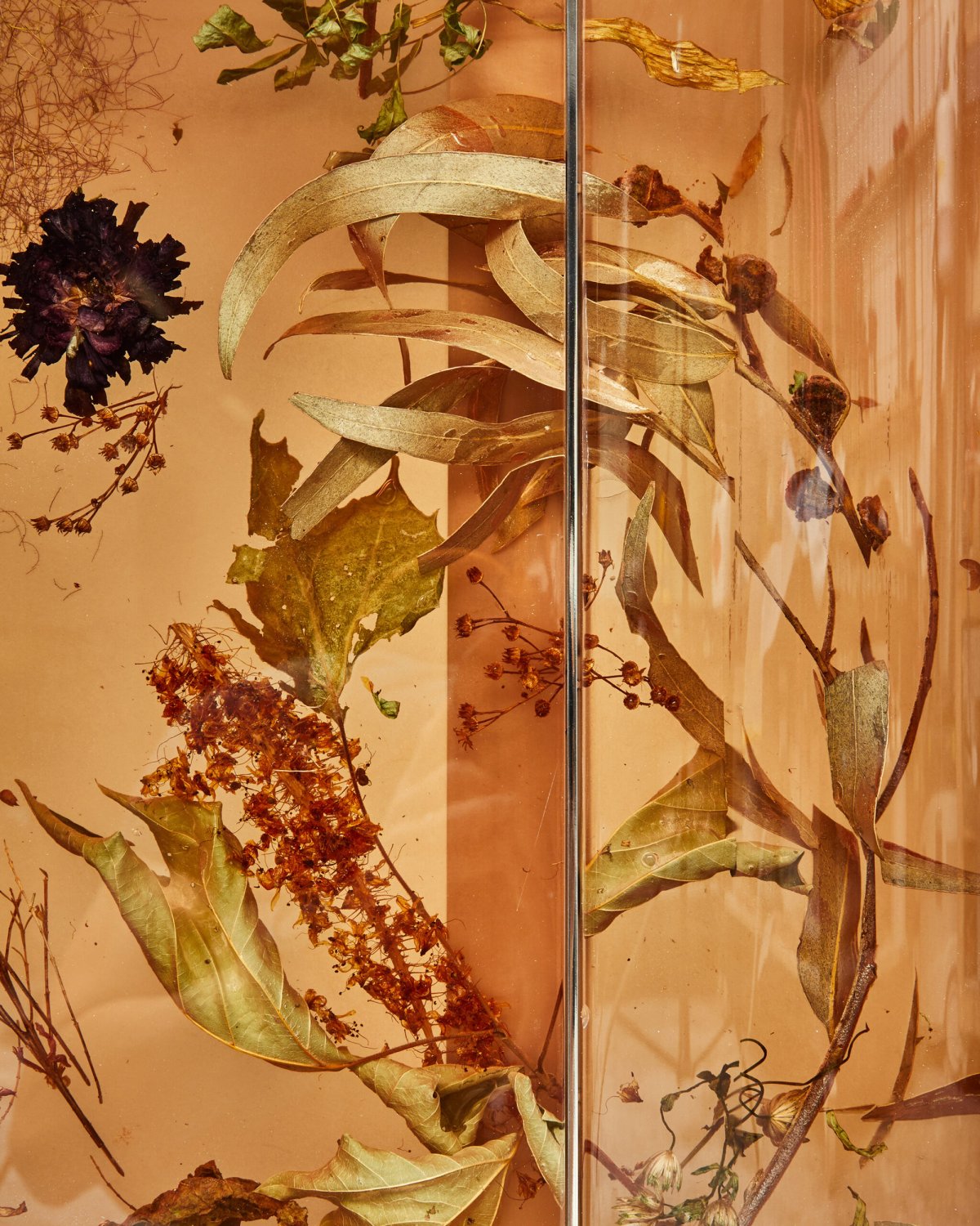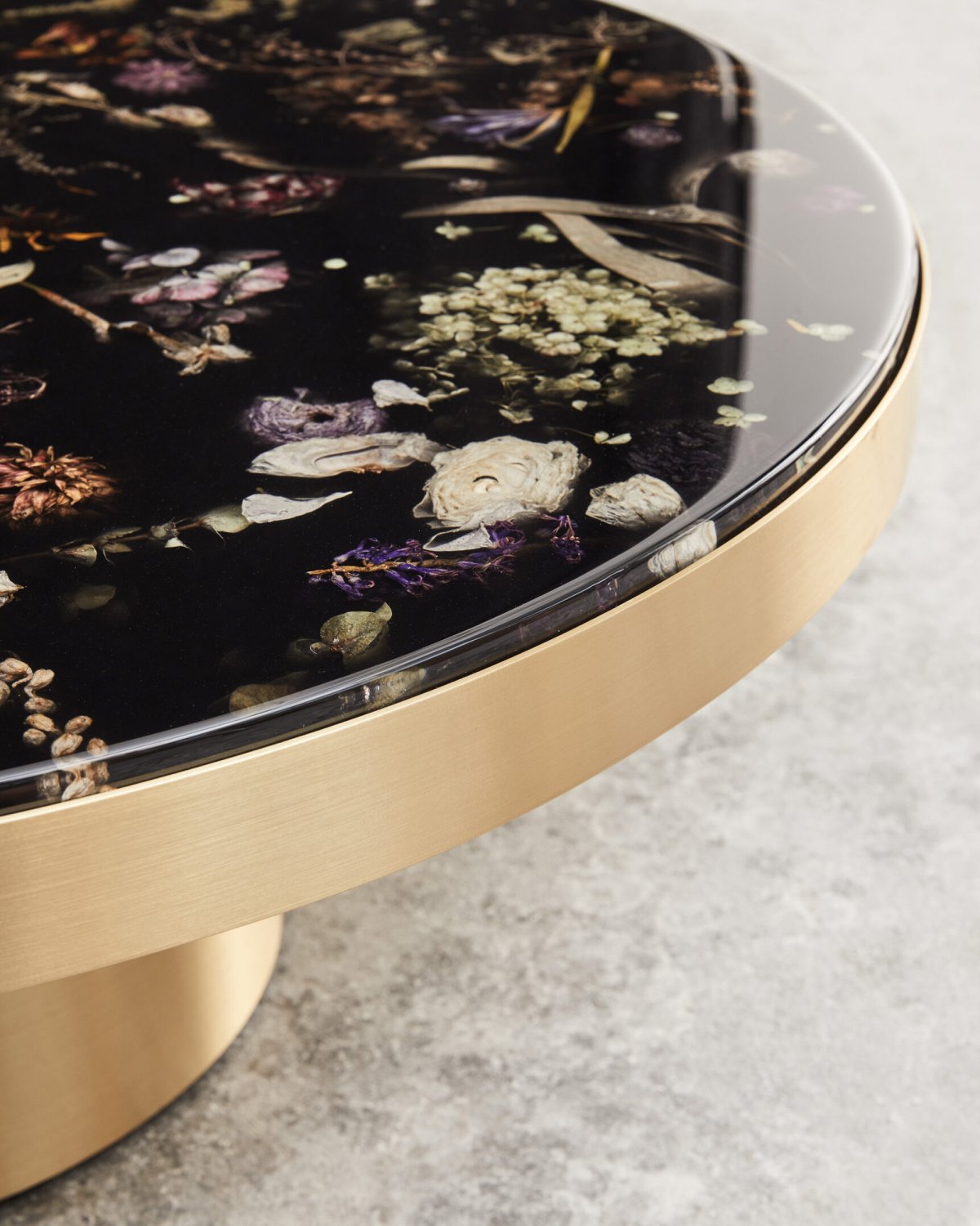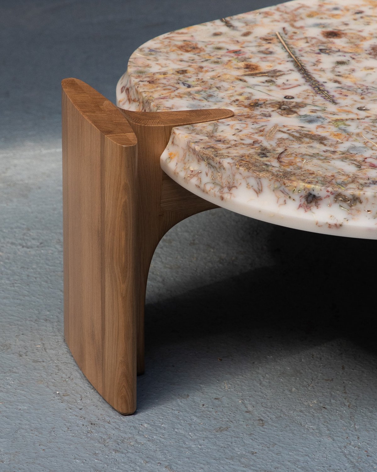 Inspired by the desire to capture and preserve the perishable beauty of flowers, the Flora material combines natural material with resin to create functional and decorative objects that are both durable and timeless. The material acquires a special depth and the flowers infused in the resin float under a shiny surface. Everything from collecting and processing the botanic matter, encapsulating it in cast resin, to setting the material is done by hand in our studio.