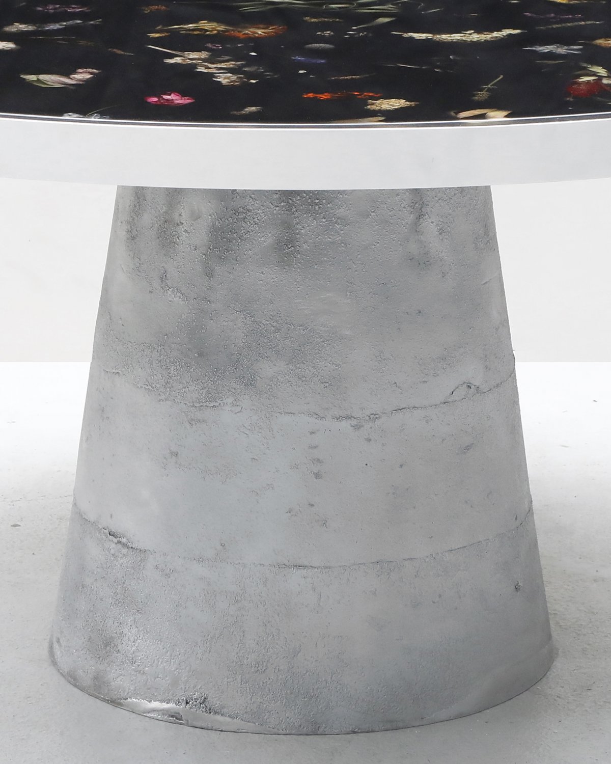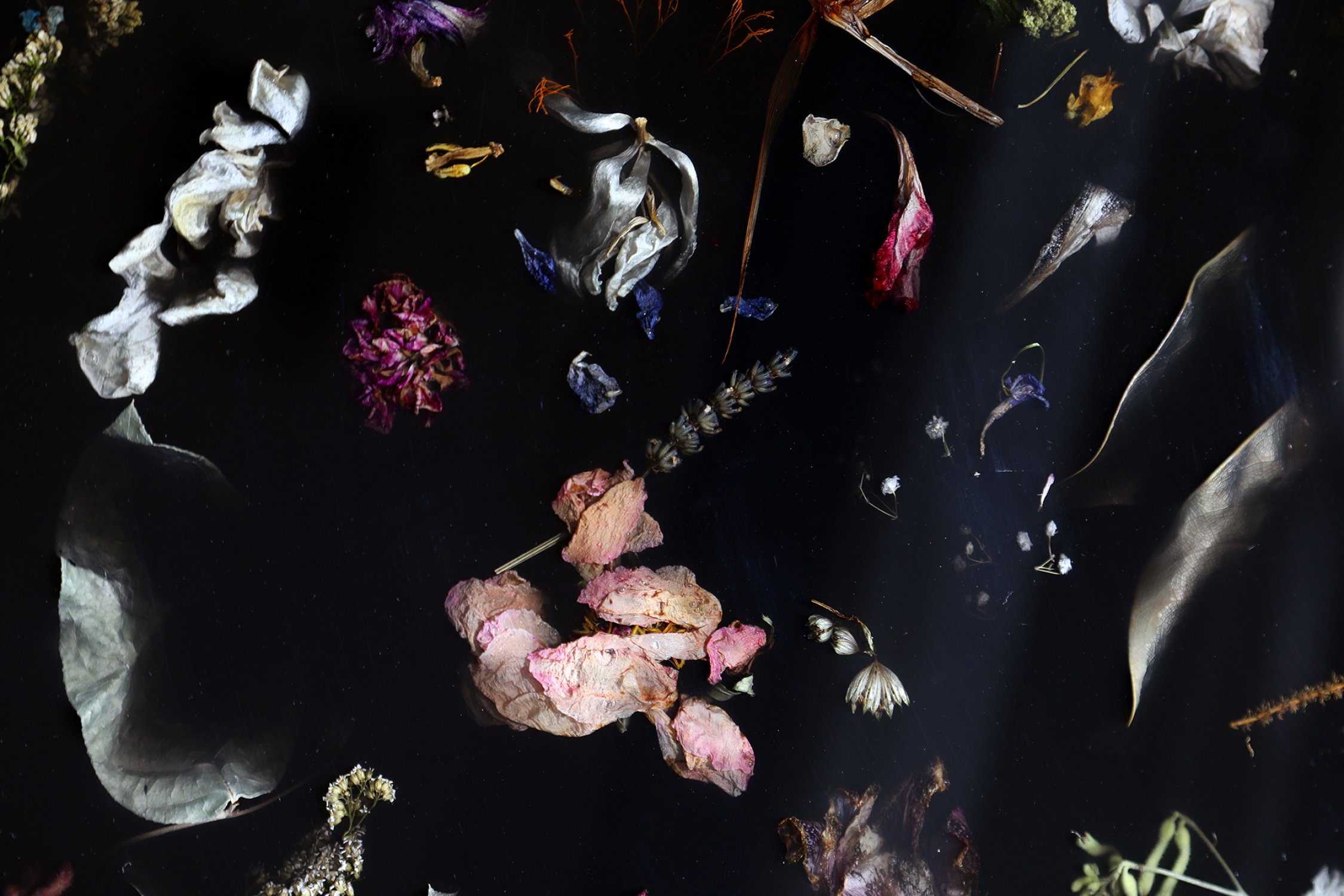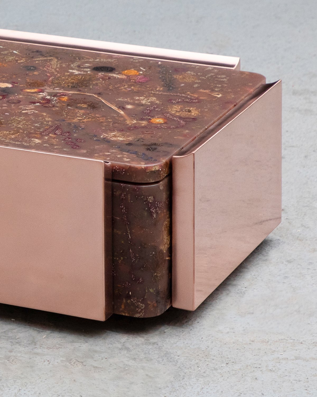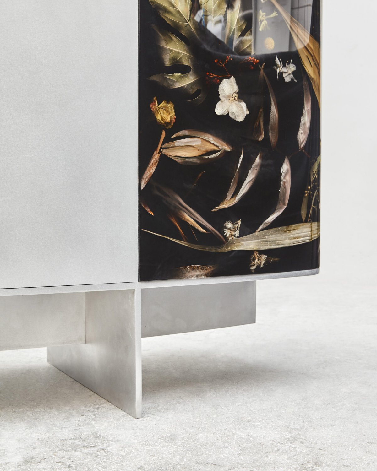 Inspired by the desire to capture and preserve the perishable beauty of flowers, the Flora material combines natural material with resin to create functional and decorative objects that are both durable and timeless. The material acquires a special depth and the flowers infused in the resin float under a shiny surface. Everything from collecting and processing the botanic matter, encapsulating it in cast resin, to setting the material is done by hand in our studio.