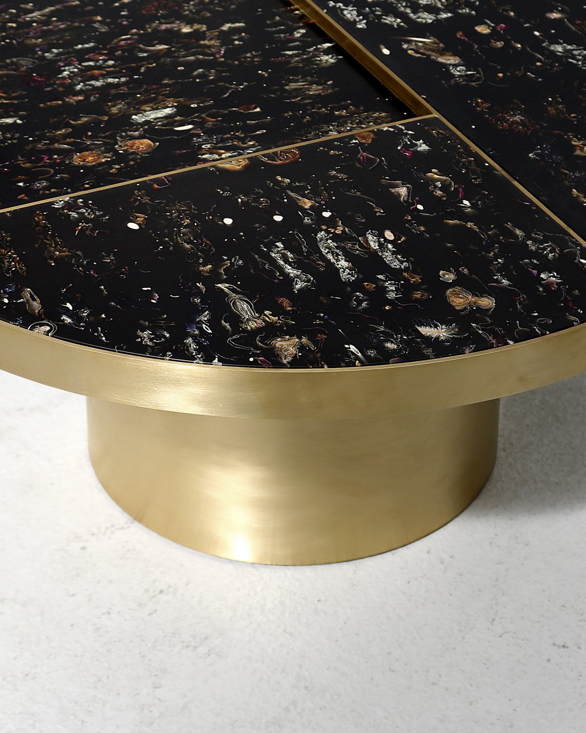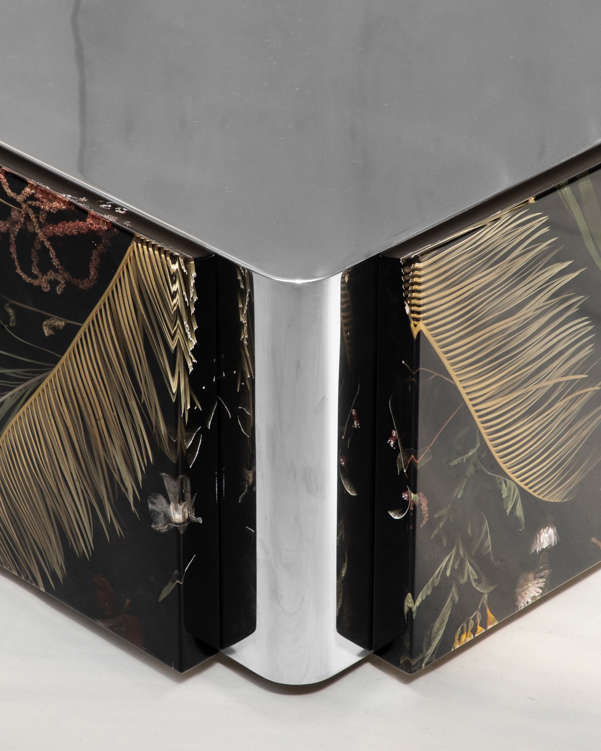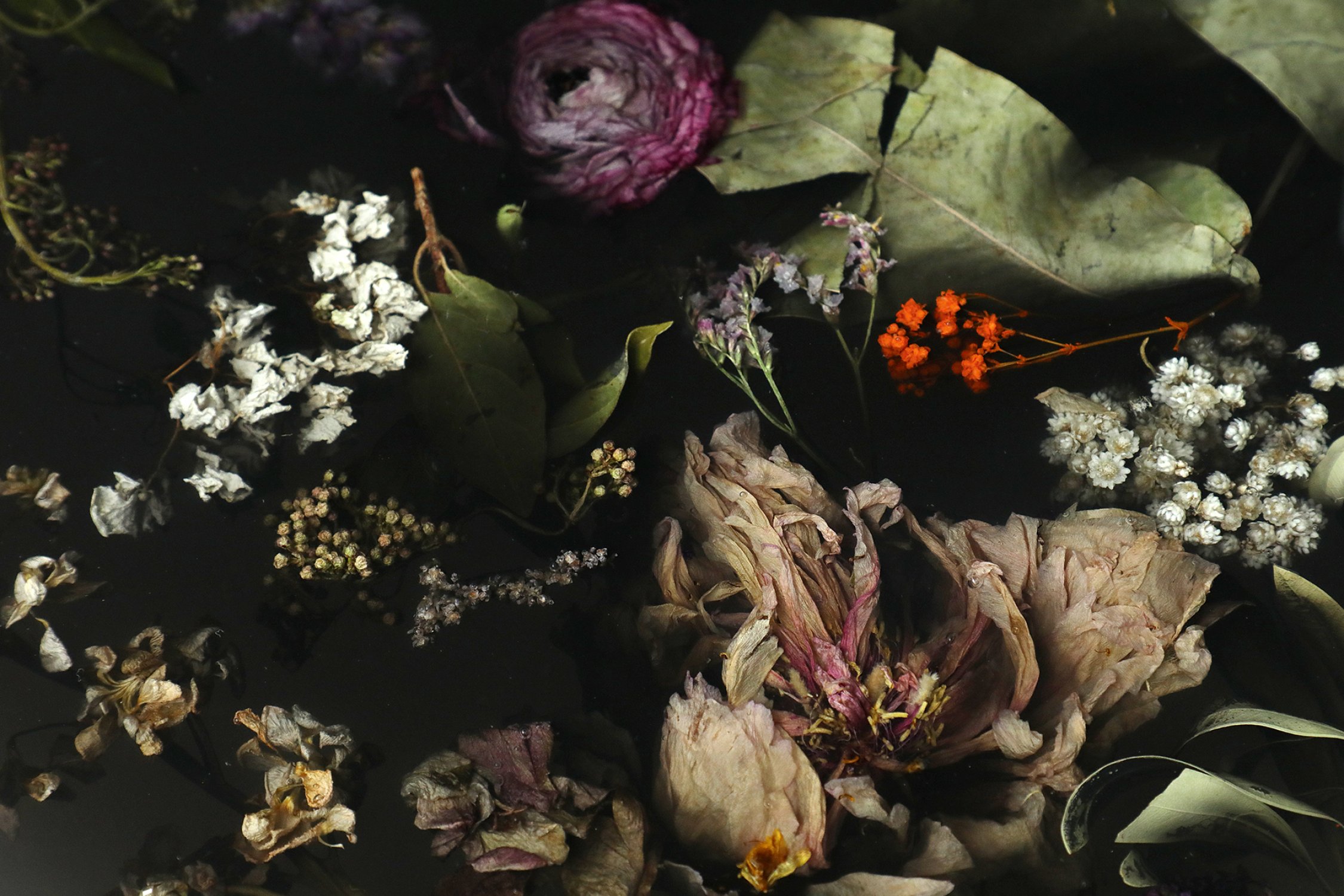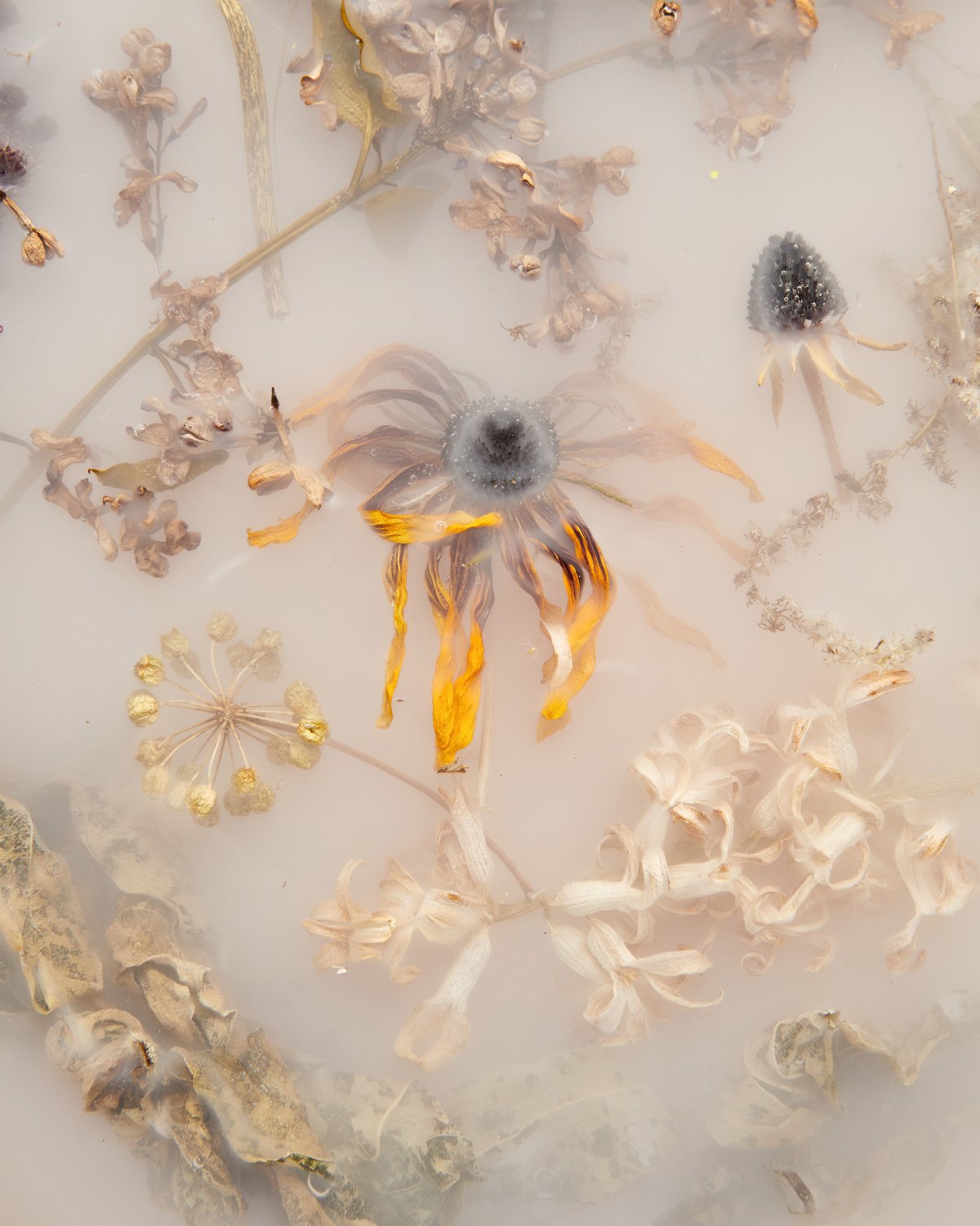 Inspired by the desire to capture and preserve the perishable beauty of flowers, the Flora material combines natural material with resin to create functional and decorative objects that are both durable and timeless. The material acquires a special depth and the flowers infused in the resin float under a shiny surface. Everything from collecting and processing the botanic matter, encapsulating it in cast resin, to setting the material is done by hand in our studio.
