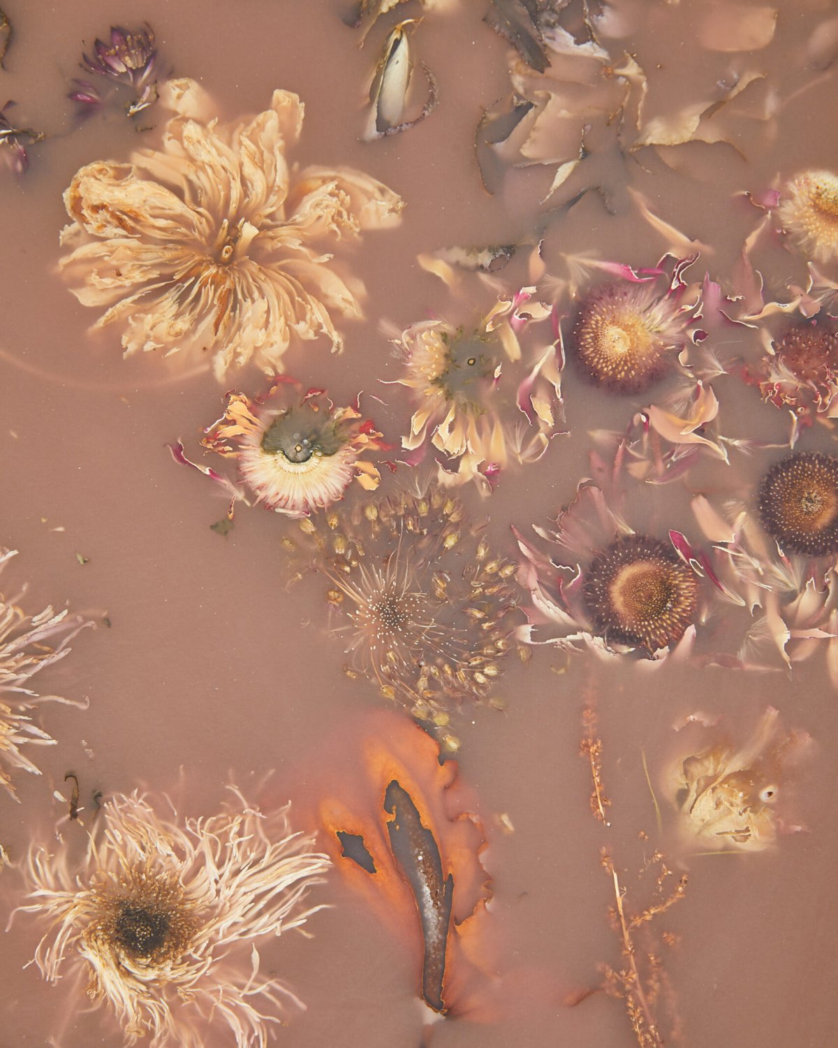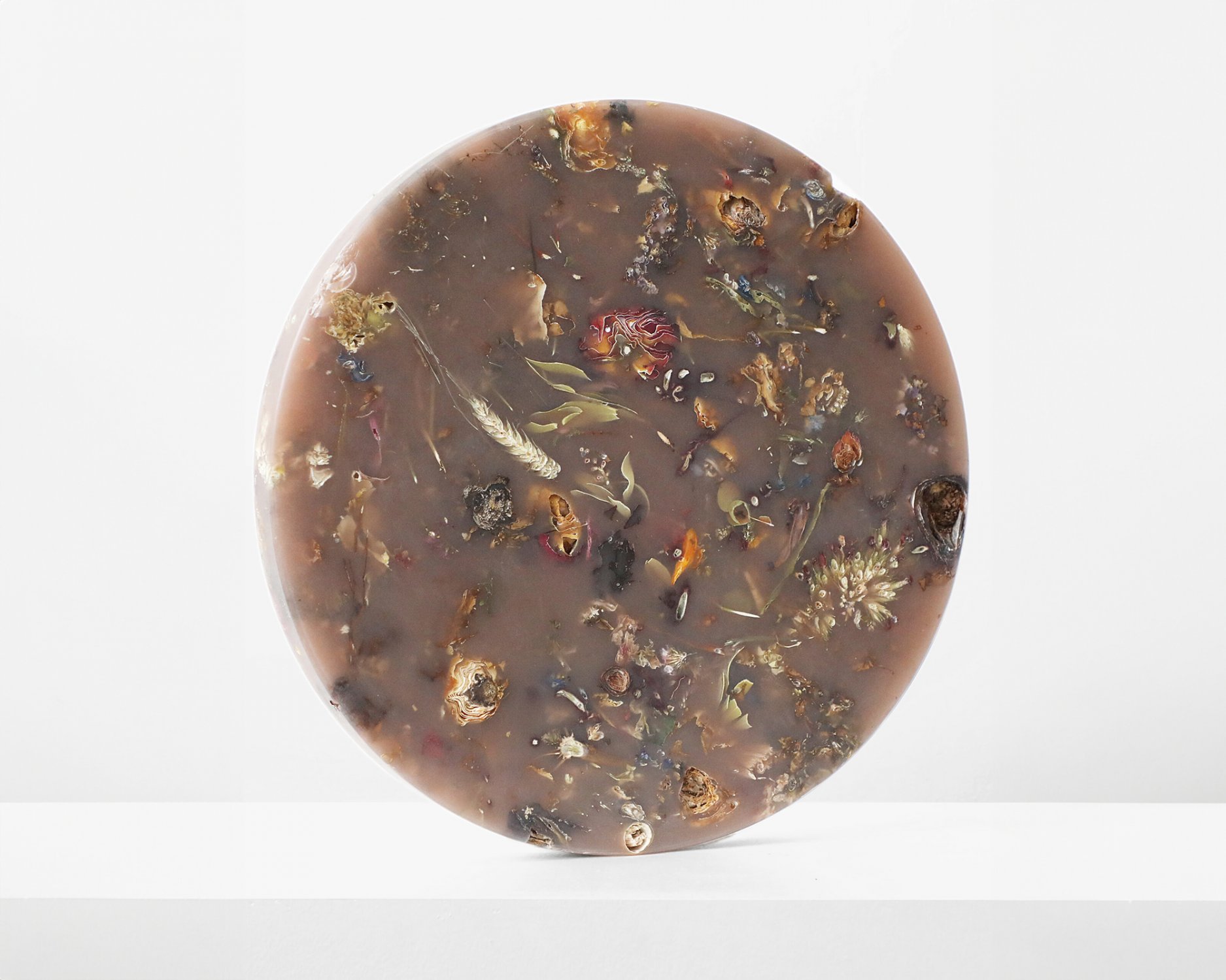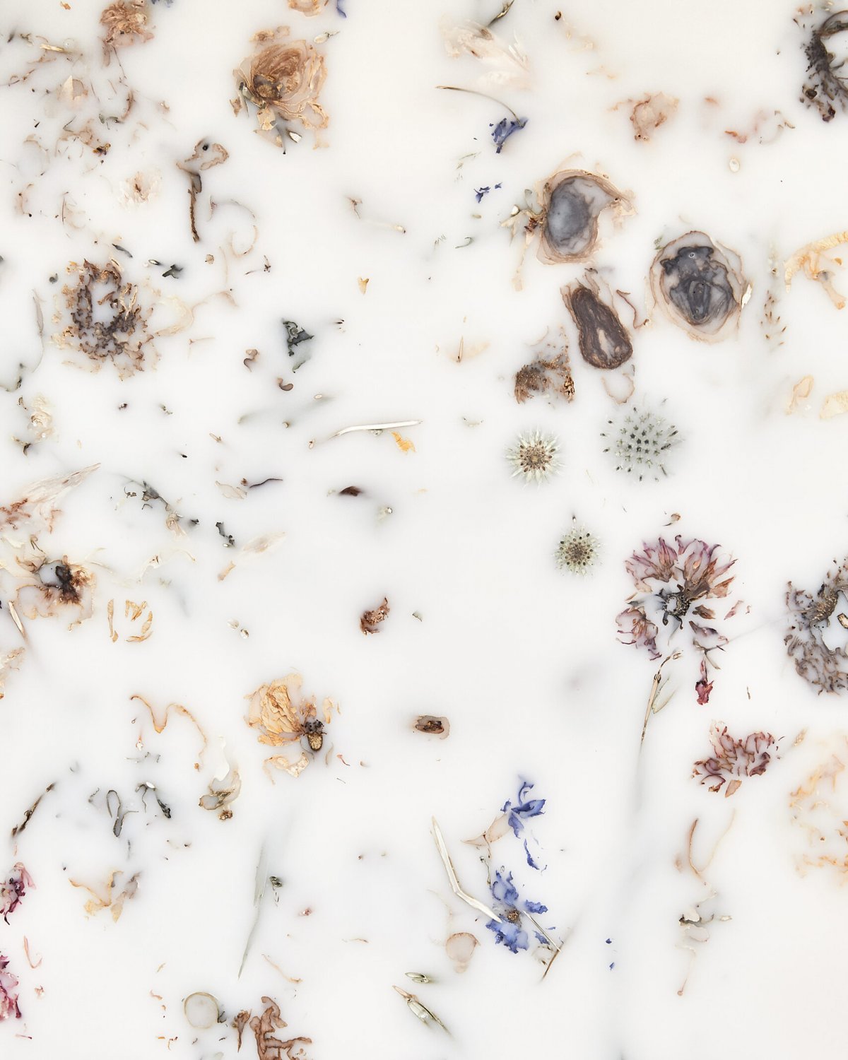 The sculptural nature of Perma comes from cutting the material as if it was natural stone. Here, the decoration is not interpreted but comes from nature itself. Contrasted with resin, the flowers, “frozen in time” and machined to reveal the complexity found in the cross-section of the flowers, the curve of petals, and the structure of leaves, appear as veins or fossils creating an almost stone-like quality.
