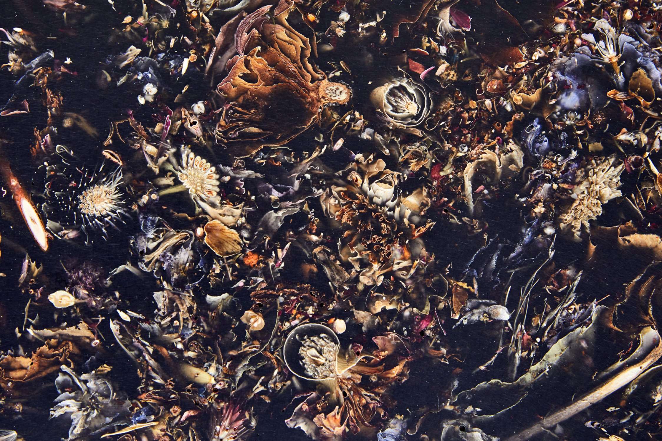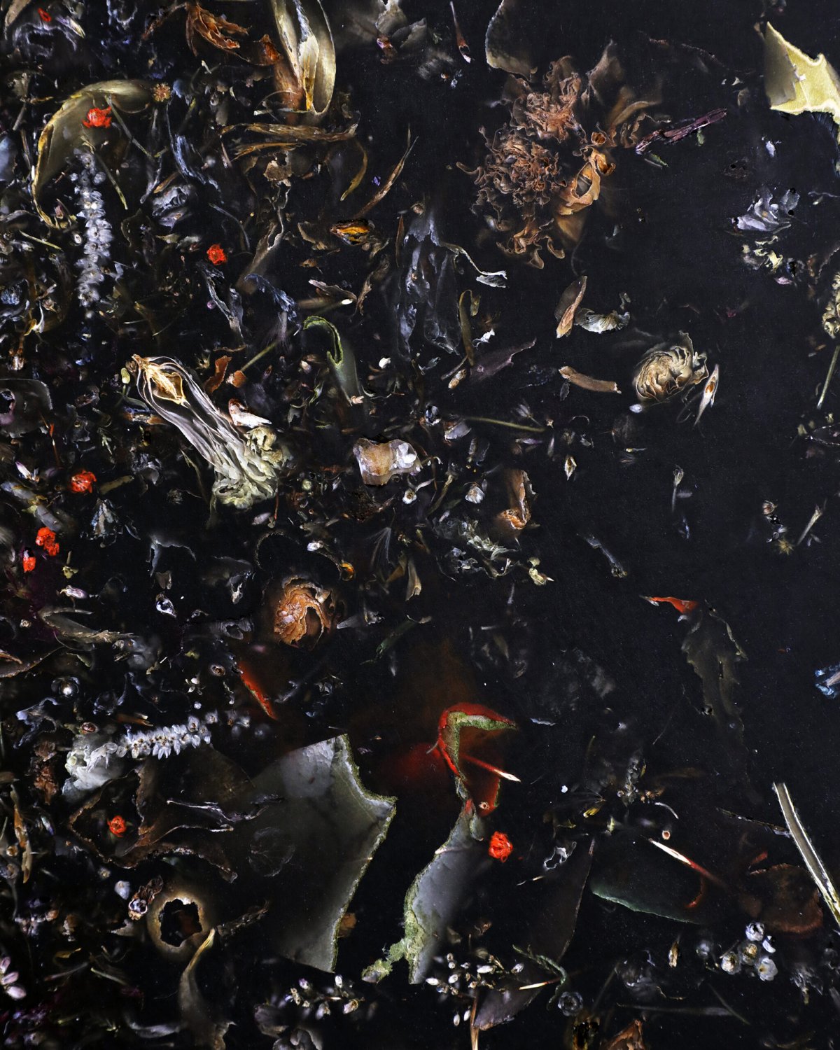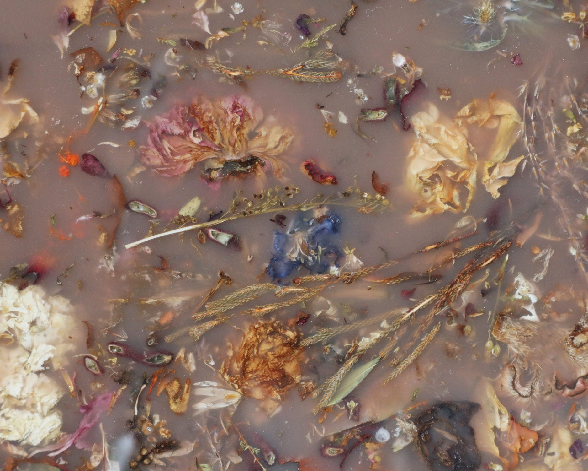 The sculptural nature of Perma comes from cutting the material as if it was natural stone. Here, the decoration is not interpreted but comes from nature itself. Contrasted with resin, the flowers, “frozen in time” and machined to reveal the complexity found in the cross-section of the flowers, the curve of petals, and the structure of leaves, appear as veins or fossils creating an almost stone-like quality.