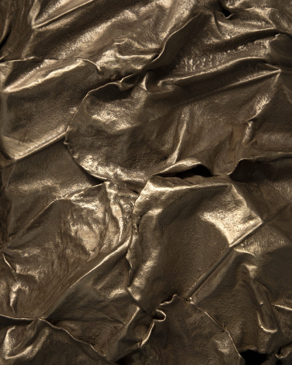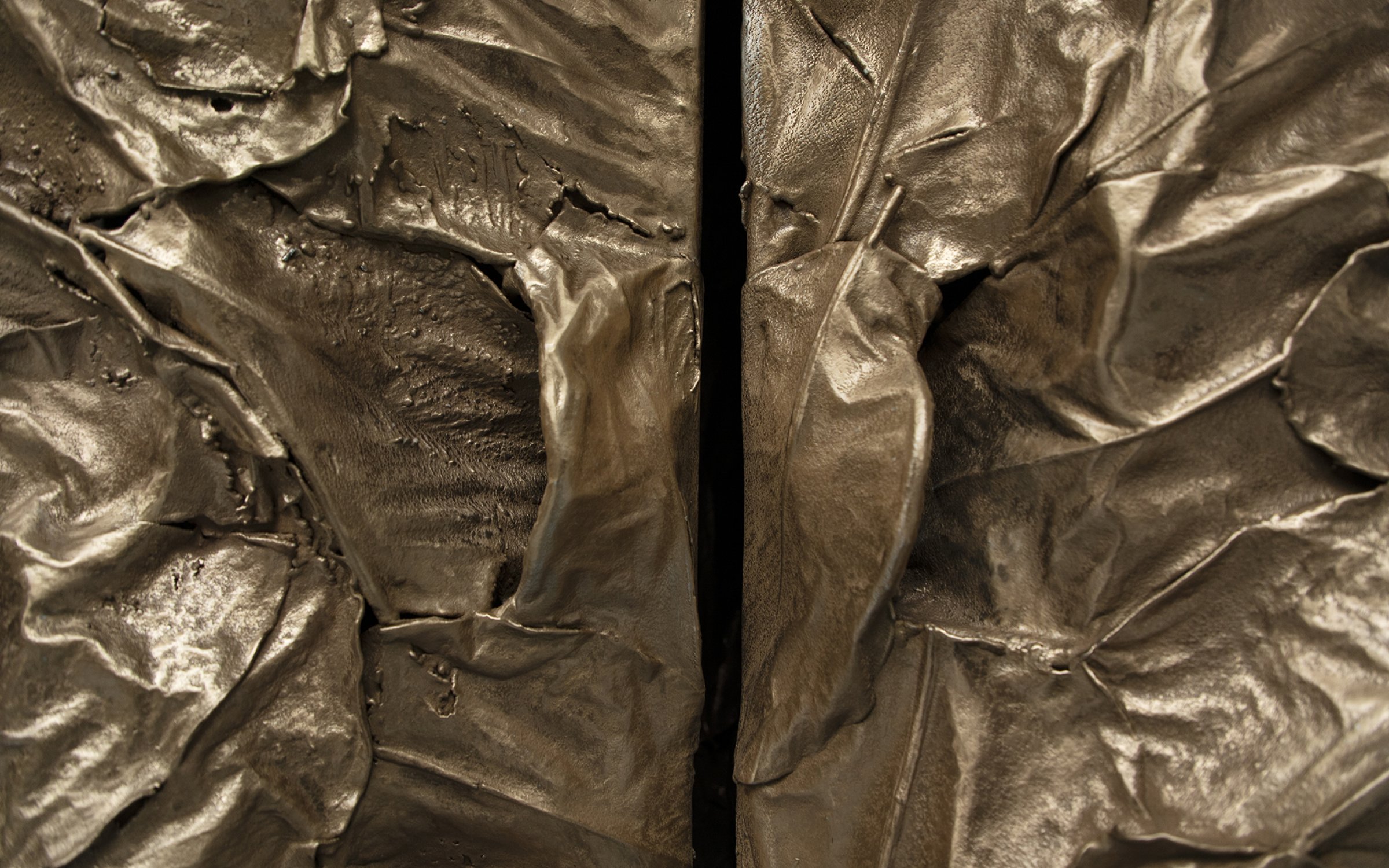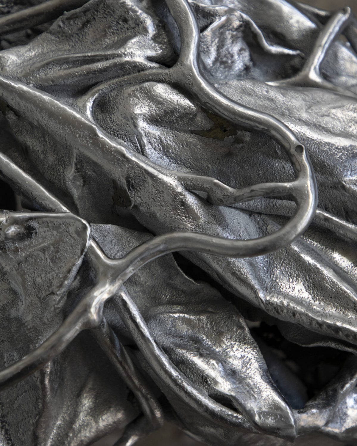 Balancing between fragility and rigidity, metal and exotic leaves are combined to make opposing processes — life and death, renewal and decay — evident. A load-bearing structure, formed by hand using welded steel, evokes organic shapes and ornate antique furnishings. The entire sculpture is then coated in zinc or bronze using a thermo-coating process, which permanently encases the leaves within a thin metal shell.