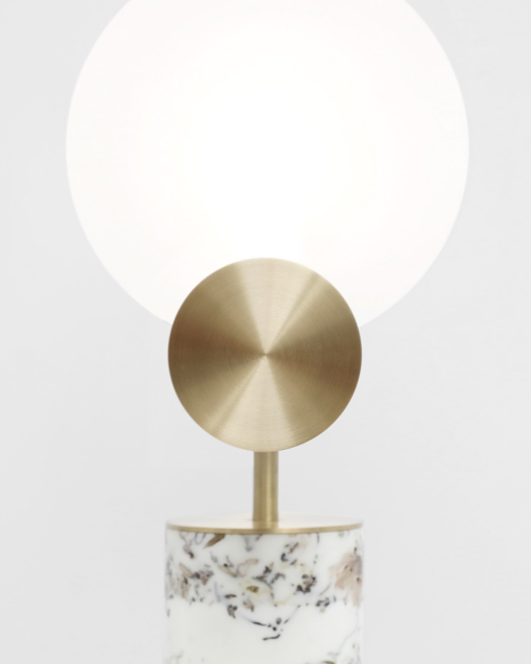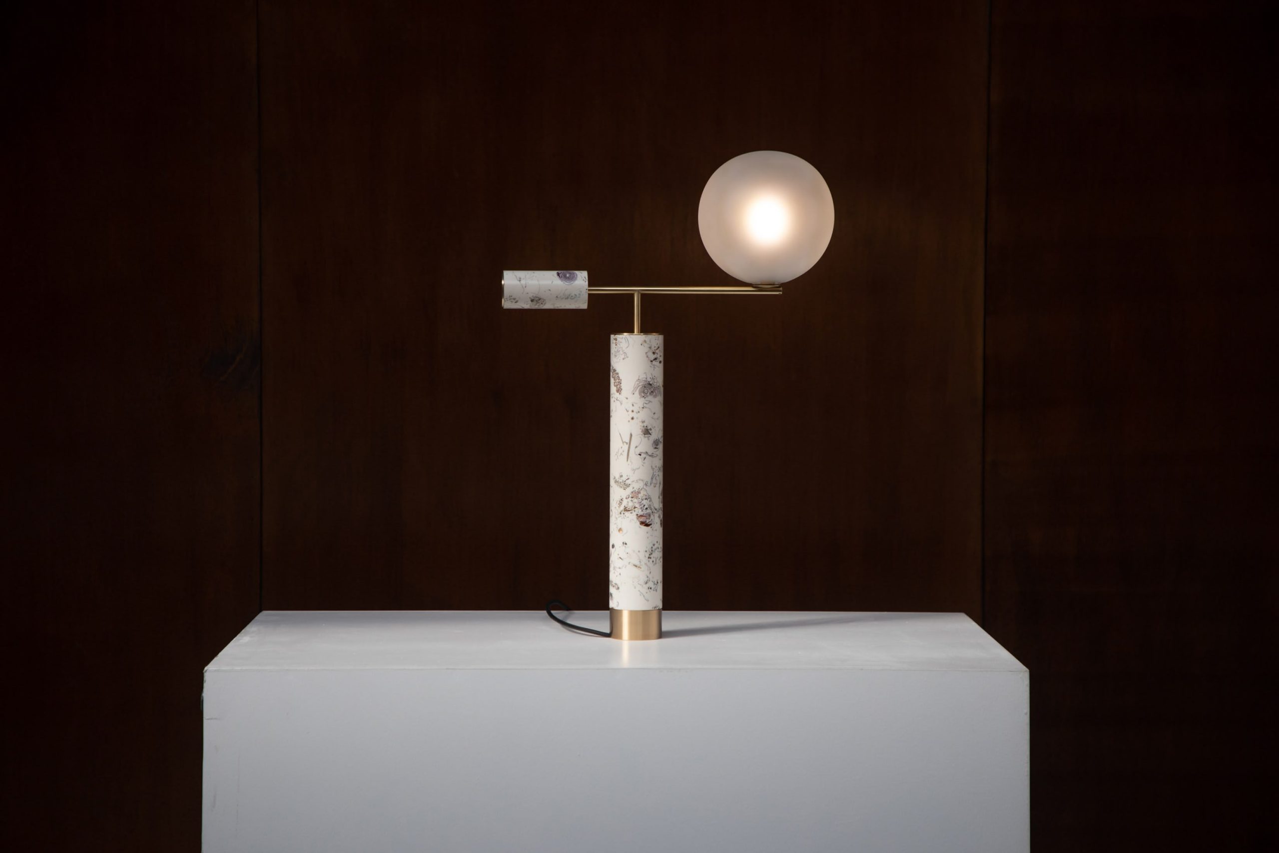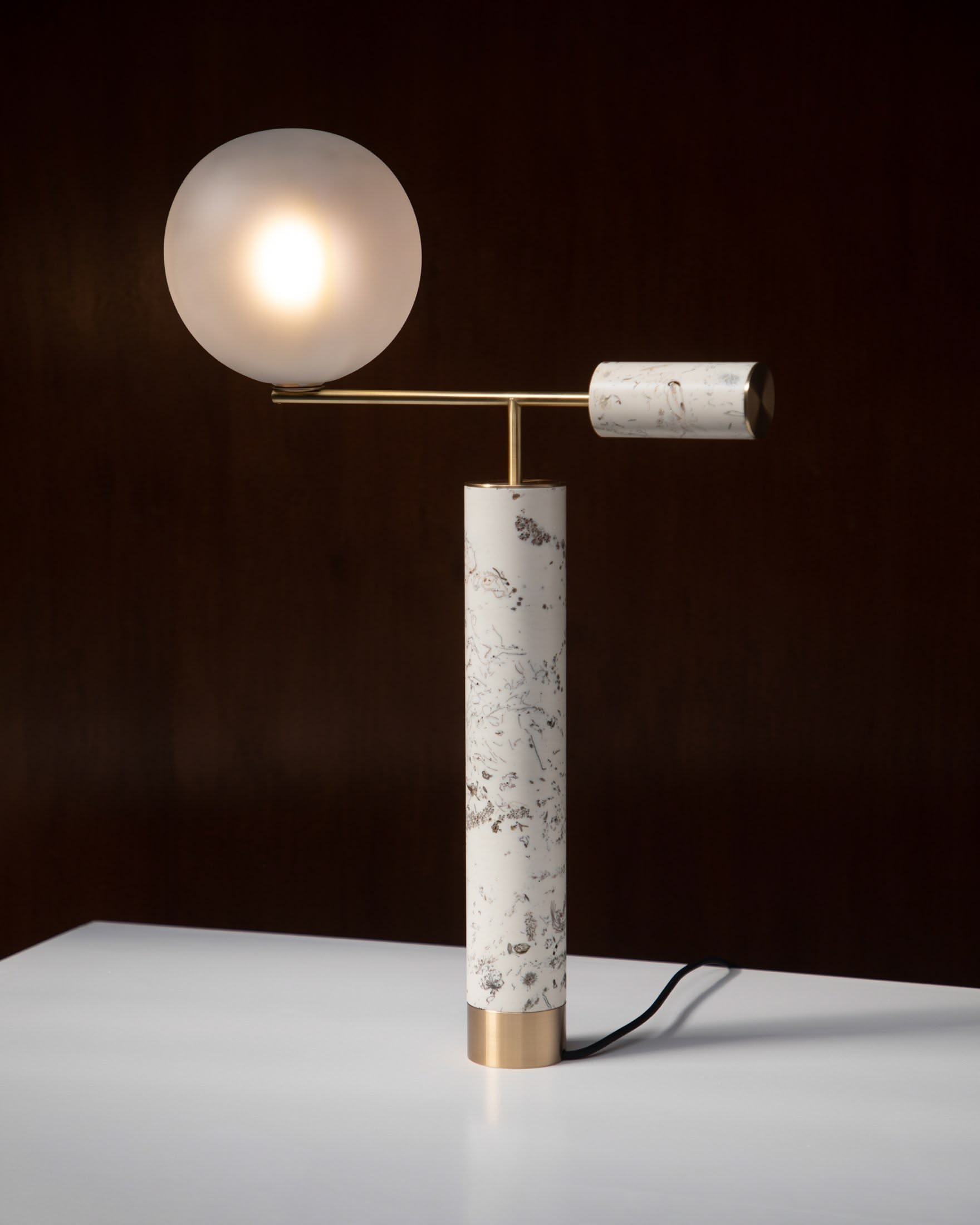 Composed of brass, glass, and our unique Flora Perma material, the Flora Lamp I offers a balanced composition of geometric cantilevered shapes. A glass globe offsets the body, offering a soft dimmable light source. The Perma material reveals intricate botanical patterns achieved by cutting the material lengthwise, highlighting the architectural anatomy of buds, petals, and stems. Contrasted with resin, they appear as veins or fossils creating an almost stone-like quality. Finished in matte white Flora Perma, brushed brass and mouthblown, sandblasted glass.