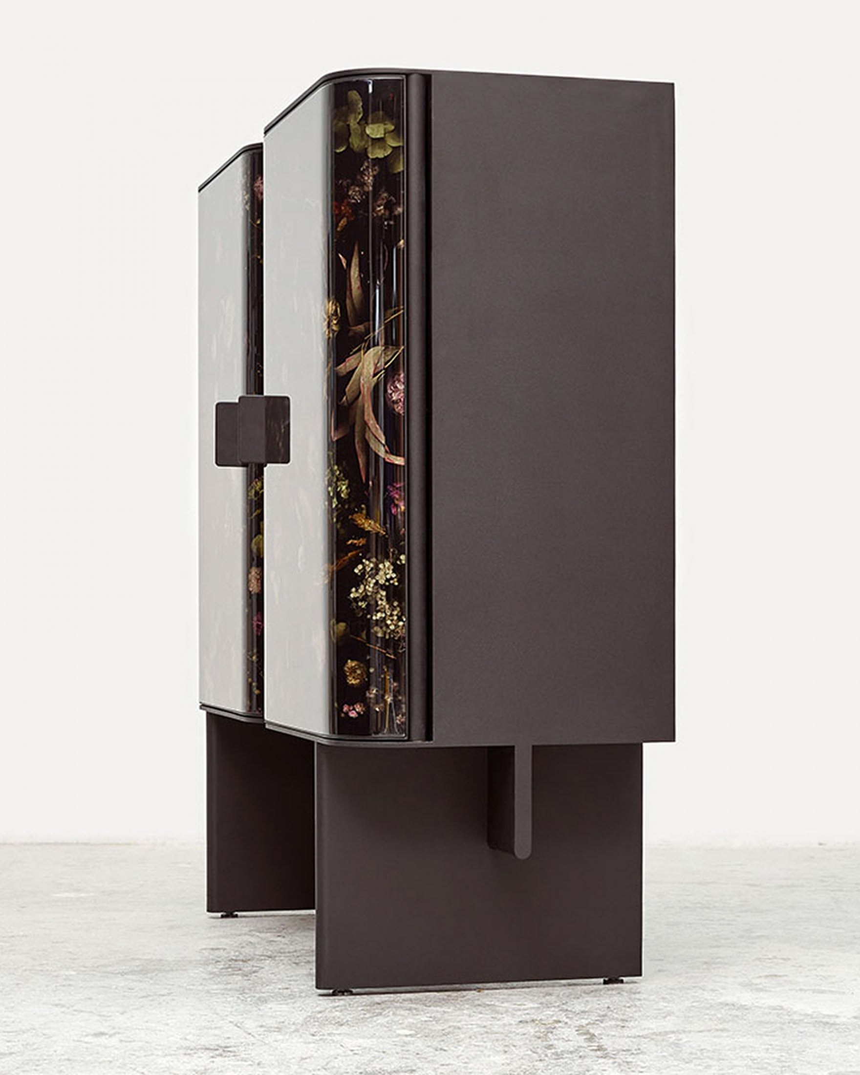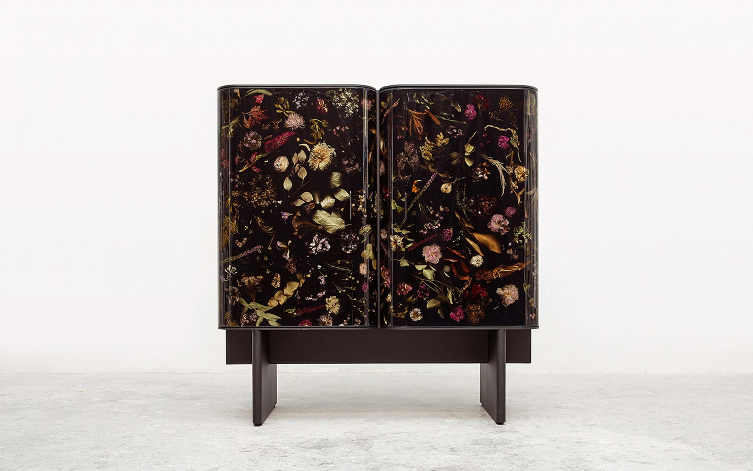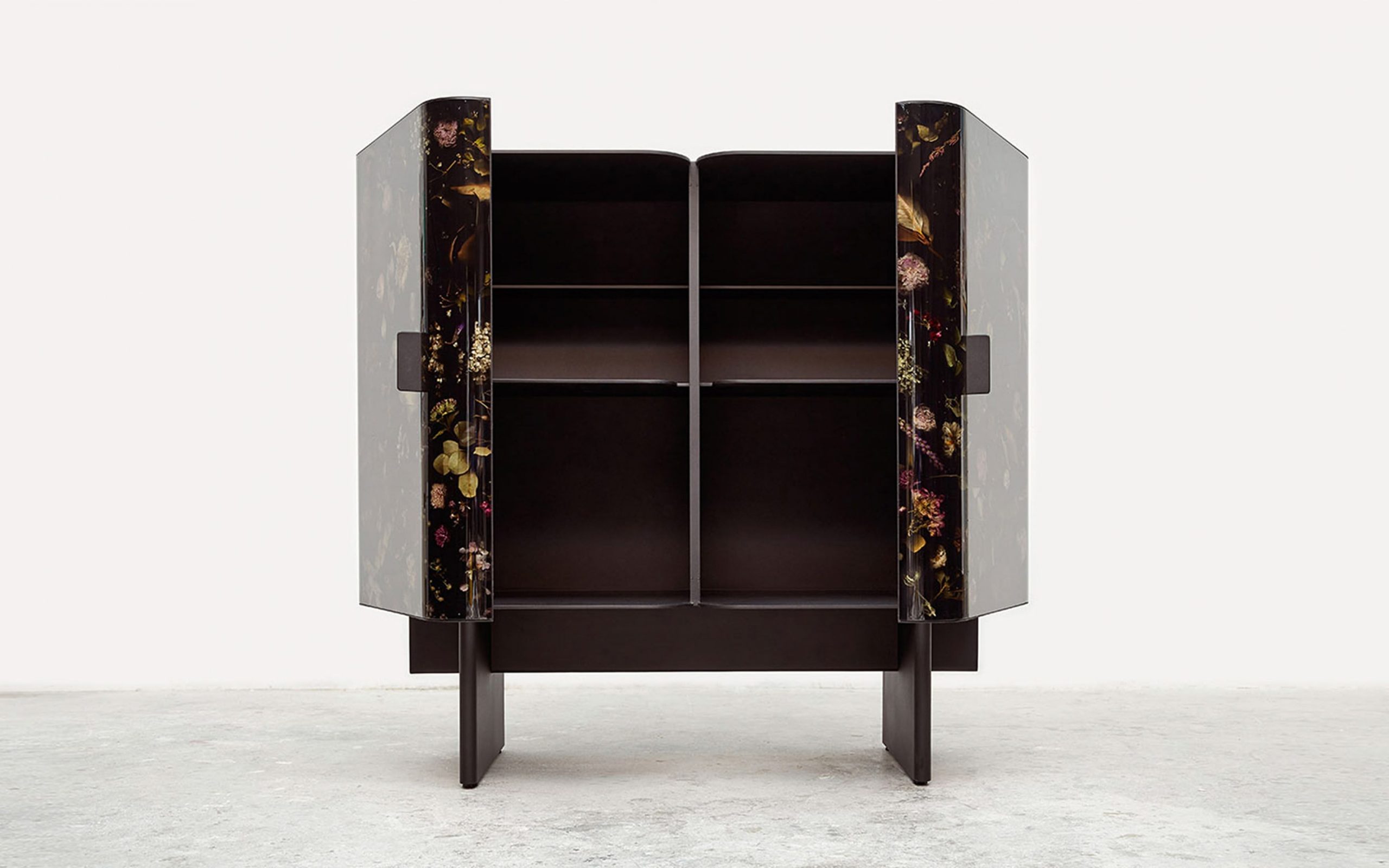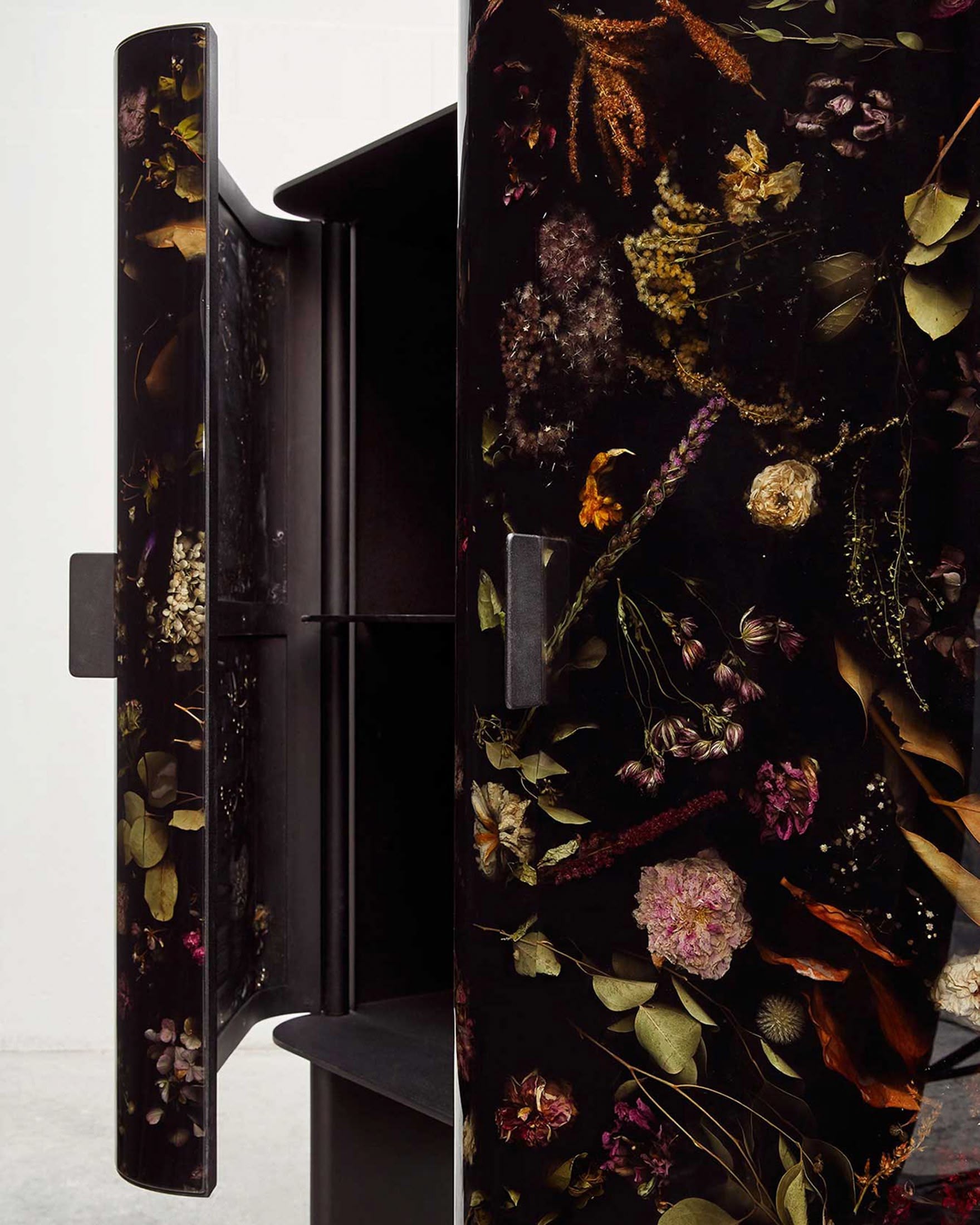 Characterised by elegantly rounded corners and supported by intersecting steel planes, the Flora Cabinet 140 features our unique Flora Temporaria Black in a polished finish, with a floral composition reminiscent of Flemish still lifes or a dark pond with foliage sitting beneath the water’s surface.