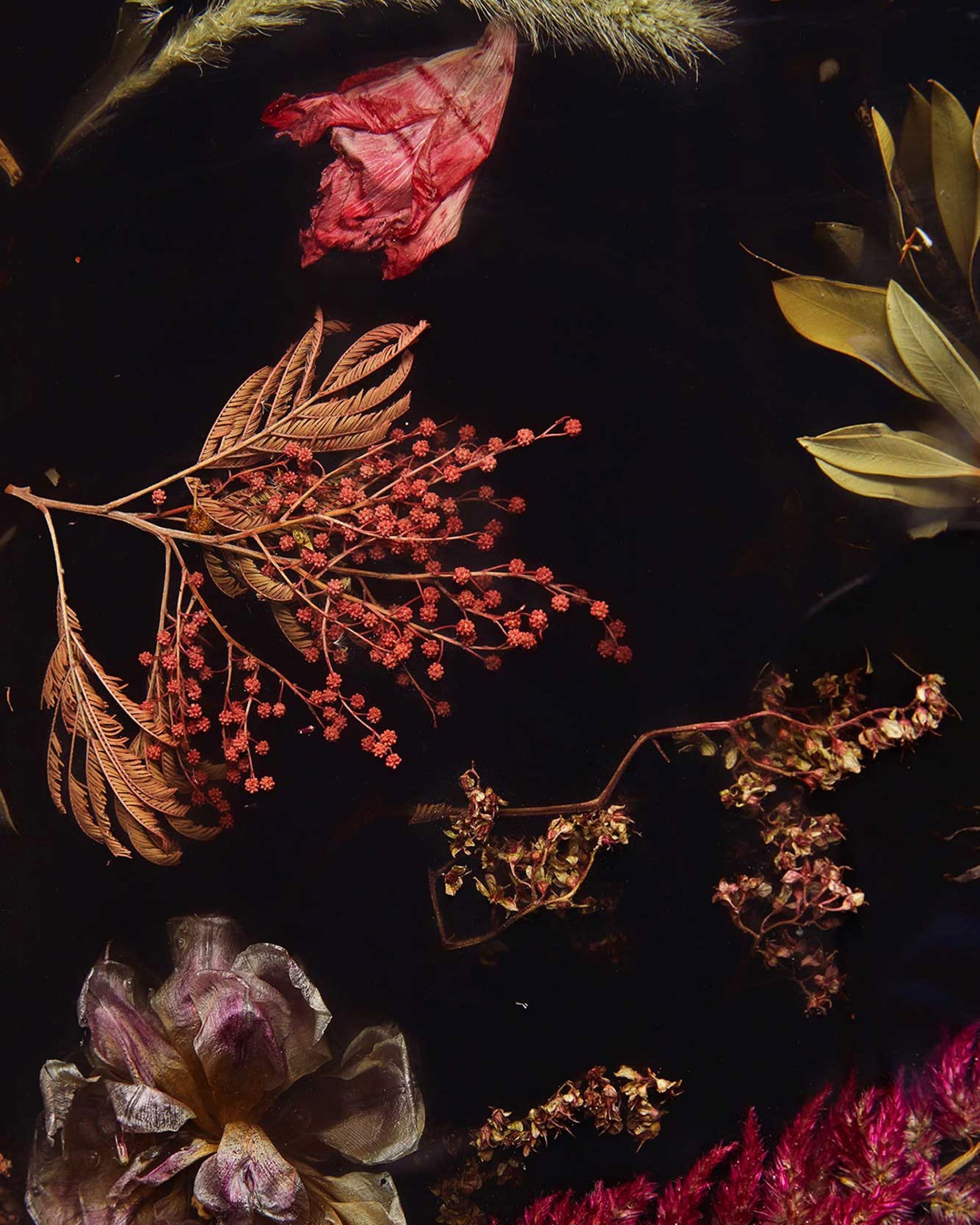 Selected and processed real flowers and leaves, resin, black matte textured powder-coated steel.