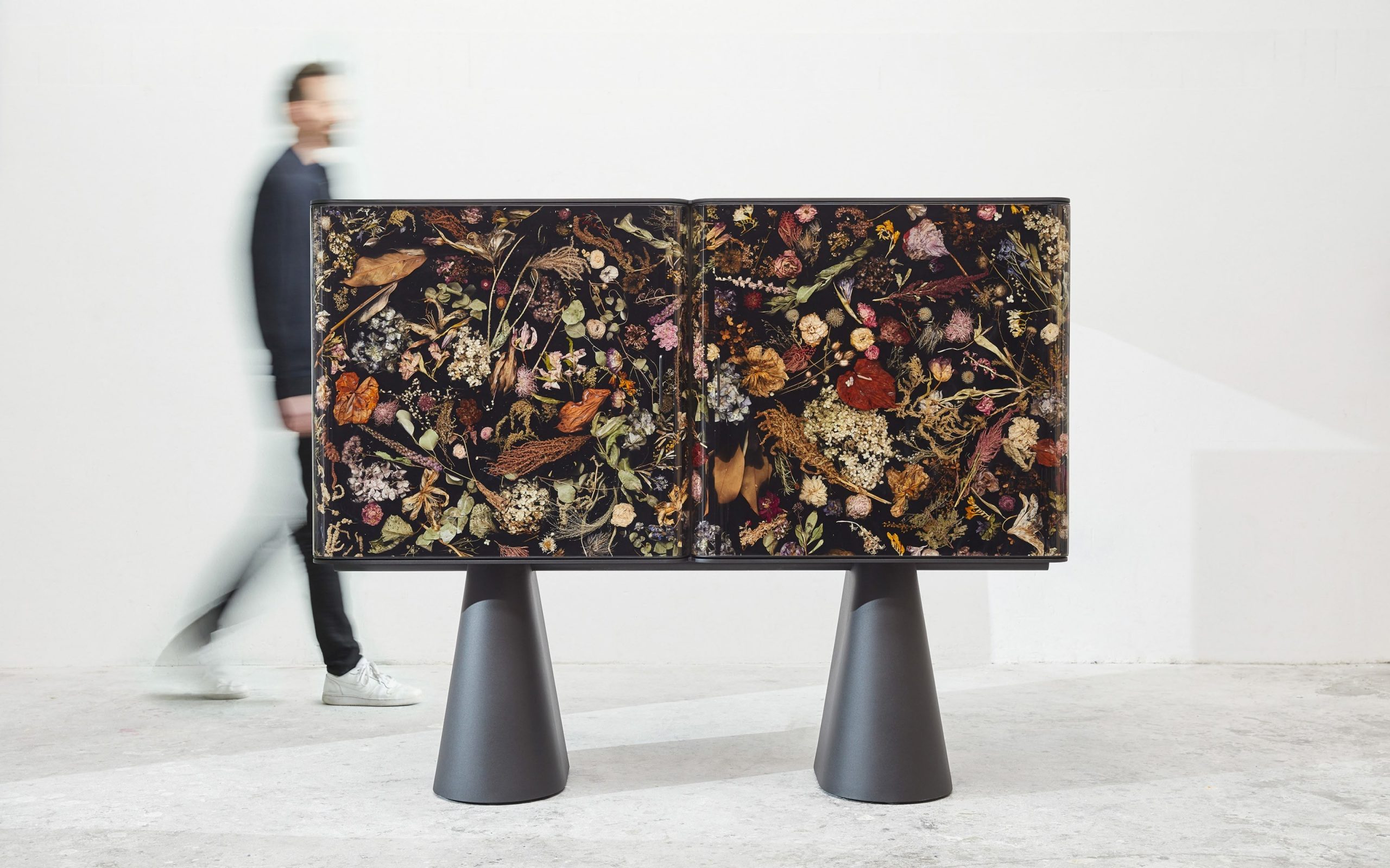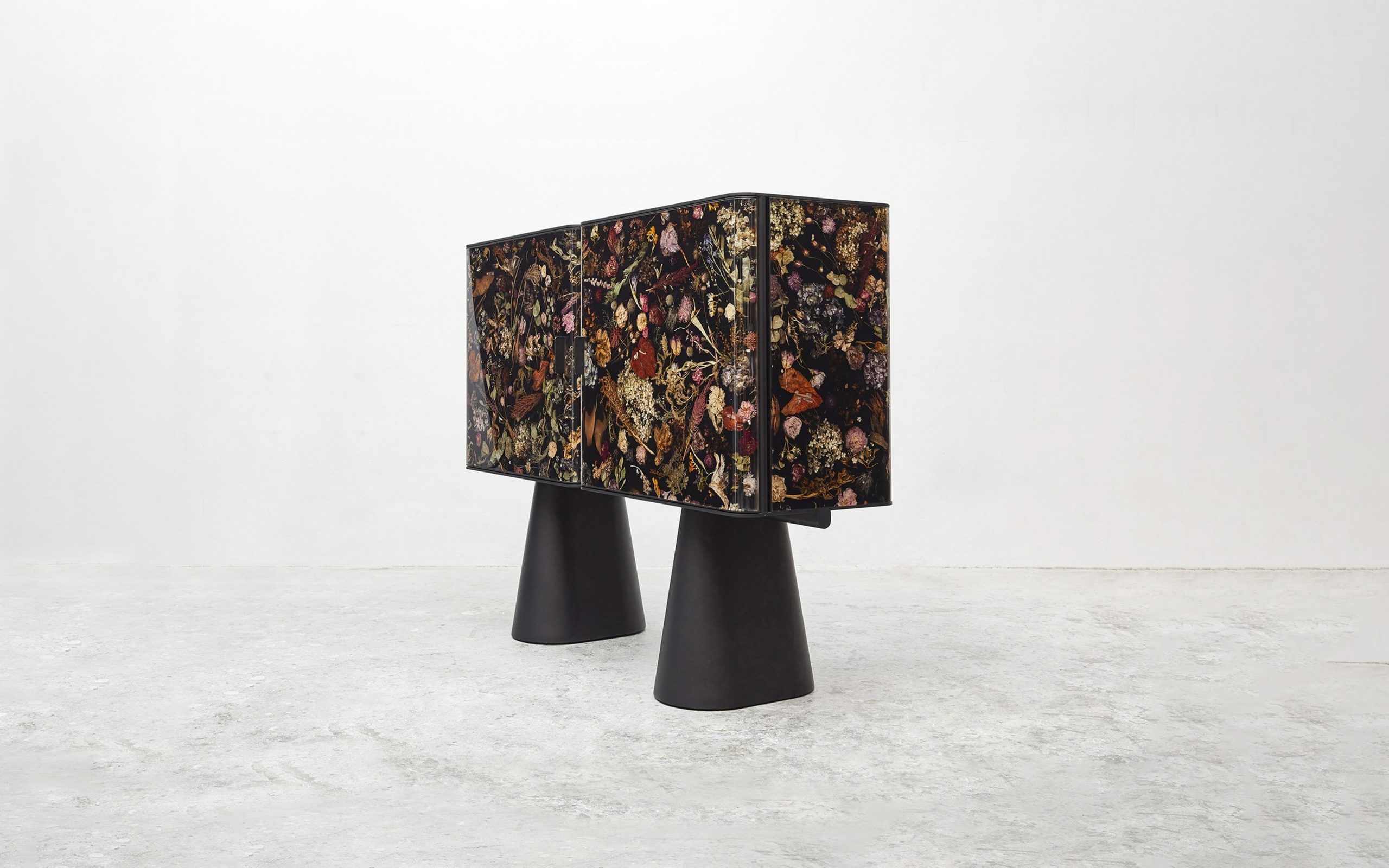 Characterised by elegantly rounded corners and cone-shaped, powder-coated steel legs, the Flora Cabinet 176 features our unique Flora Temporaria Black highlighting a dense floral composition reminiscent of Flemish still lifes. Finished in polished resin and black matte textured powder-coated steel. Inspired by Josef Frank’s ‘Flora Cabinet’, it is part of the Flora Contemporaria limited edition series.