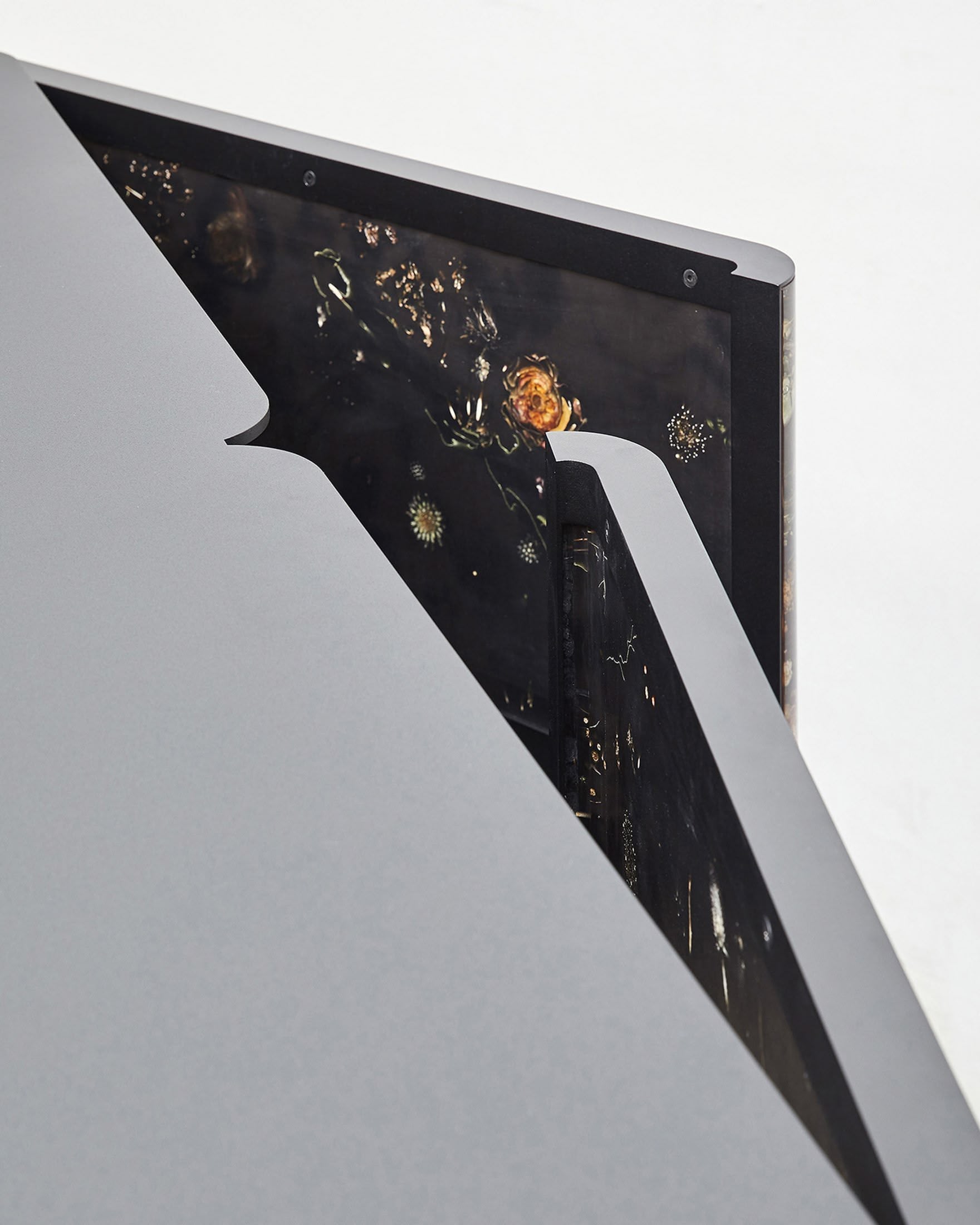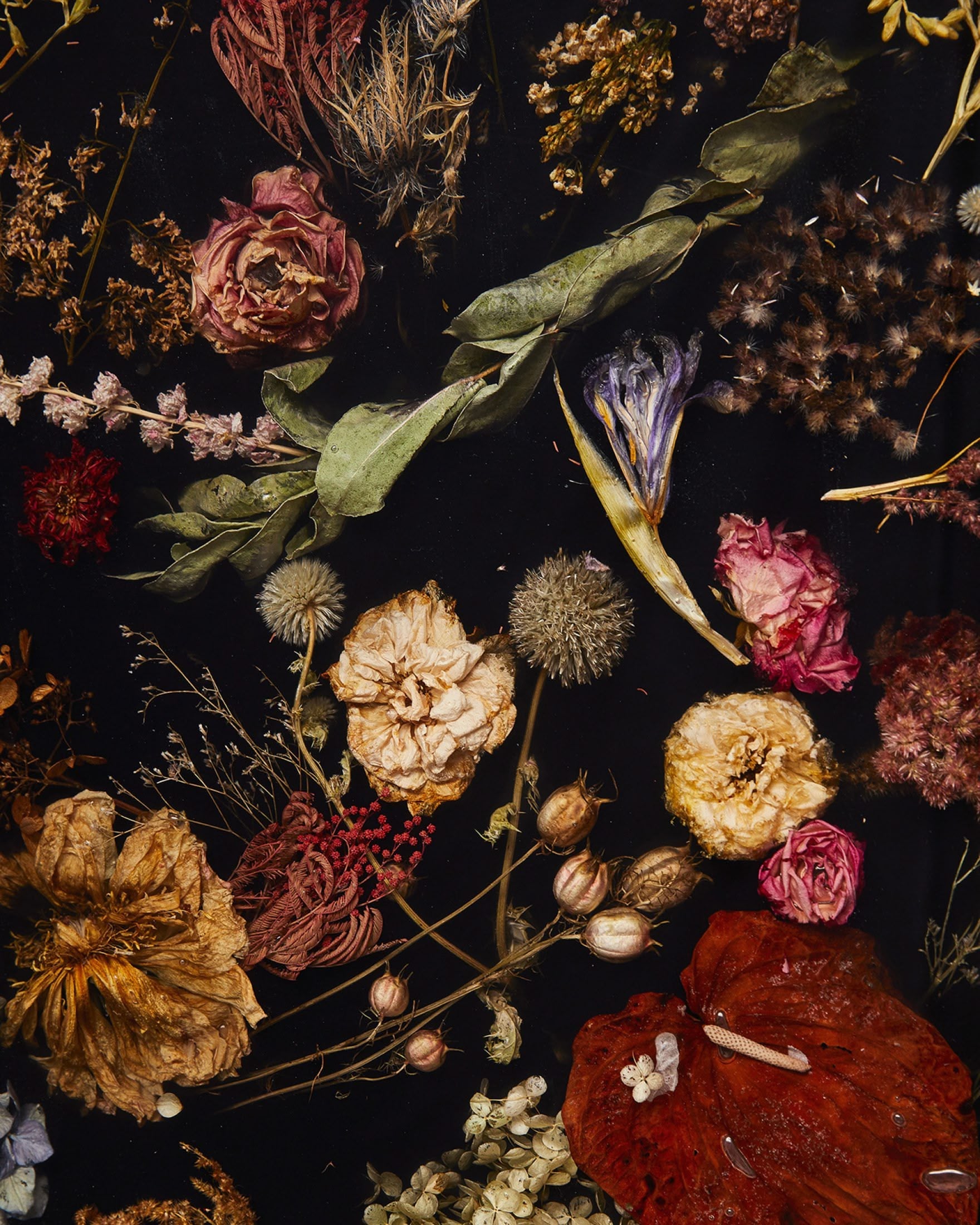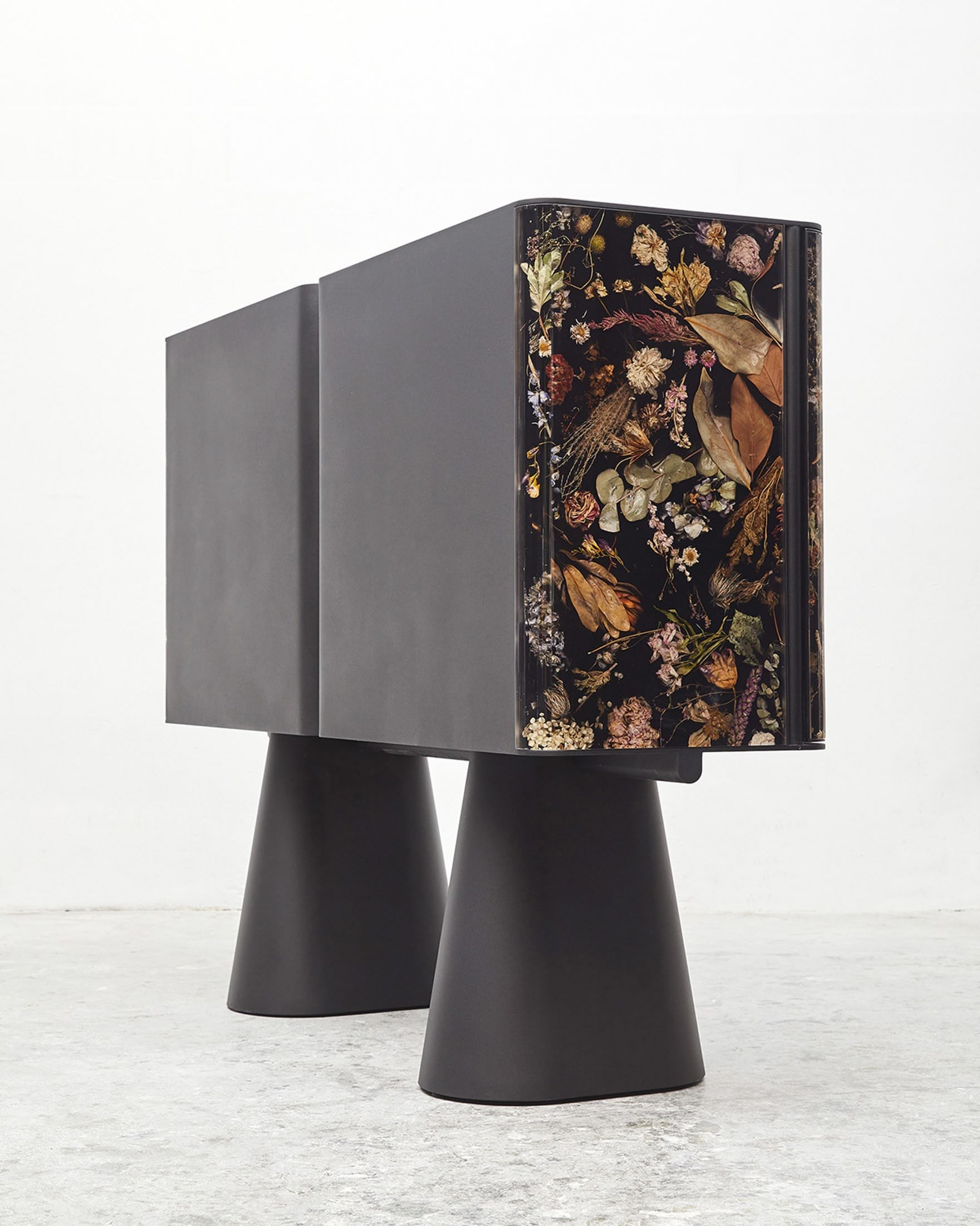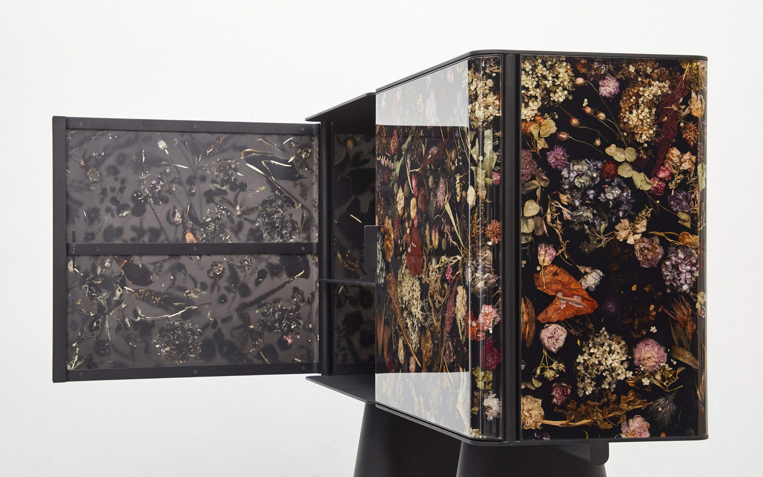 Selected and processed real flowers and leaves, resin, black matte textured powder-coated steel.