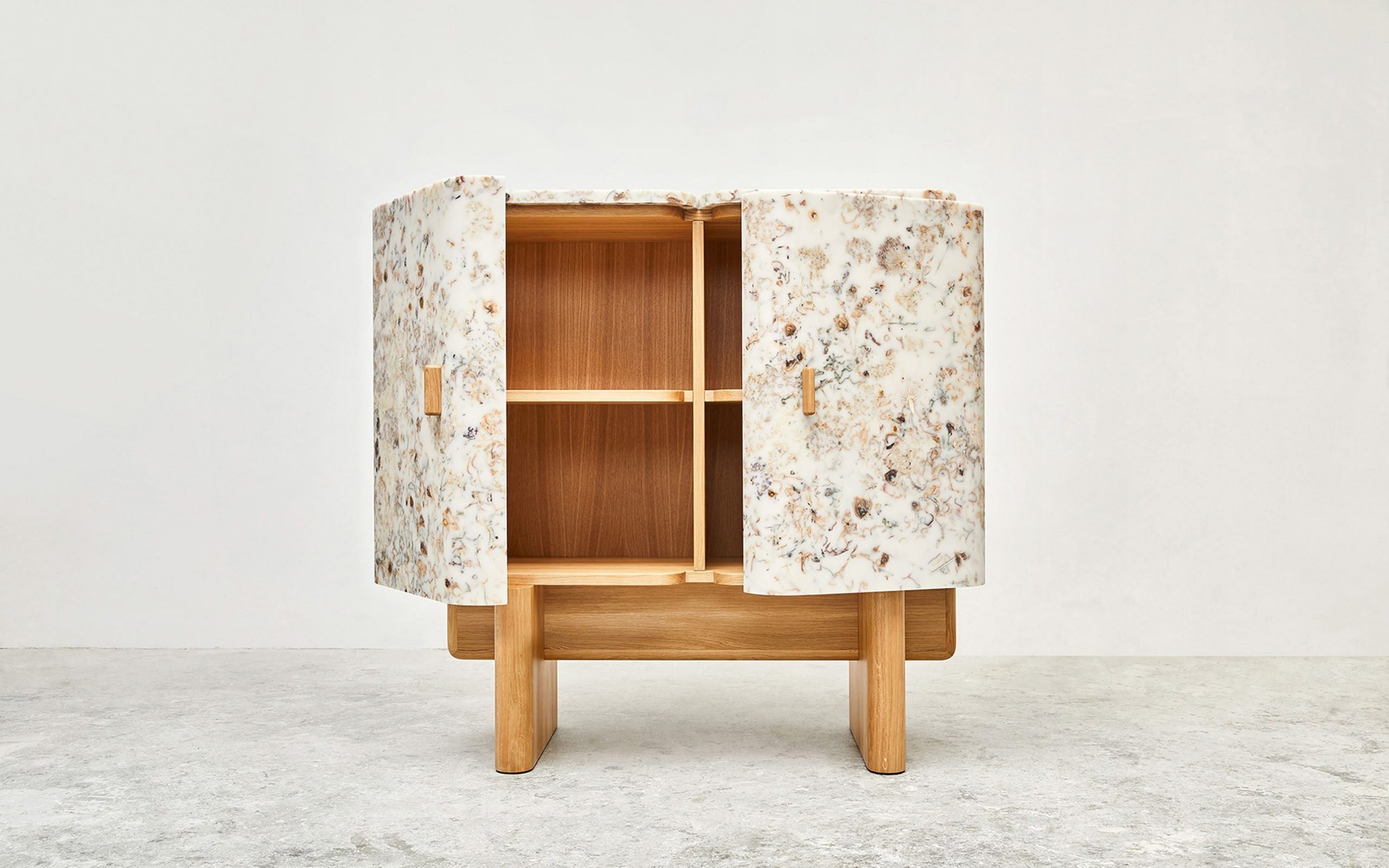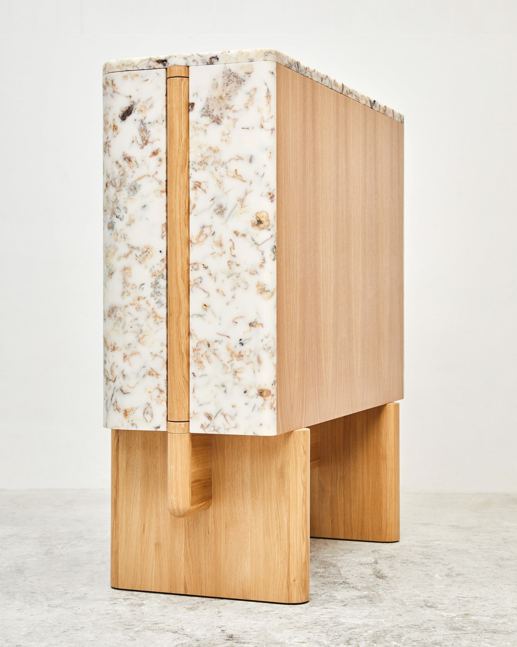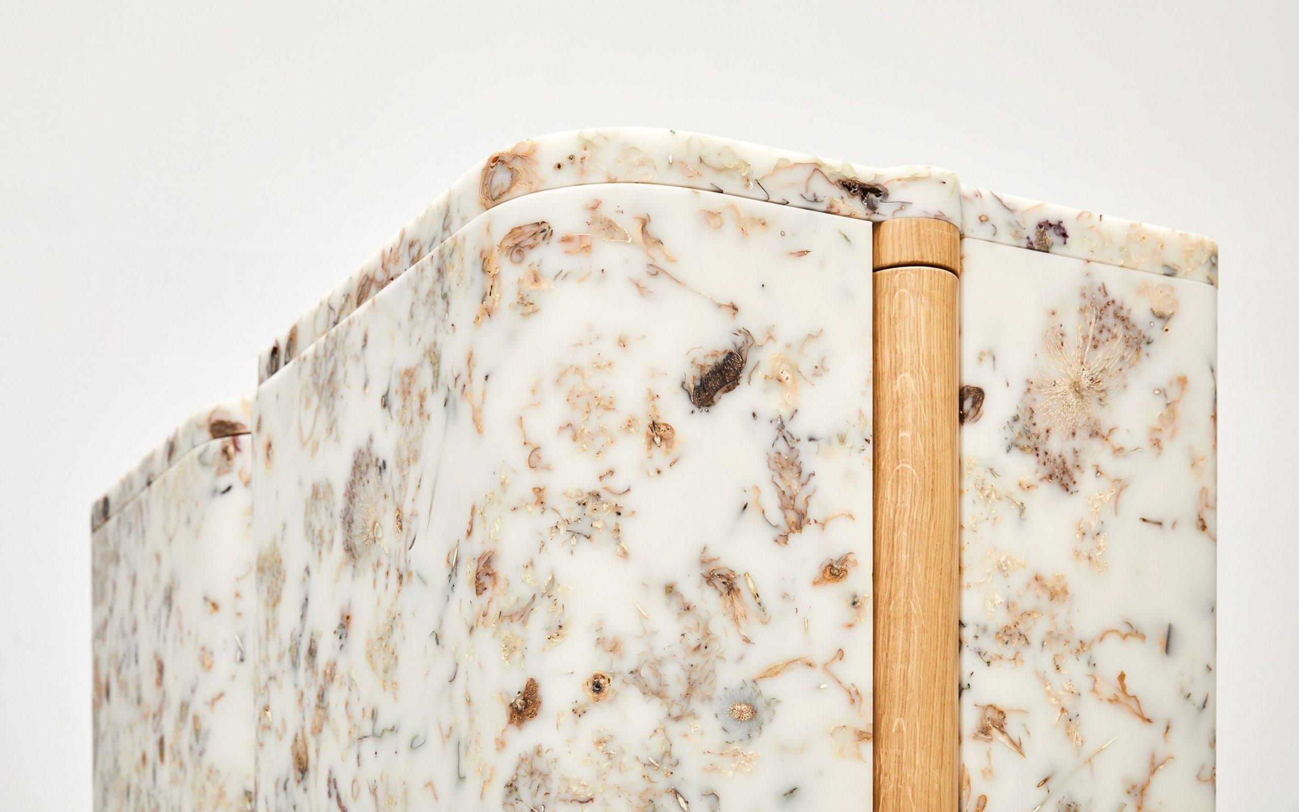 Inspired by Josef Frank’s ‘Flora Cabinet’, Flora Perma Cabinet 143 is part of the Flora Contemporaria limited edition series, composed of intersecting oak planes supporting a milky white resin body with curved corners. The Flora Perma material reveals the intricate and complex beauty of the cross-sections of flowers, the curve of petals, and the structure of leaves. Contrasted with white resin, they appear as veins or fossils creating an almost stone-like quality.
