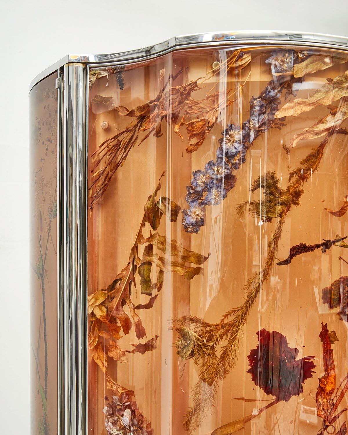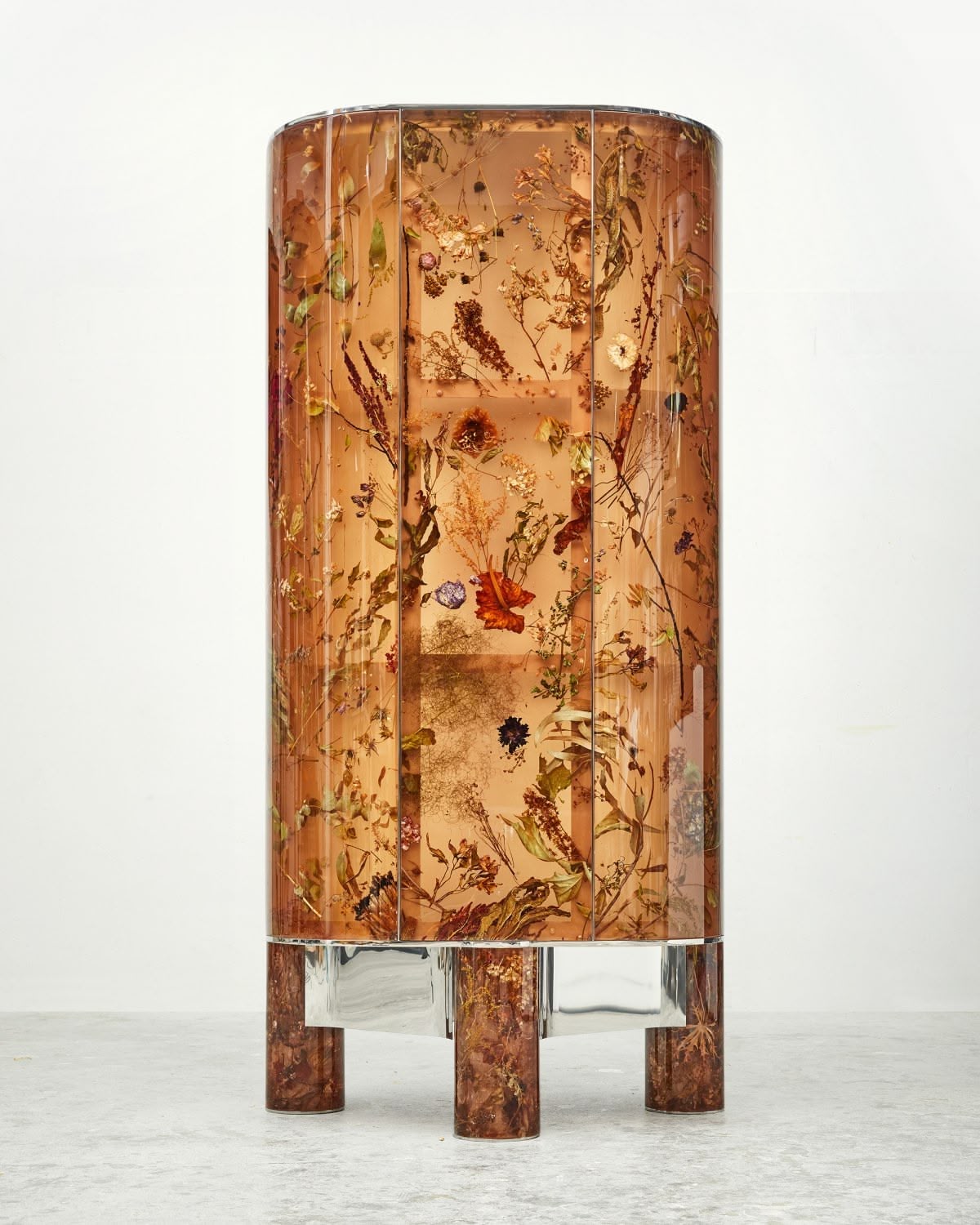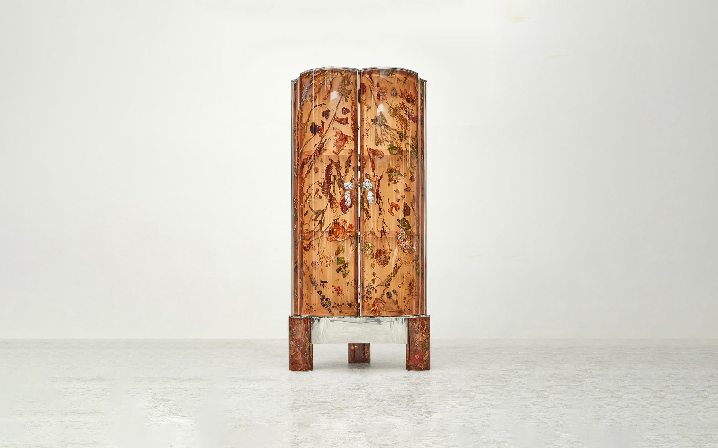 Inspired by Josef Frank’s ‘Flora Cabinet’, the Flora Cabinet 190 Clear Amber is part of the Flora Contemporaria limited edition series and implements our signature flower-infused resin in a bespoke hue, reminiscent of the Renaissance cabinets of curiosities and amber chambers. Framed in a reflective, polished stainless steel skeleton with mirror-like shelves, the material, polished on the outside and matte inside, highlights the plants encapsulated within as if they were genuine fossils. The organic-shaped handles are formed with real celosia flowers and metallised in polished zinc in a bespoke thermo-coating technique.