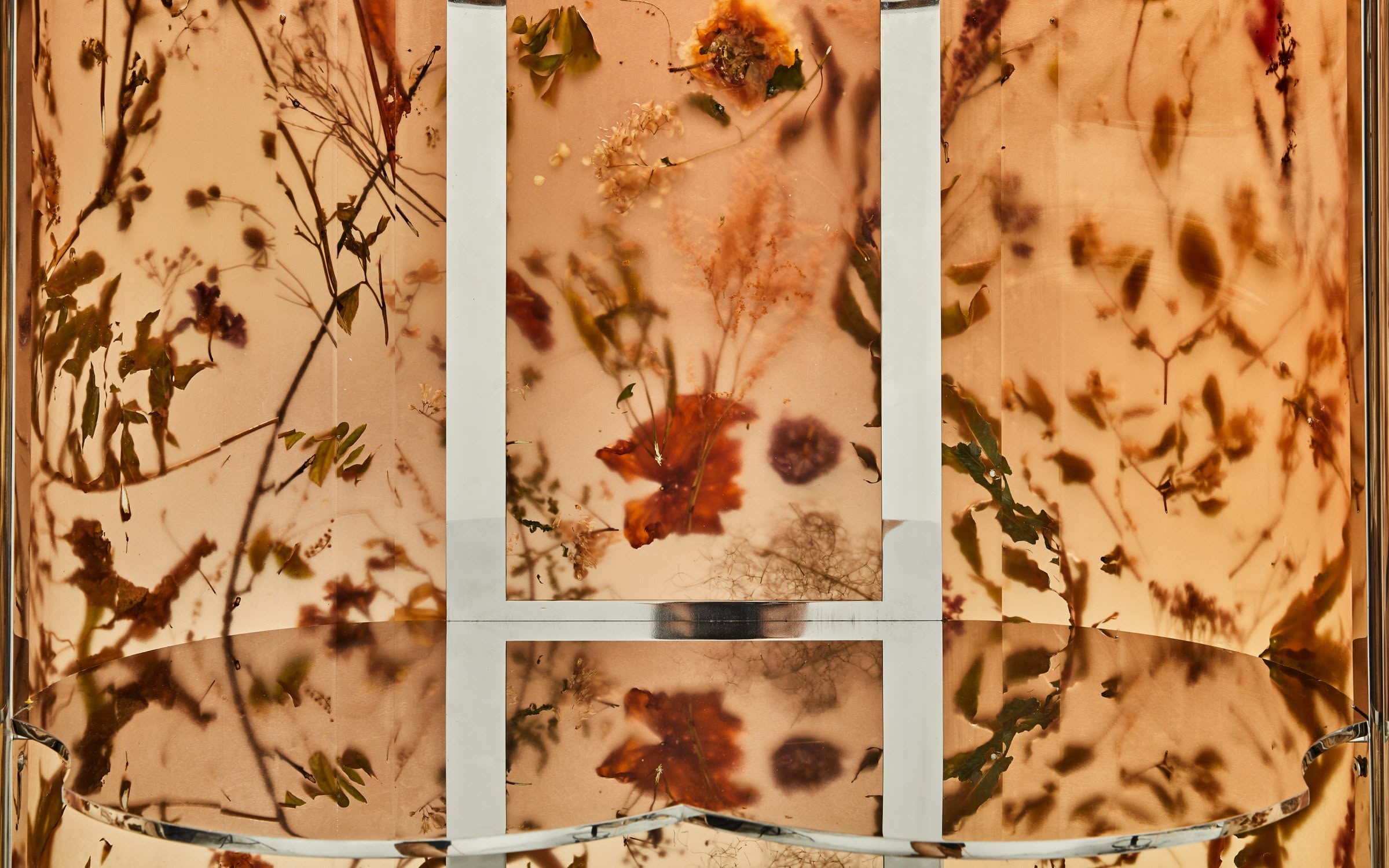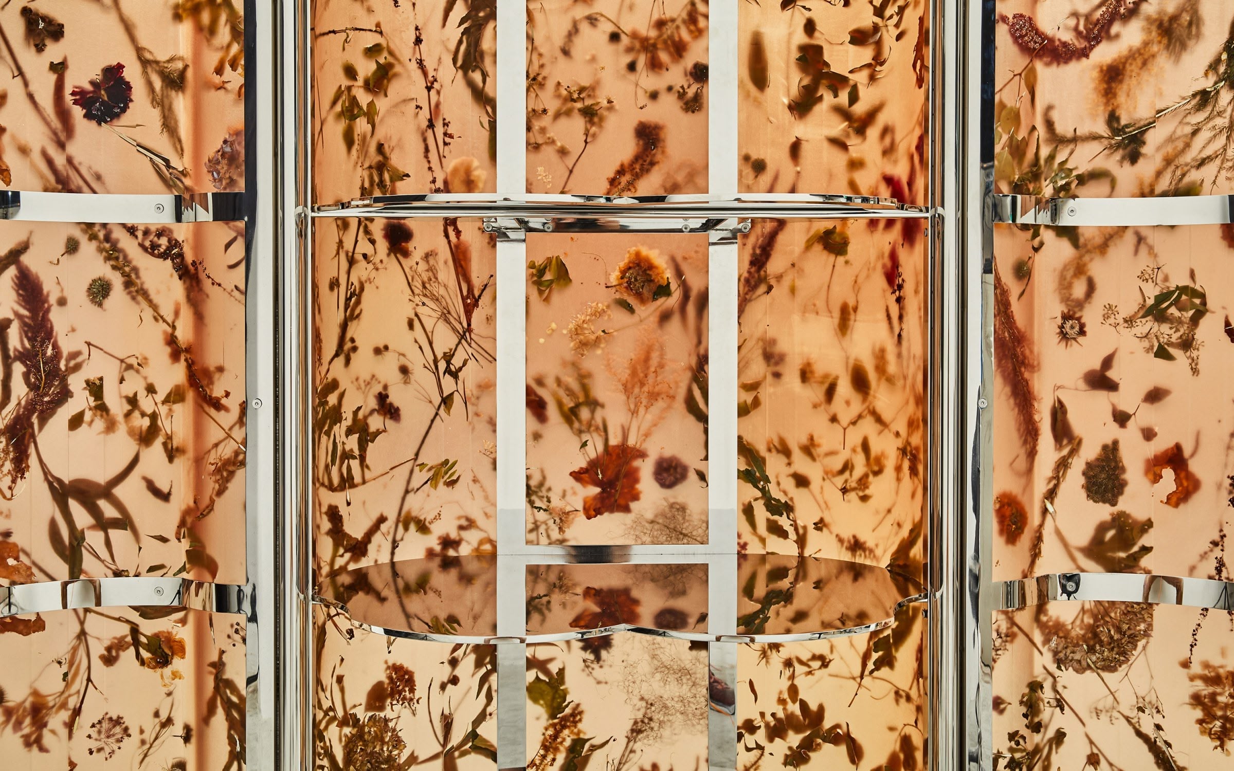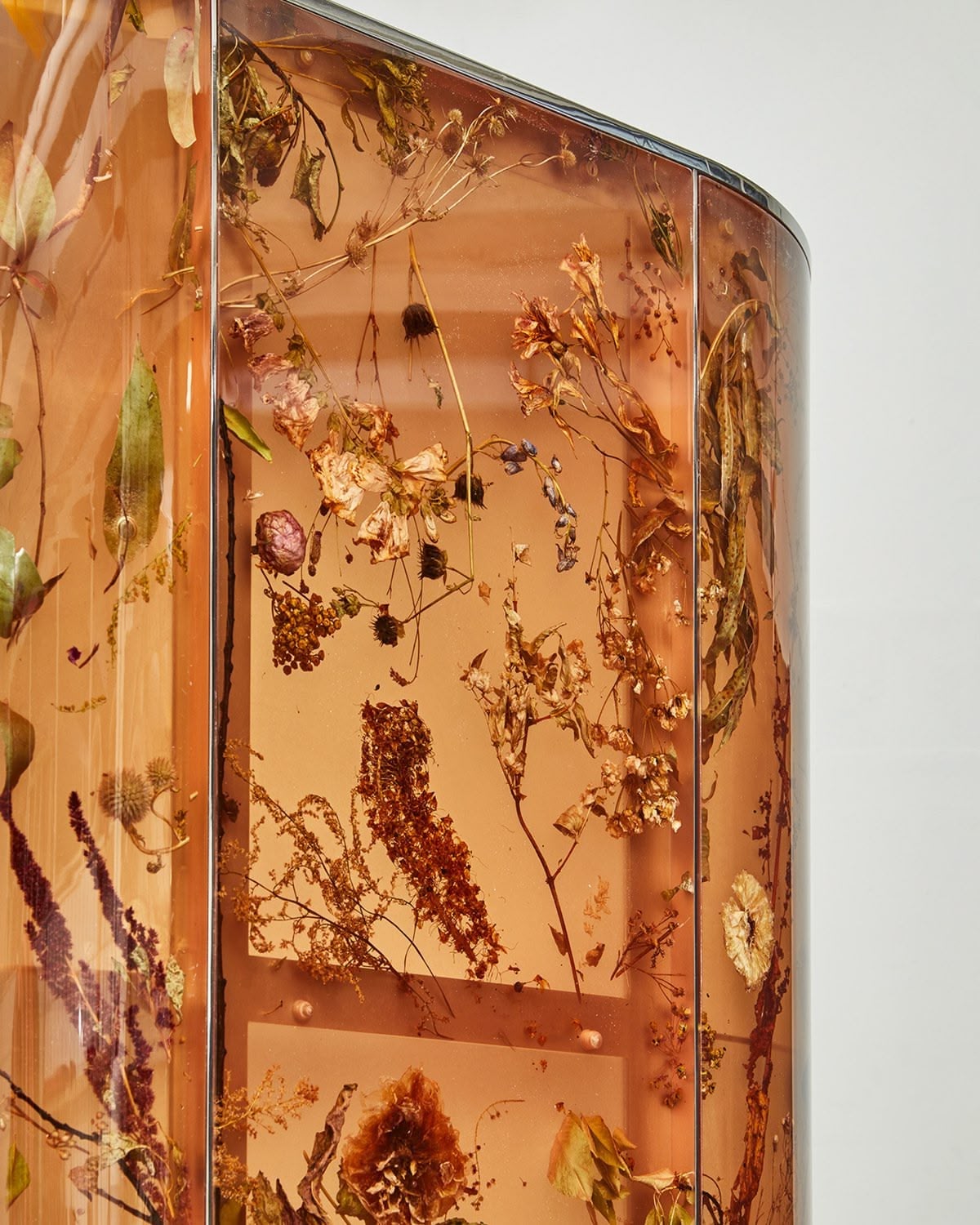 Inspired by Josef Frank’s ‘Flora Cabinet’, the Flora Cabinet 190 Clear Amber is part of the Flora Contemporaria limited edition series and implements our signature flower-infused resin in a bespoke hue, reminiscent of the Renaissance cabinets of curiosities and amber chambers. Framed in a reflective, polished stainless steel skeleton with mirror-like shelves, the material, polished on the outside and matte inside, highlights the plants encapsulated within as if they were genuine fossils. The organic-shaped handles are formed with real celosia flowers and metallised in polished zinc in a bespoke thermo-coating technique.