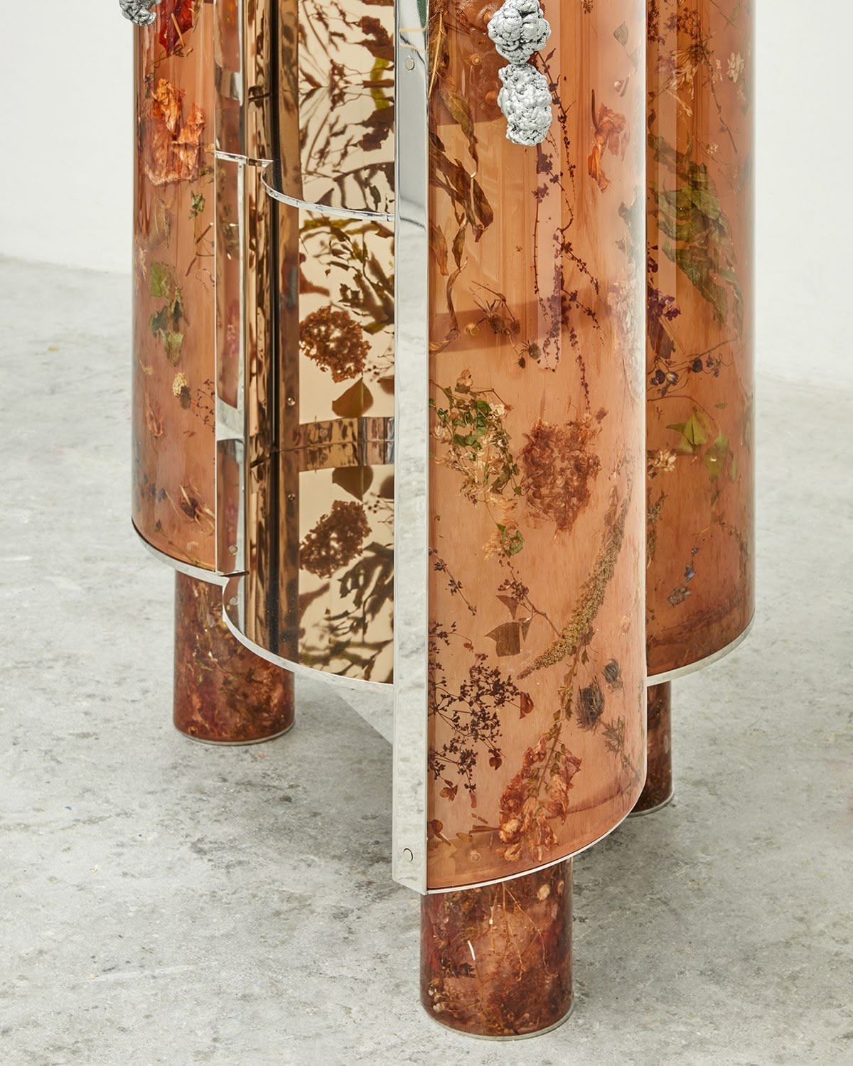 Selected and processed real flowers and leaves, resin, stainless steel.