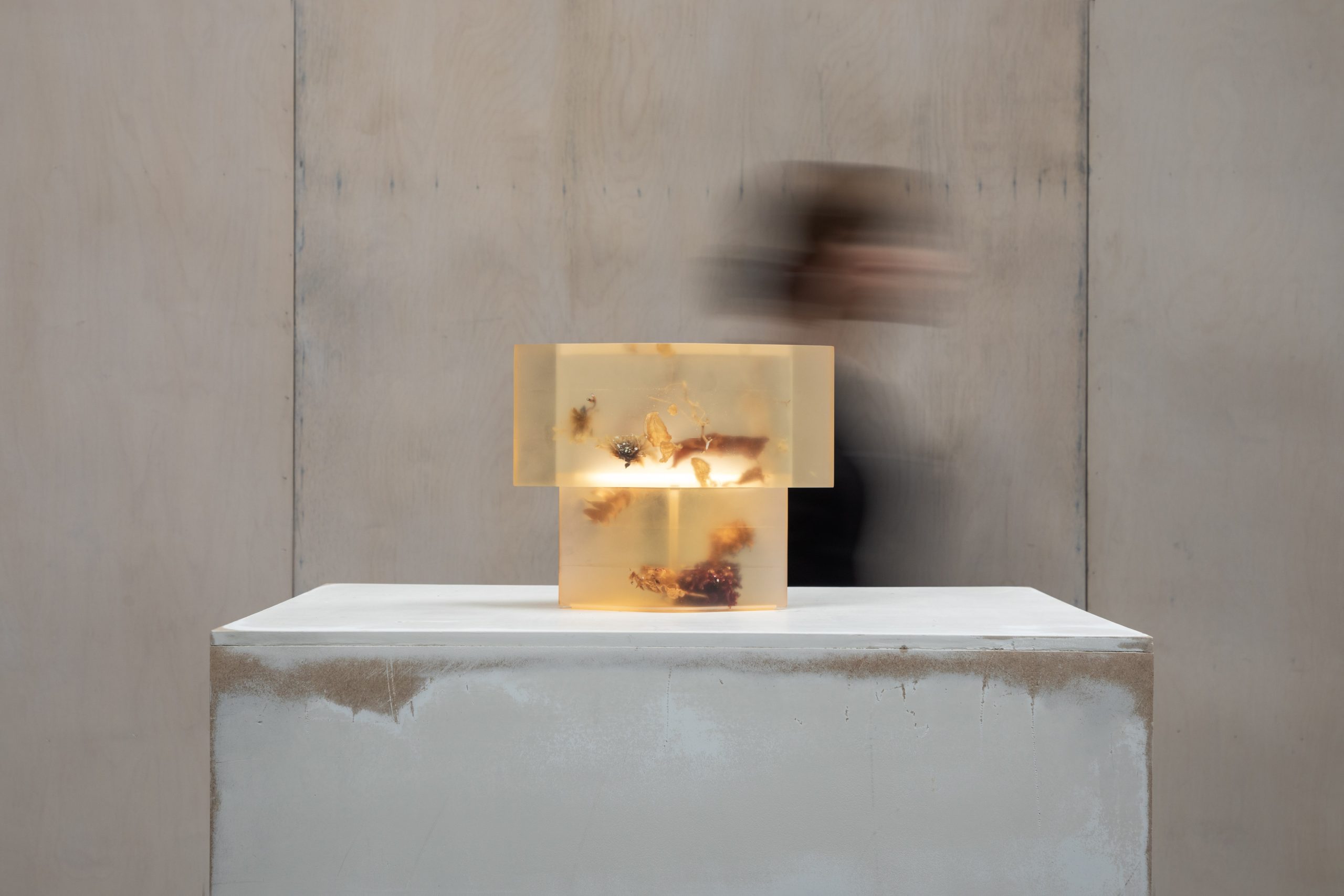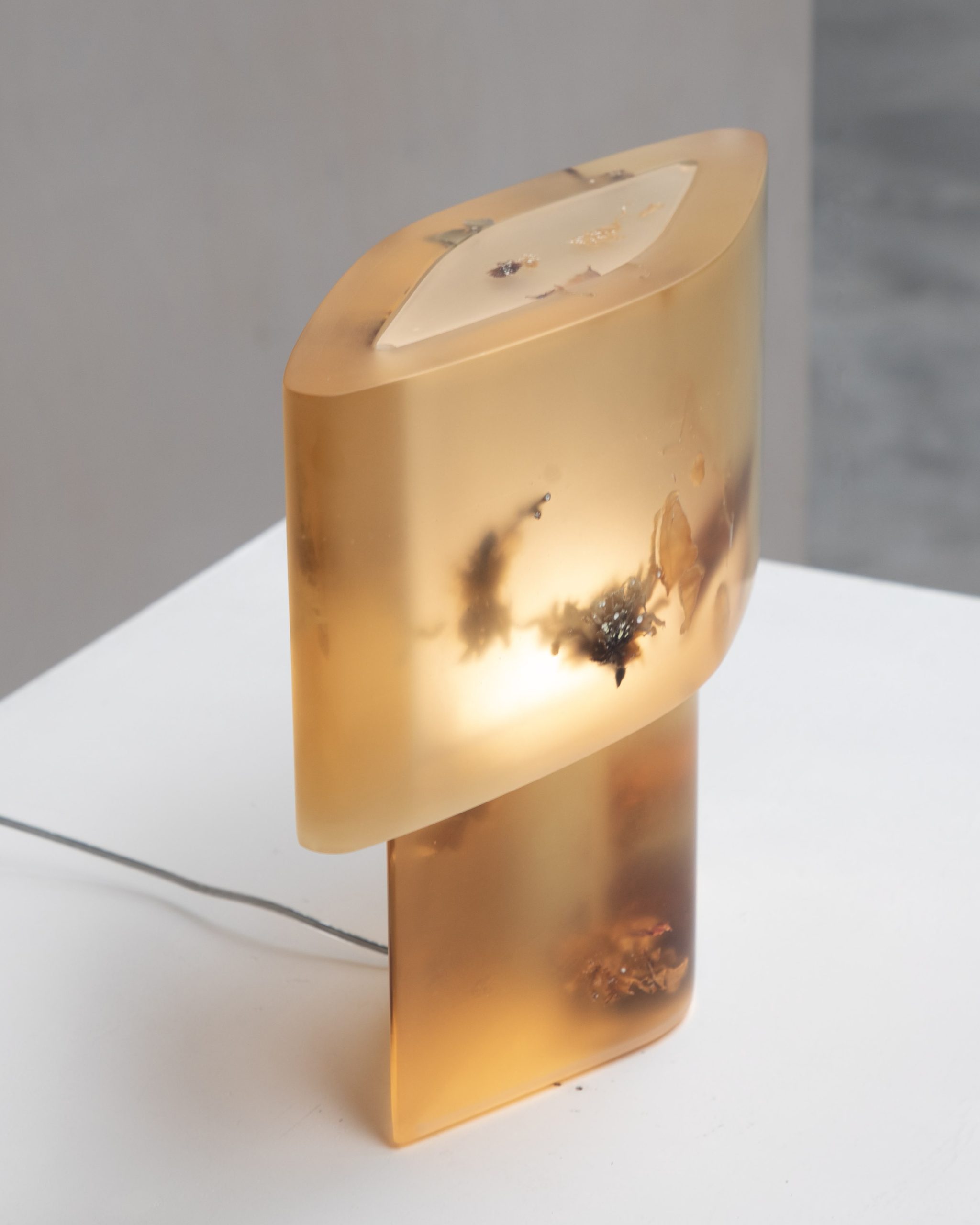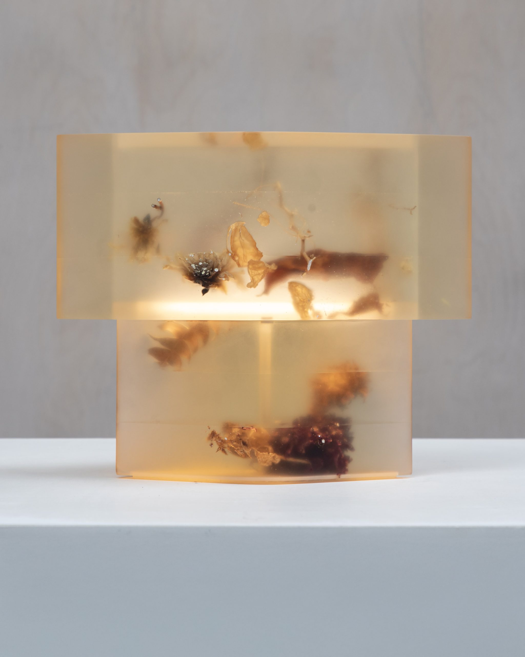 Featuring a unique flower arrangement encased in a tinted, amber-like translucent form, the light sculpture merges soft, geometric contours with an organic irregularity of natural composition. Handcrafted from resin and waste flowers, the piece is available in polished or matte finish.