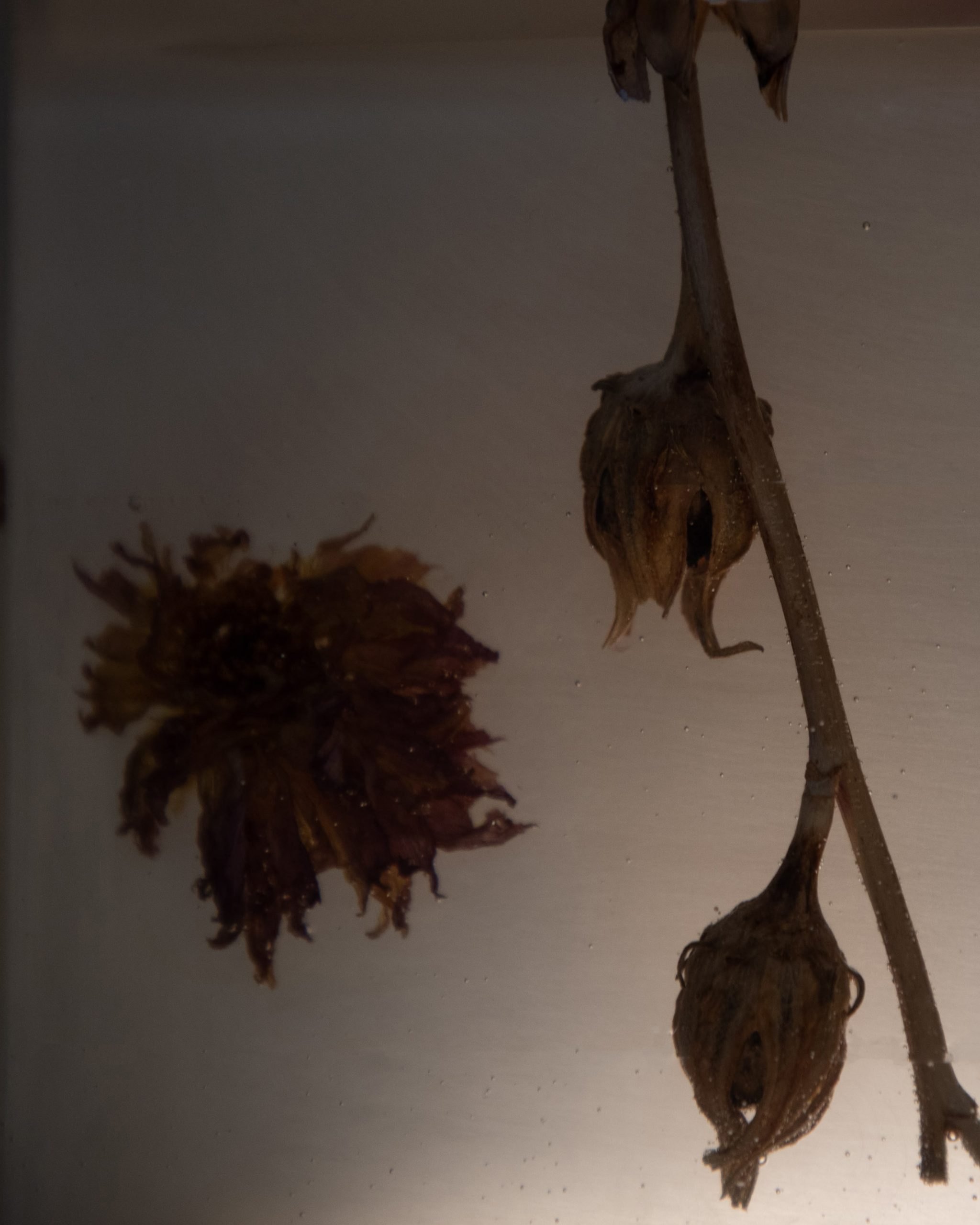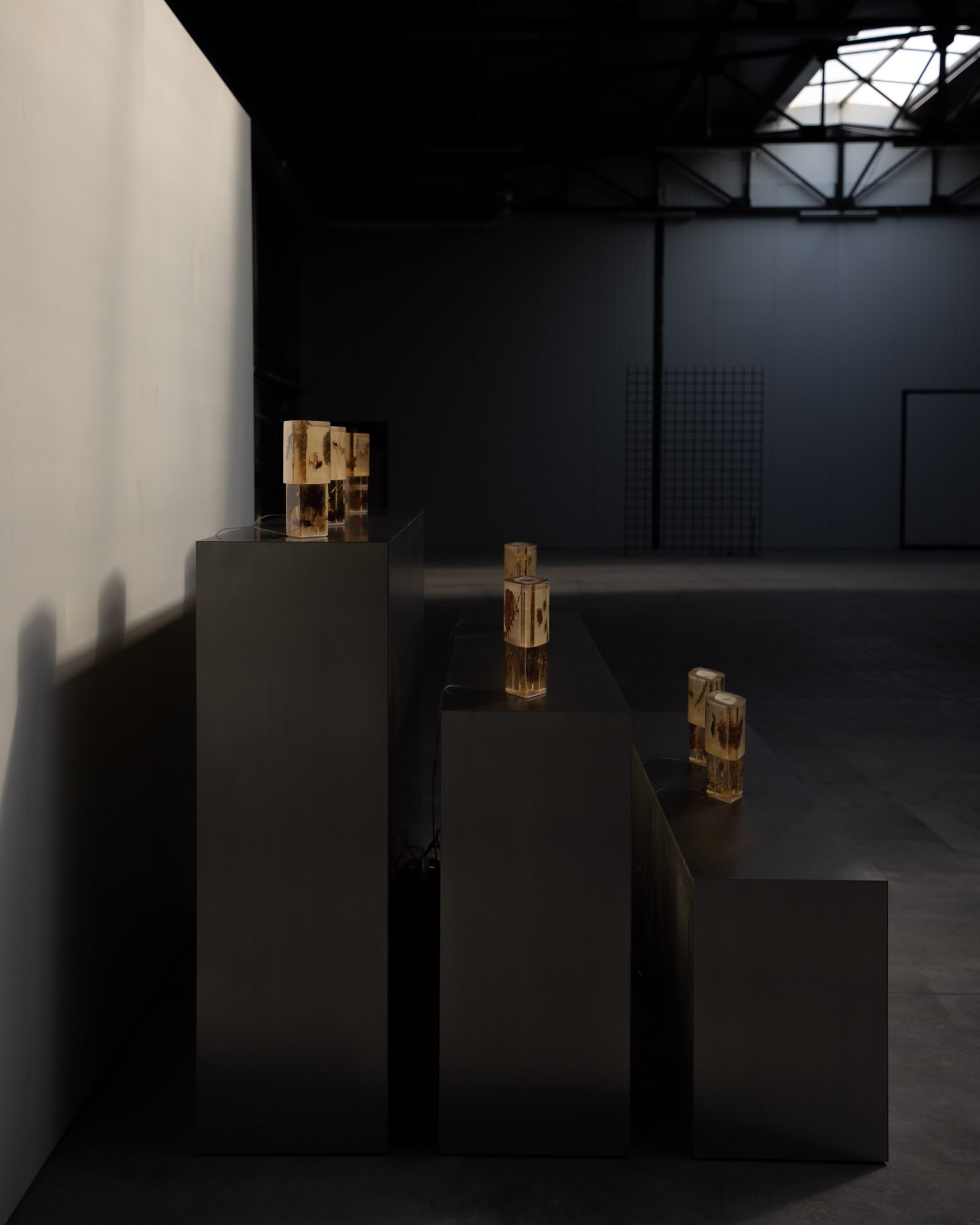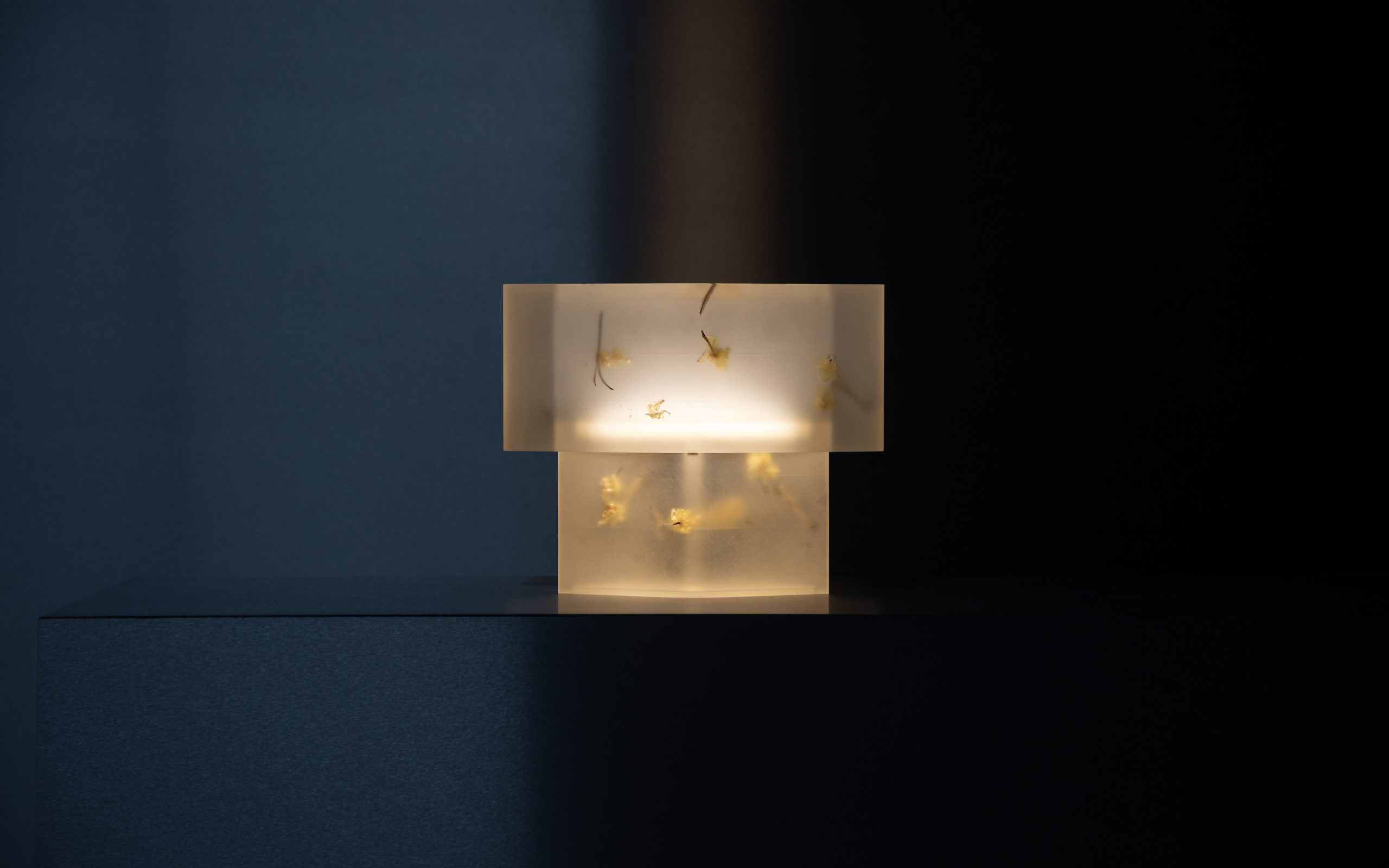 Featuring a unique flower arrangement encased in a tinted, amber-like translucent form, the light sculpture merges soft, geometric contours with an organic irregularity of natural composition. Handcrafted from resin and waste flowers, the piece is available in polished or matte finish.