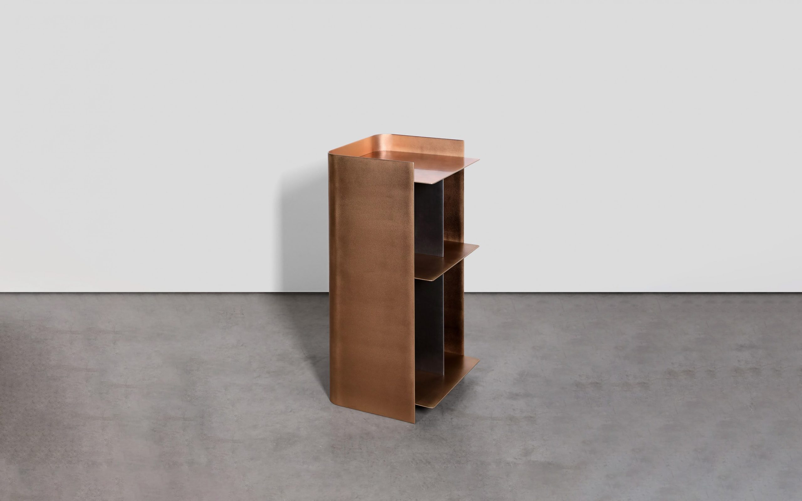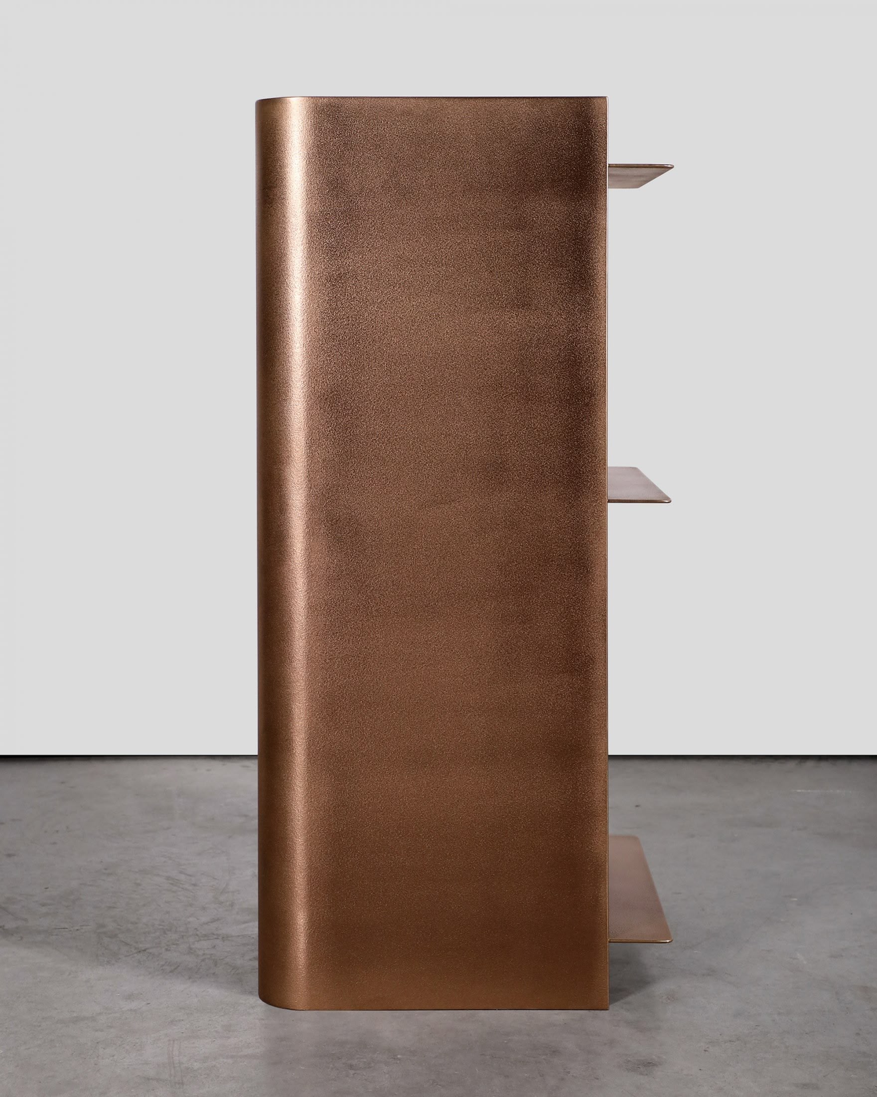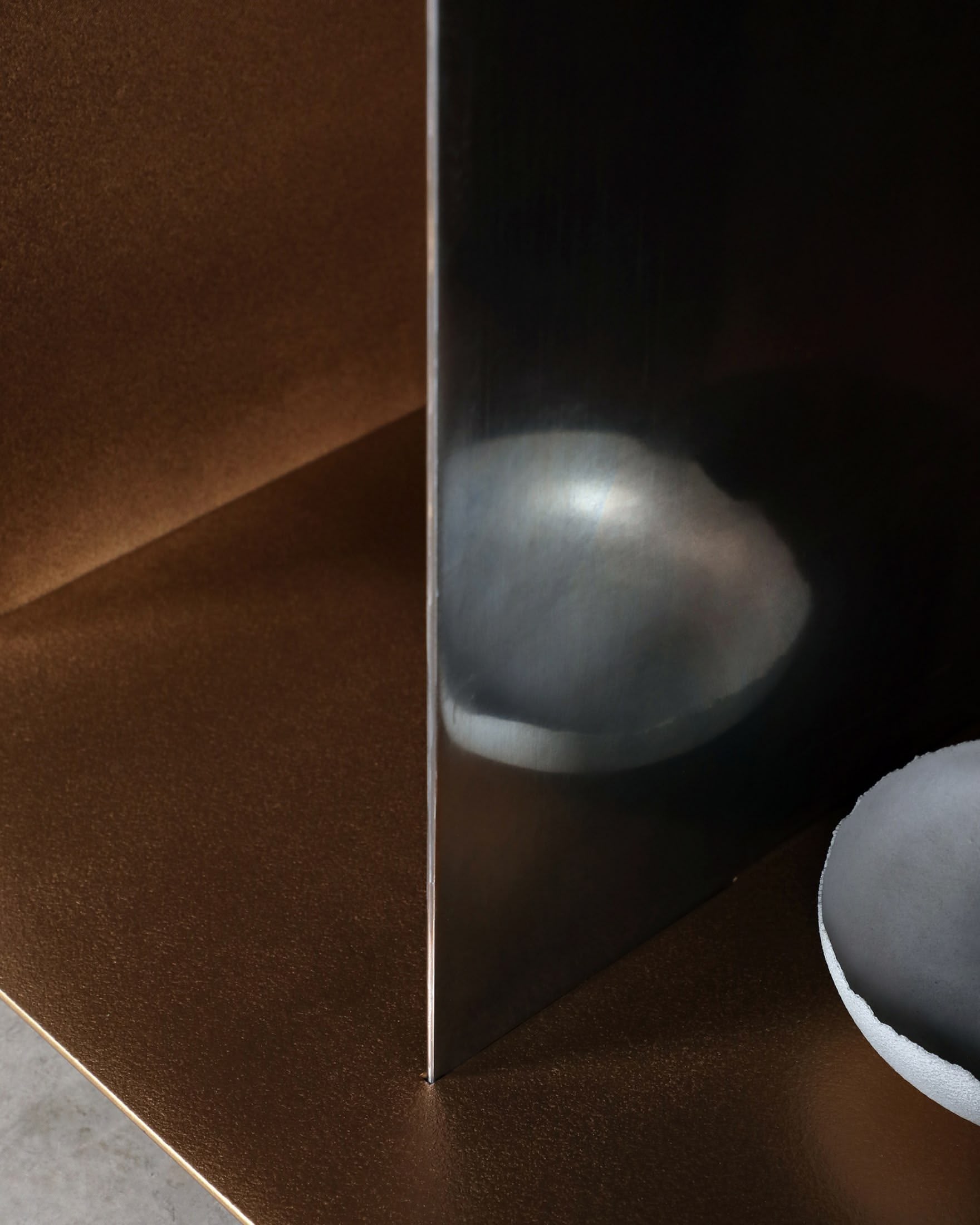 Drinks Cabinet 83-1, named in reference to its height, is a composition of narrow planes in aluminium bronze and zinc that intersect and overhang. A body of softly rounded edges offsets the angular interior intersections. While the main body is finished in textured aluminium bronze, the juxtaposing polished zinc vertical planes allow for light to penetrate within and illuminate the cabinet compartments. The top shelf’s satin sheen finish provides a gentle, illusory reflective surface.