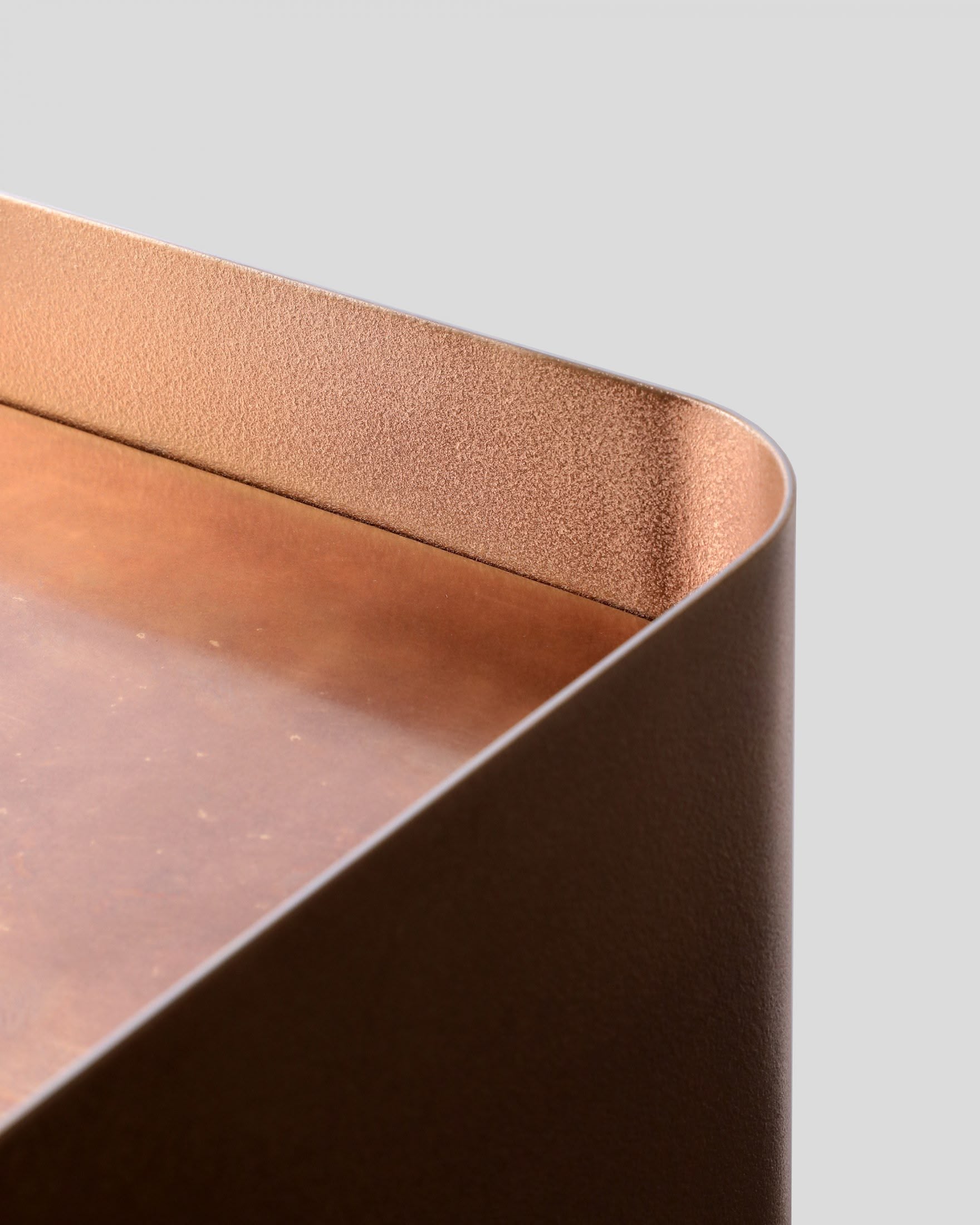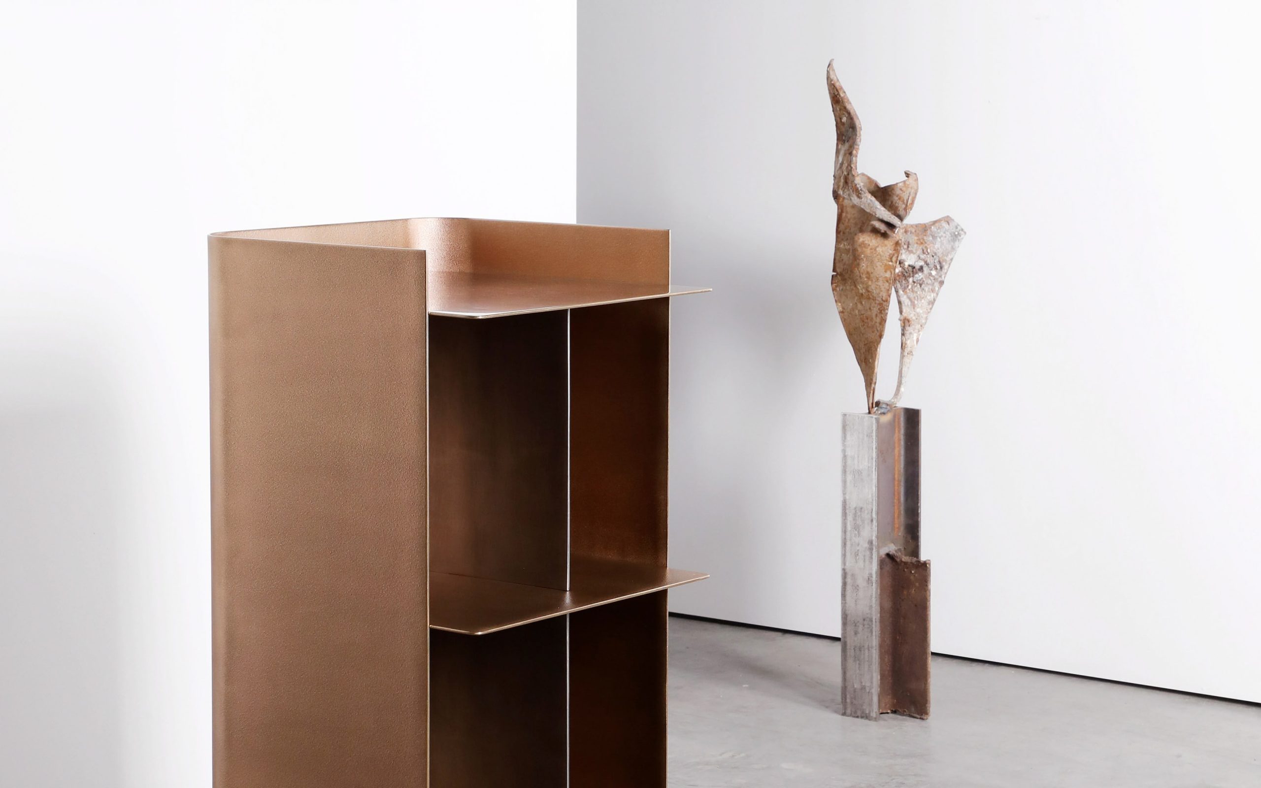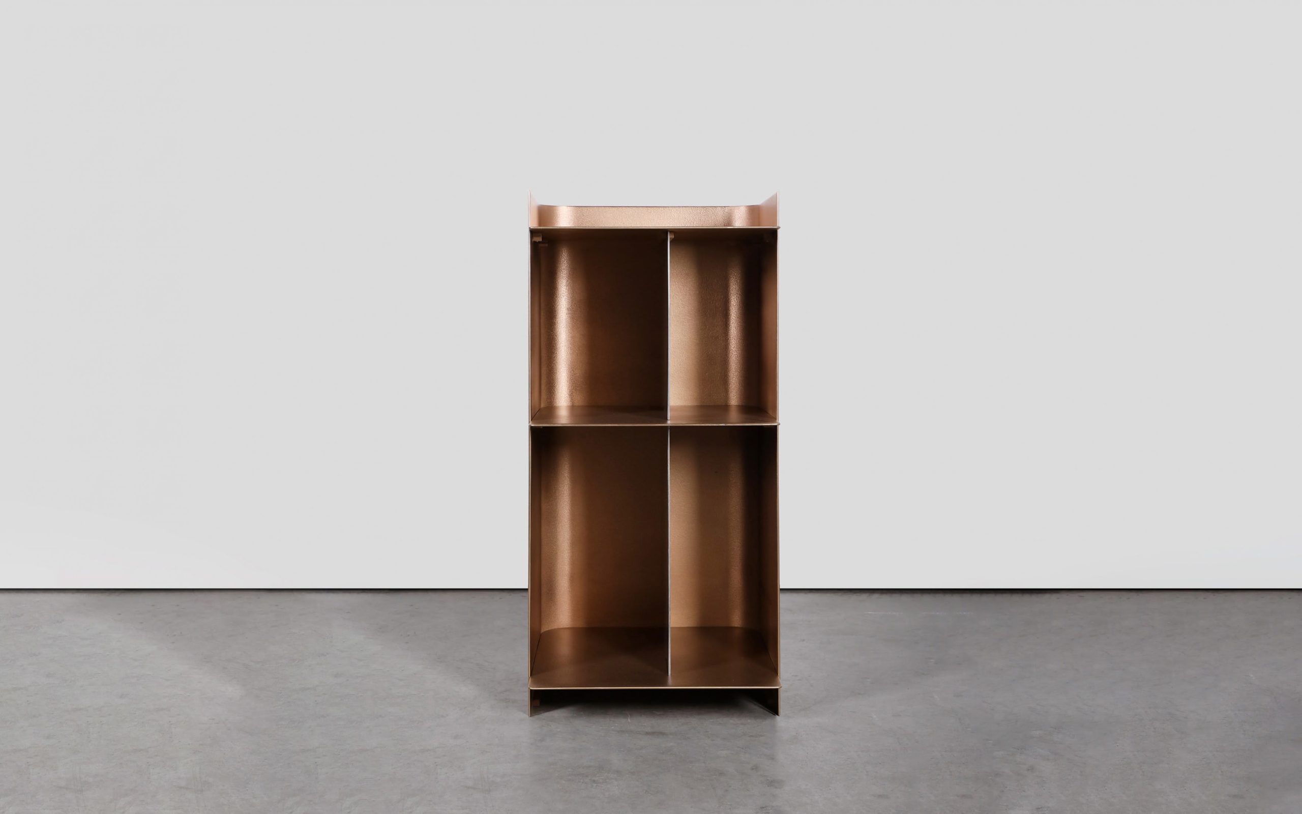 Drinks Cabinet 83-1, named in reference to its height, is a composition of narrow planes in aluminium bronze and zinc that intersect and overhang. A body of softly rounded edges offsets the angular interior intersections. While the main body is finished in textured aluminium bronze, the juxtaposing polished zinc vertical planes allow for light to penetrate within and illuminate the cabinet compartments. The top shelf’s satin sheen finish provides a gentle, illusory reflective surface.