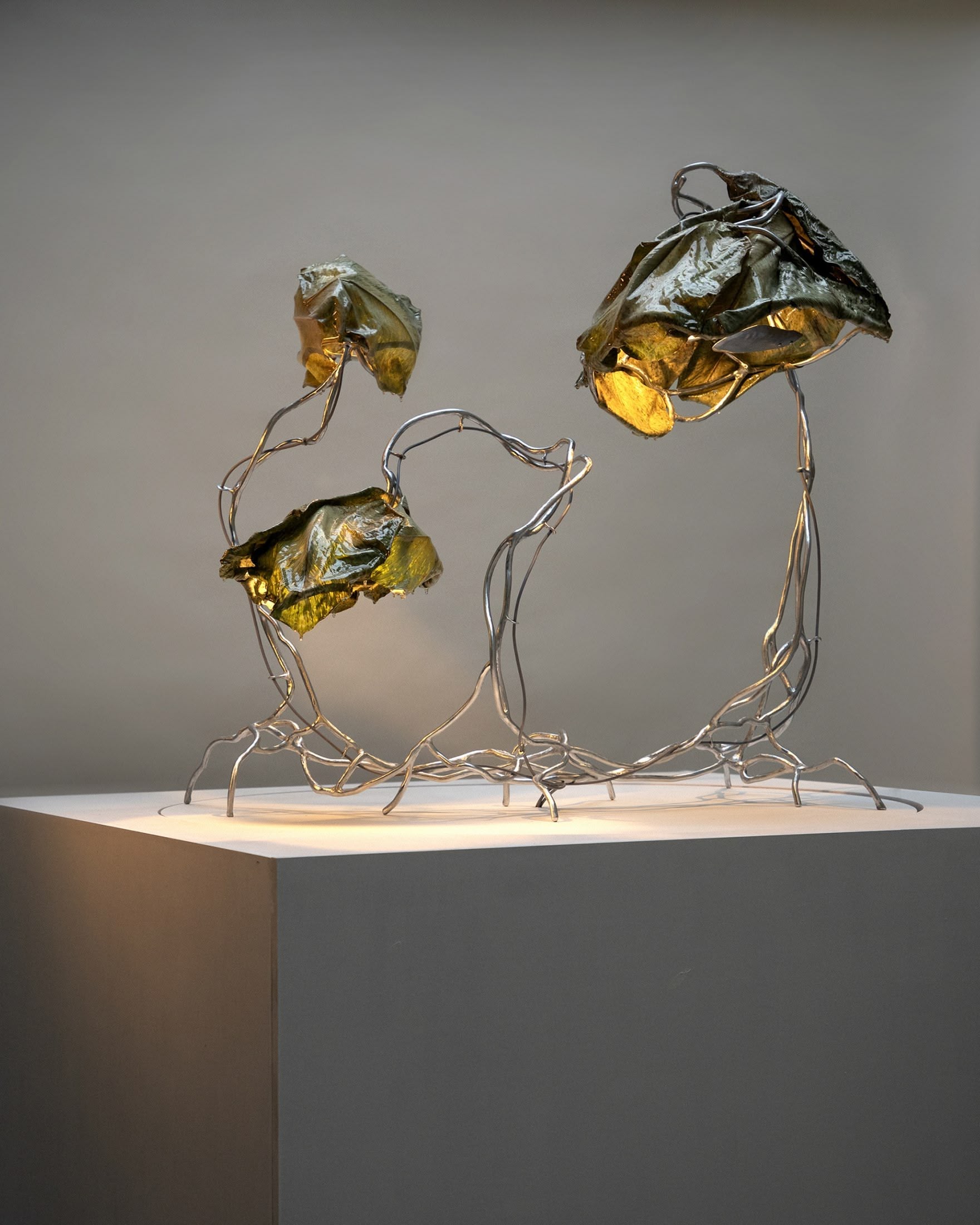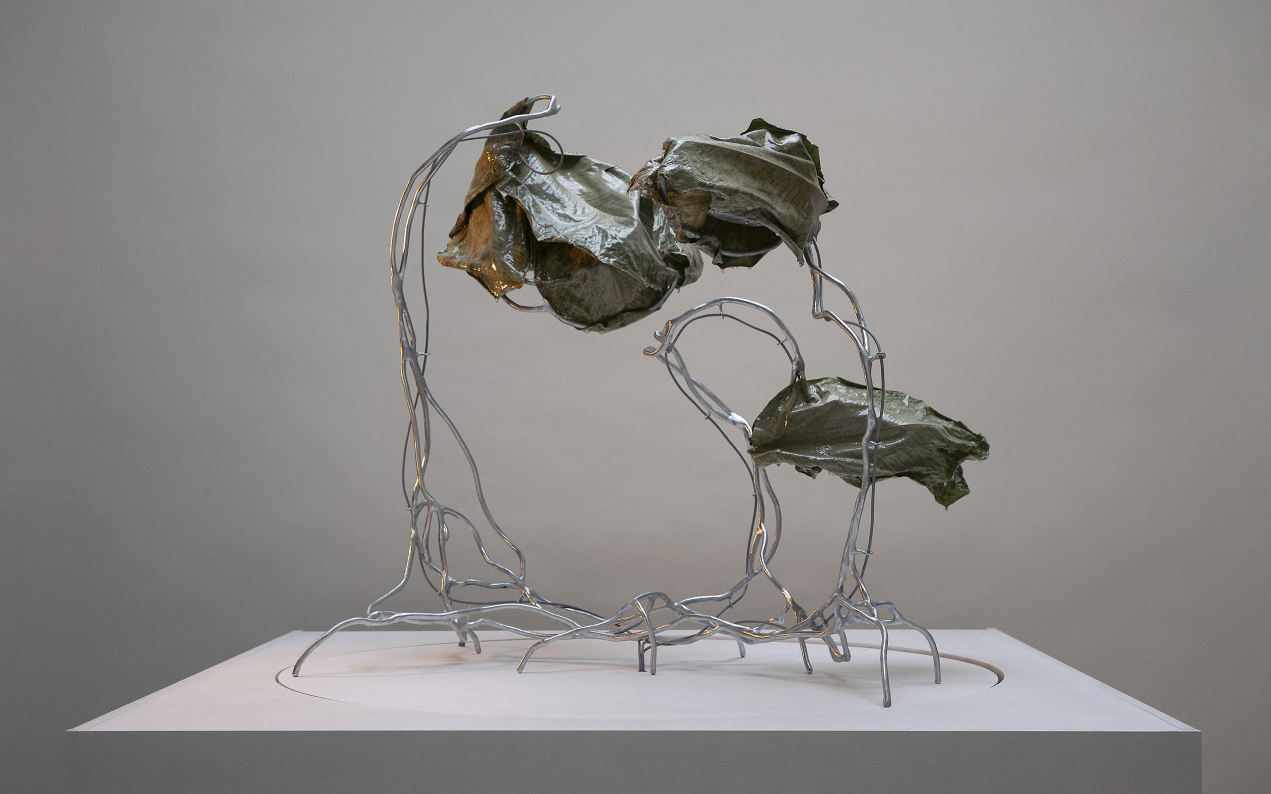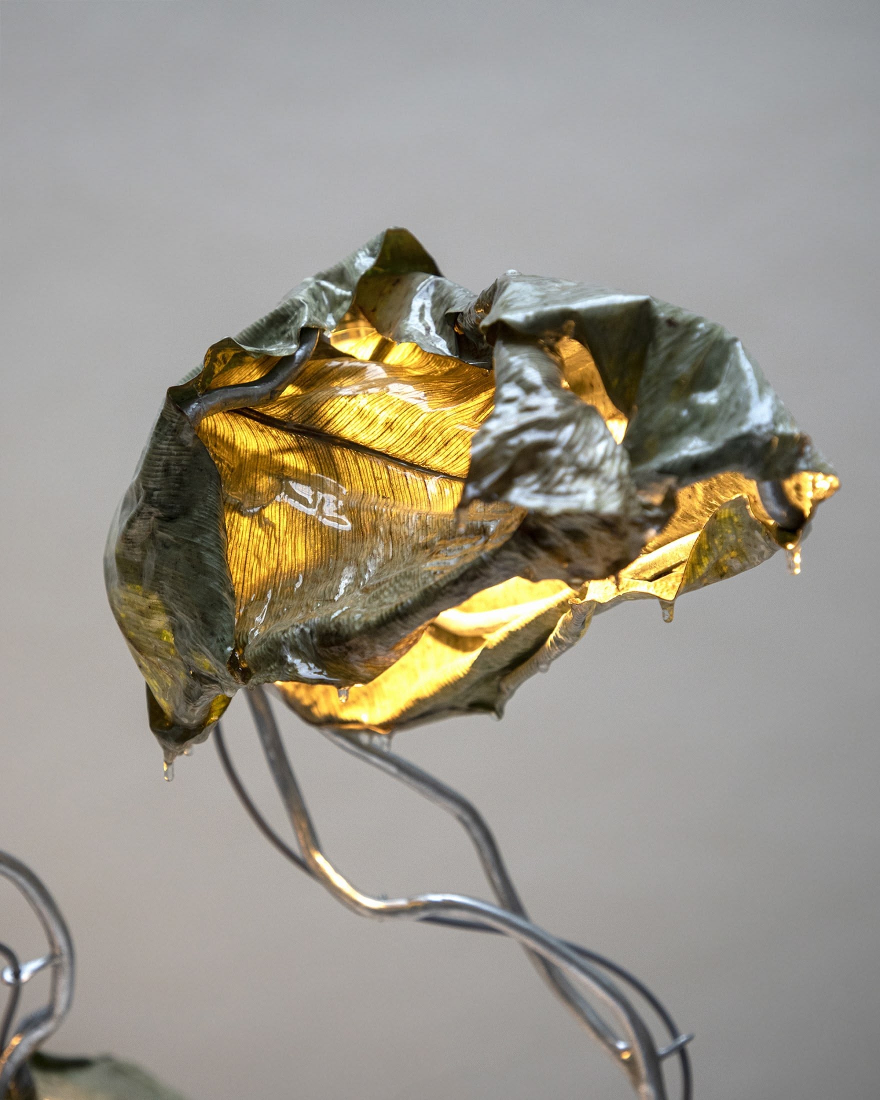 Selected and processed leaves, resin, steel. Light components.
