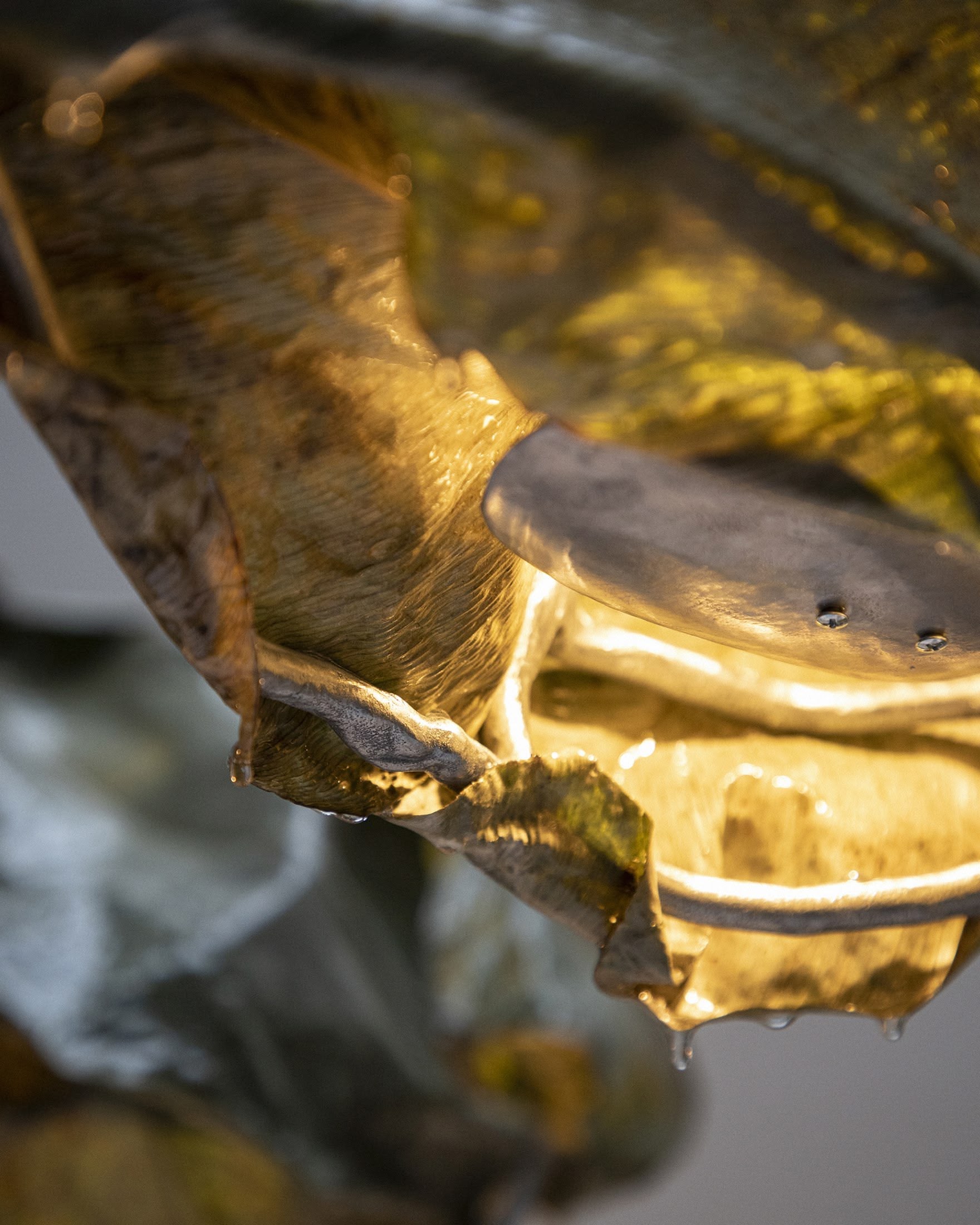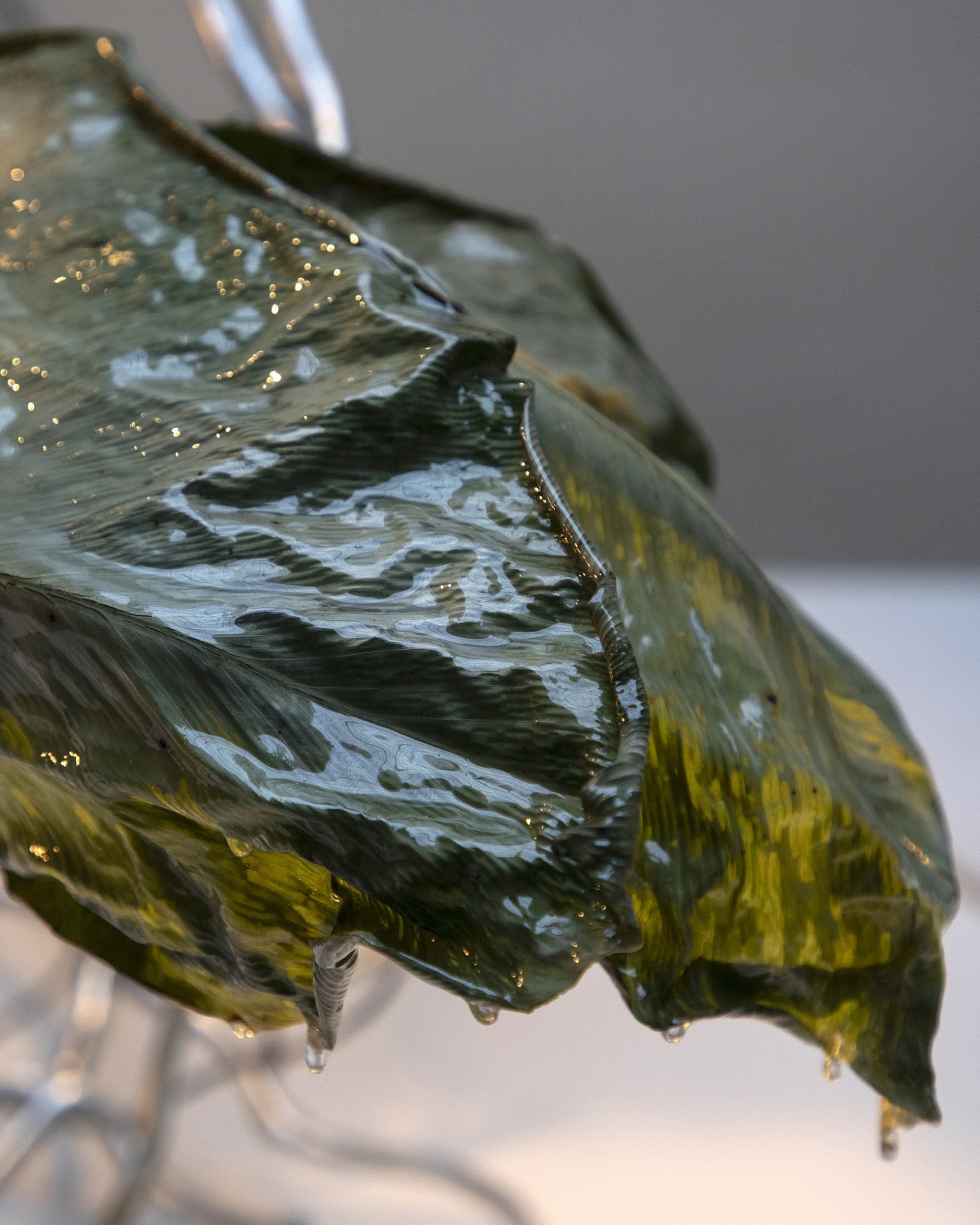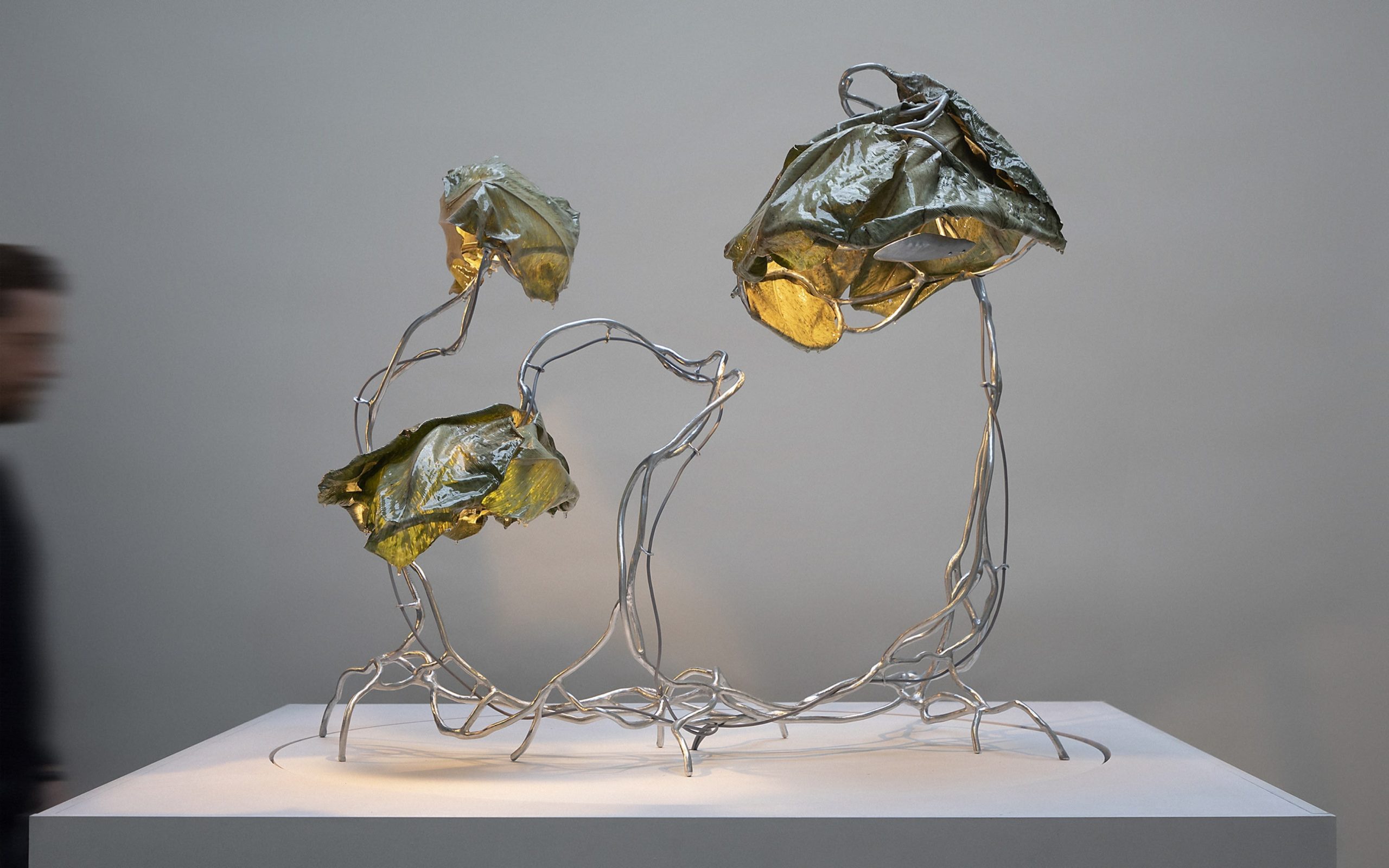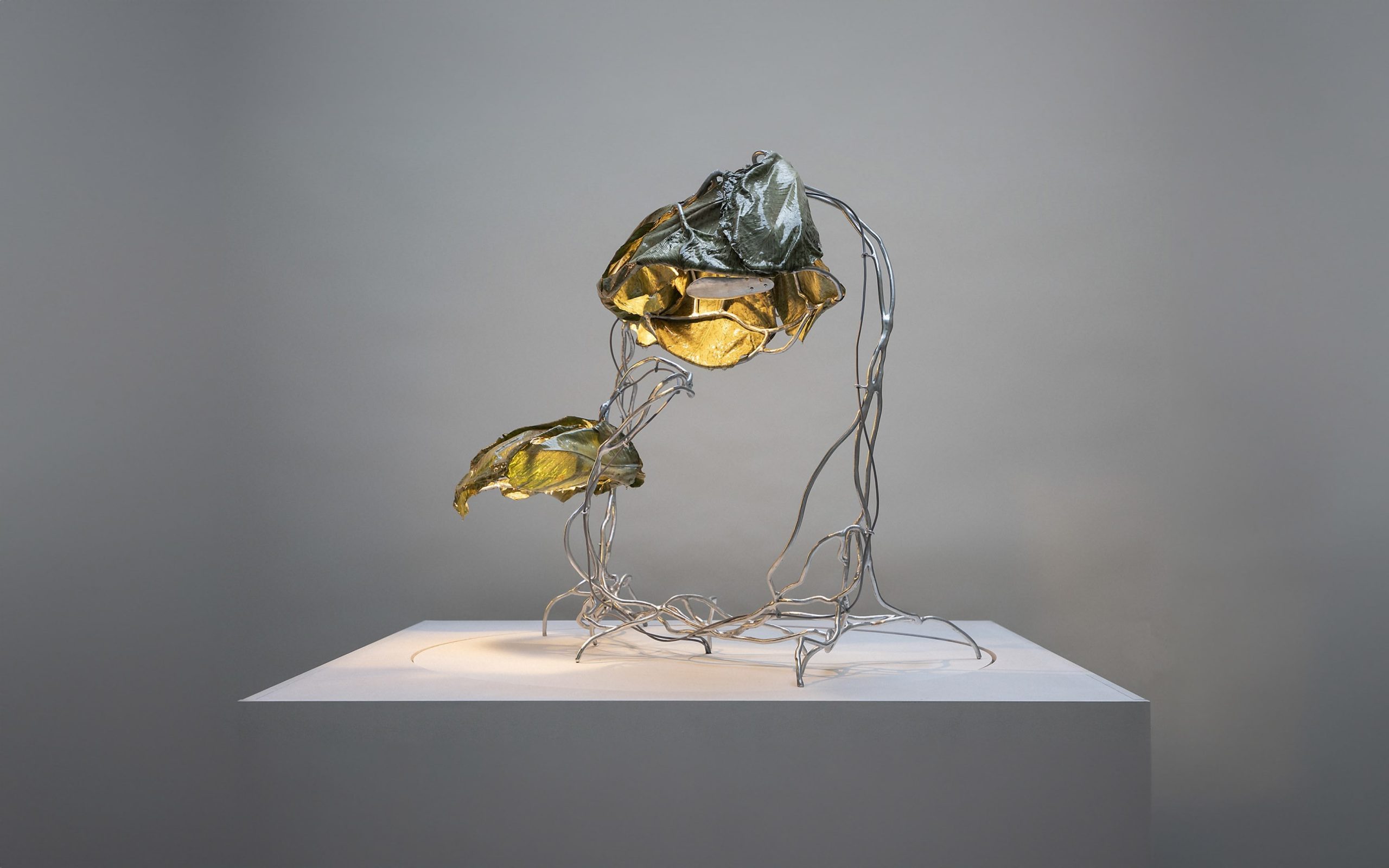 Selected and processed leaves, resin, steel. Light components.