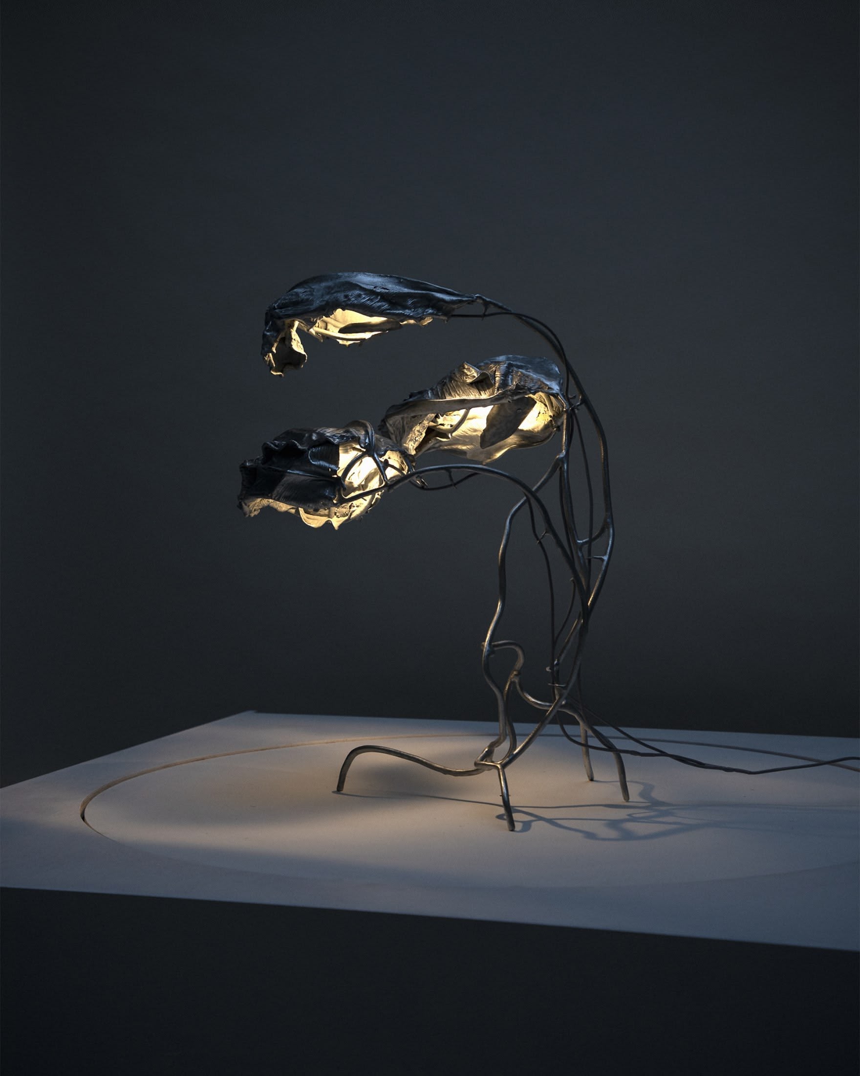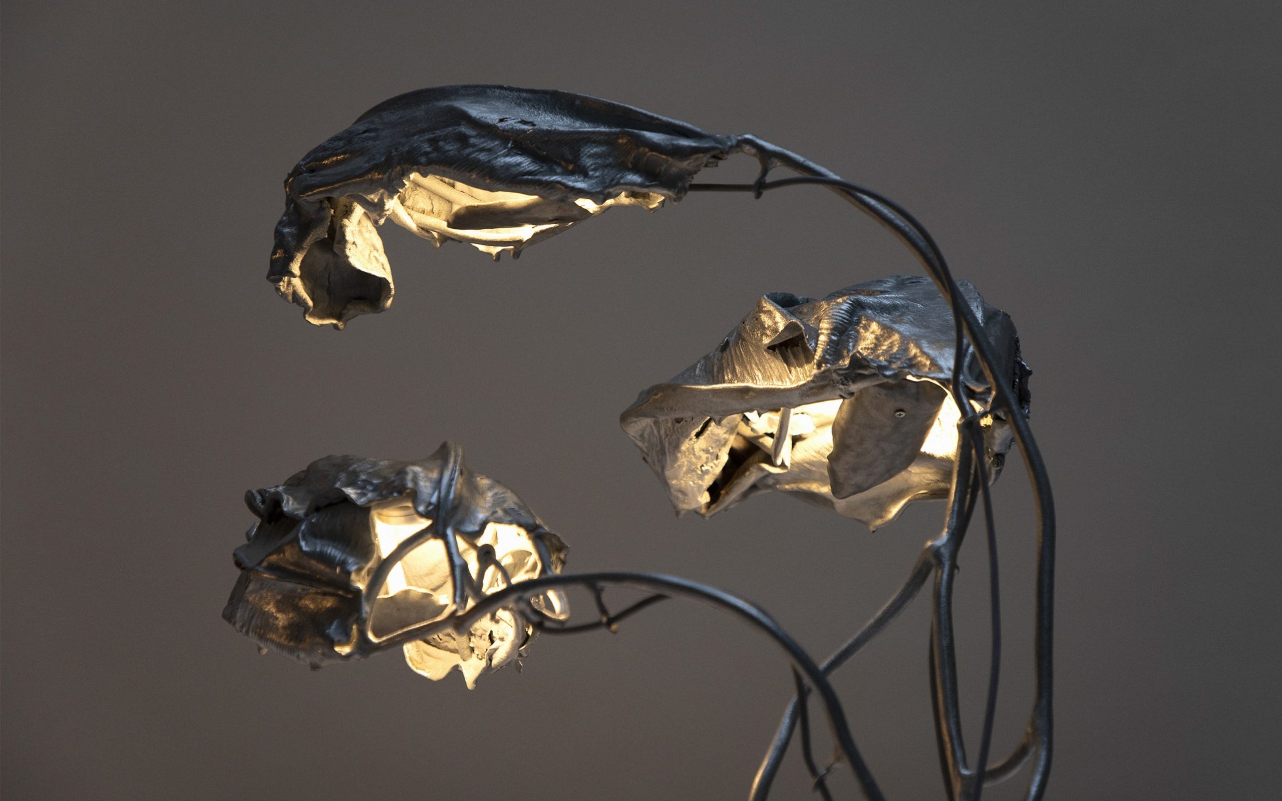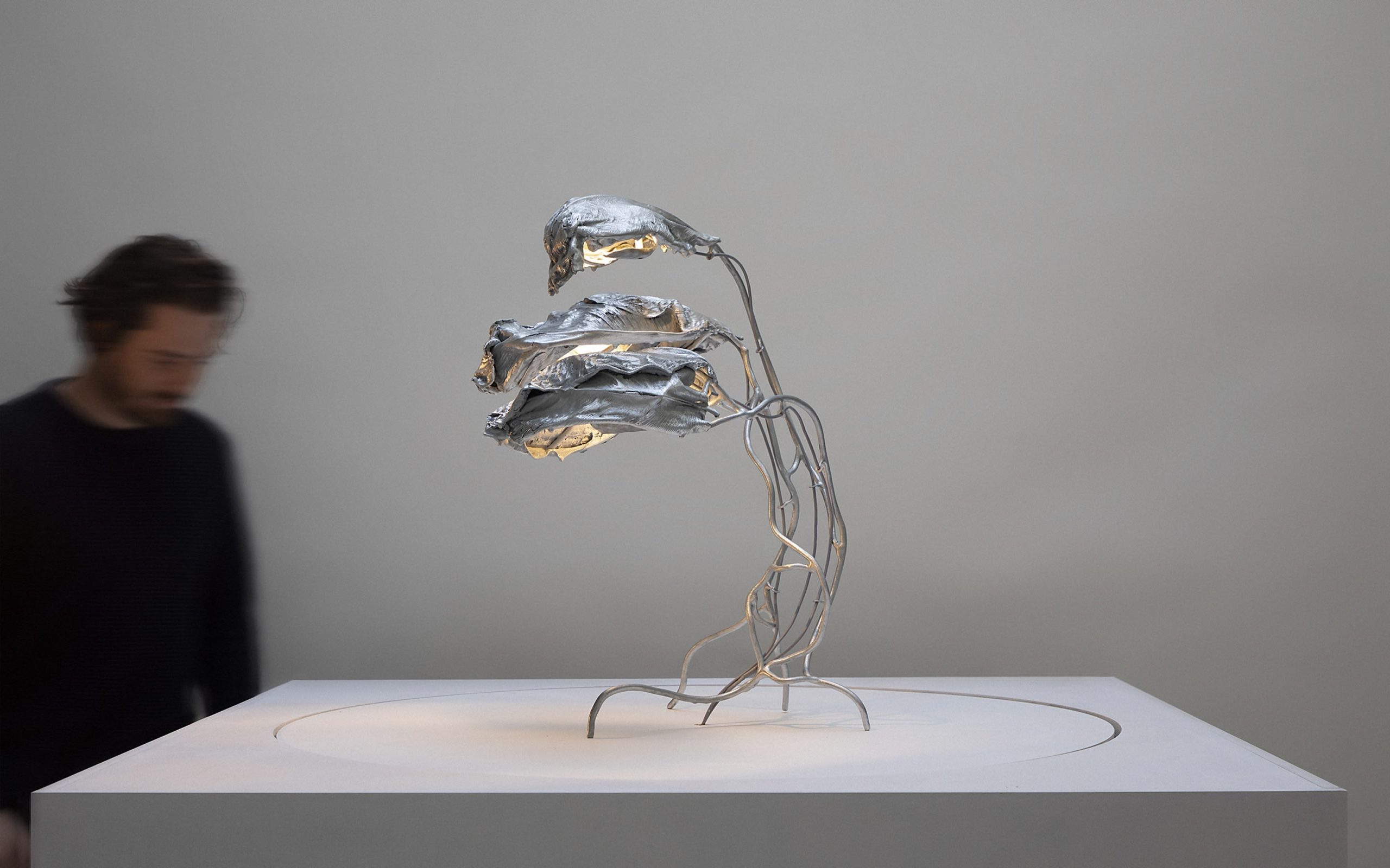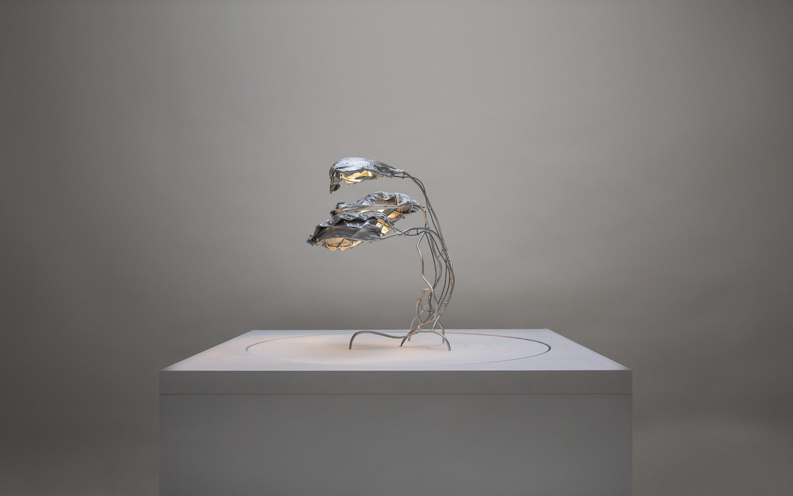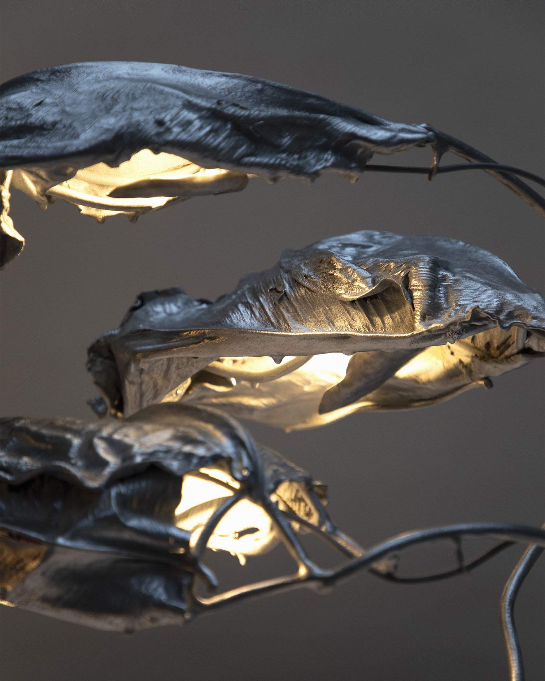 Standing light sculpture made of real leaves, steel and zinc in a sleek, polished finish. In Protoplasting Nature, metal and exotic leaves are combined to make opposing processes — life and death, renewal and decay — evident. A load-bearing structure, formed by hand using welded steel, evokes organic shapes and ornate historical furnishings. The abstract, sculptural lampshade is formed by real leaves from the exotic plant Thaumatococcus Daniellii, a rhizomatic herb widely cultivated in central Africa for its exceptionally sweet fruit and useful leaves. The entire sculpture is then coated in zinc using a thermo-coating process, thus permanently encasing the leaves within a thin metal shell.