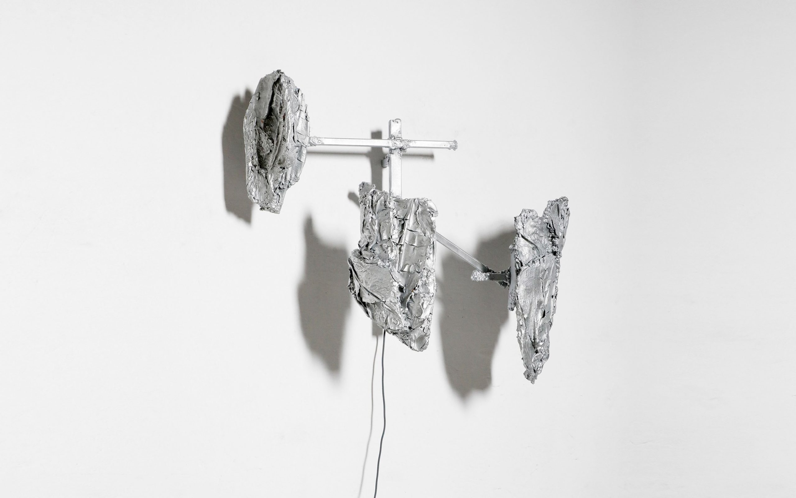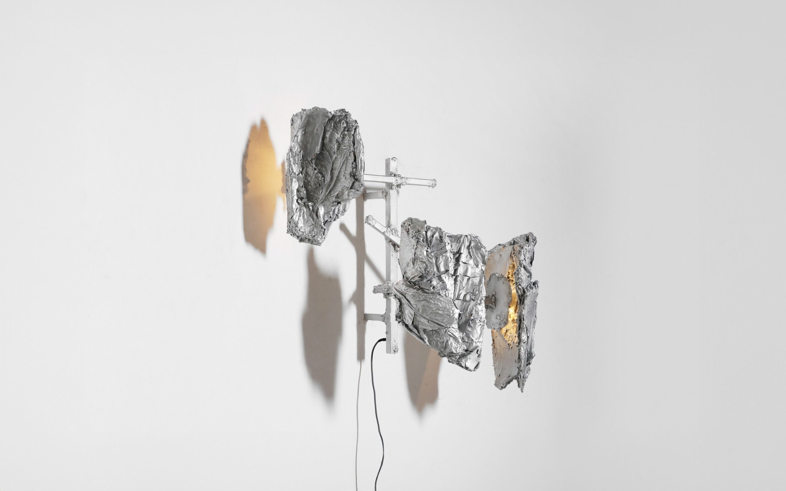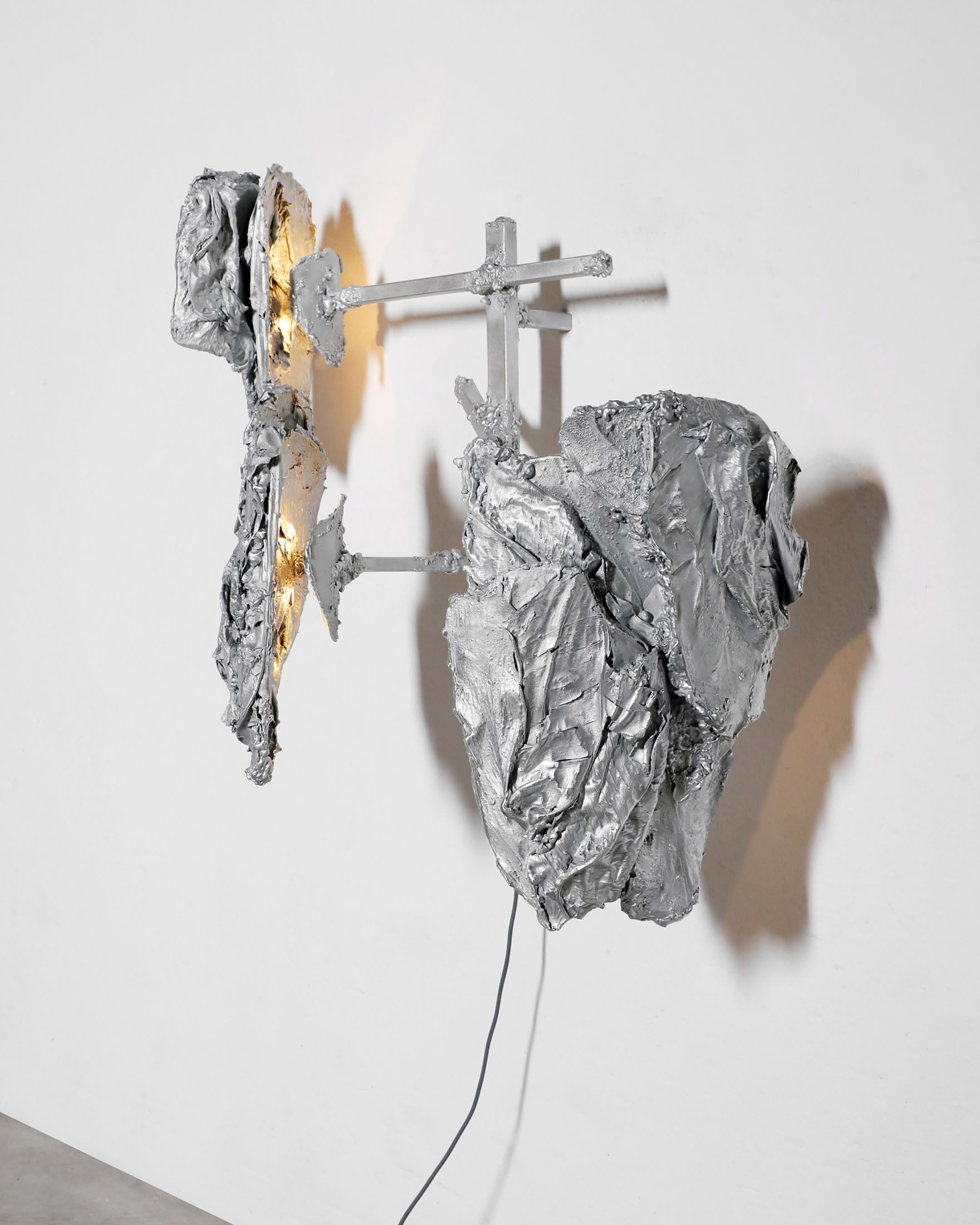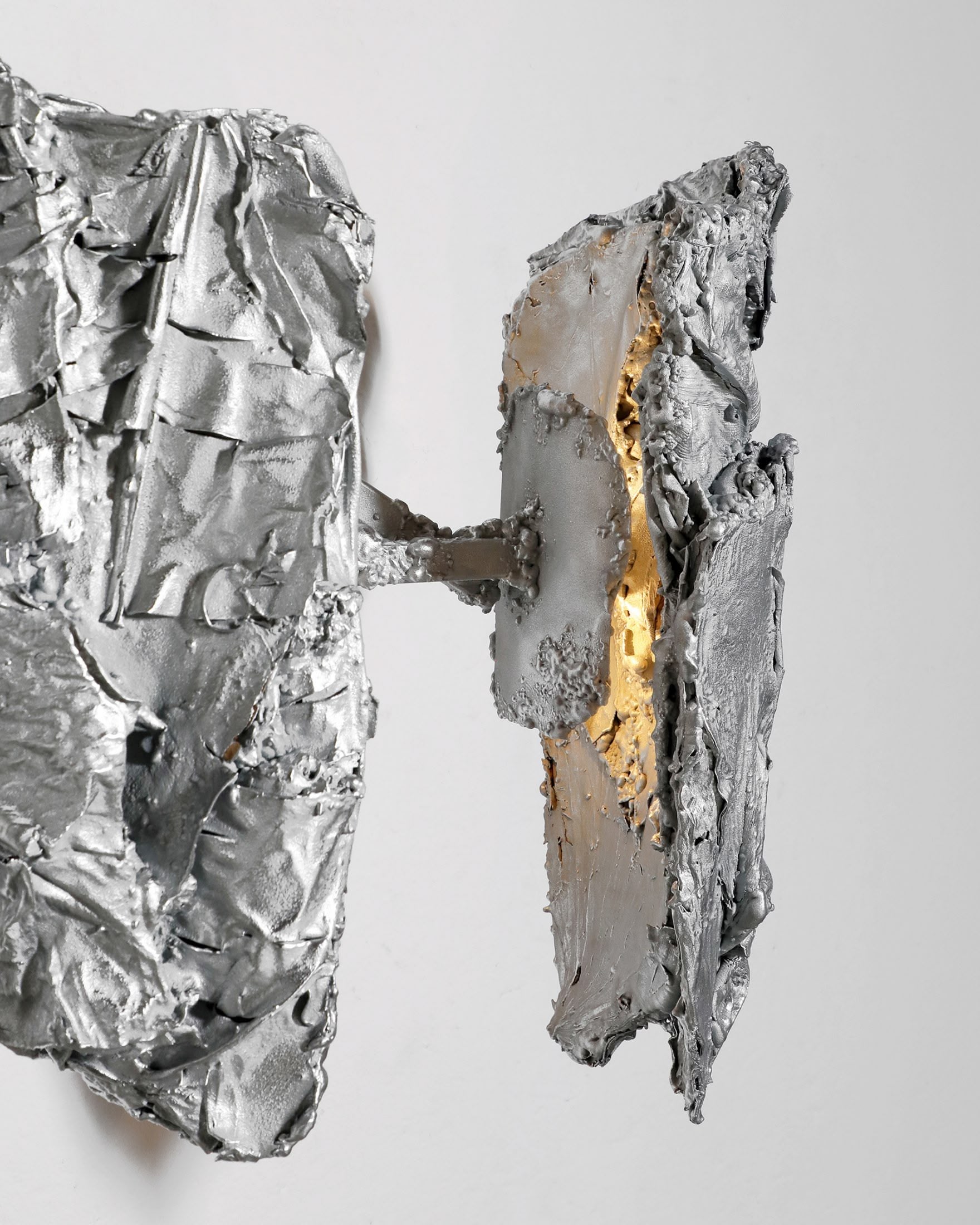 A sculptural wallhanging lamp made of hand-welded steel and specially processed exotic leaves. Finished in polished zinc. In Protoplasting Nature, metal and exotic leaves are combined to make opposing processes — life and death, renewal and decay — evident. Mounted on a welded steel structure, the abstract, sculptural lampshade is formed by real leaves from the exotic plant Thaumatococcus Daniellii, a rhizomatic herb widely cultivated in central Africa for its exceptionally sweet fruit and useful leaves. The entire sculpture is then coated in zinc using a thermo-coating process, thus permanently encasing the leaves within a thin metal shell.