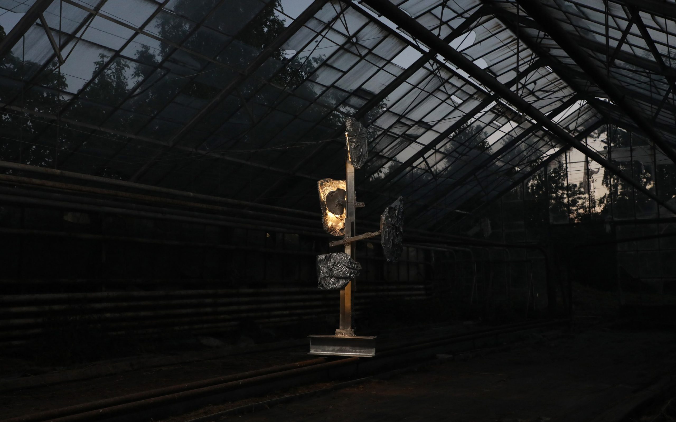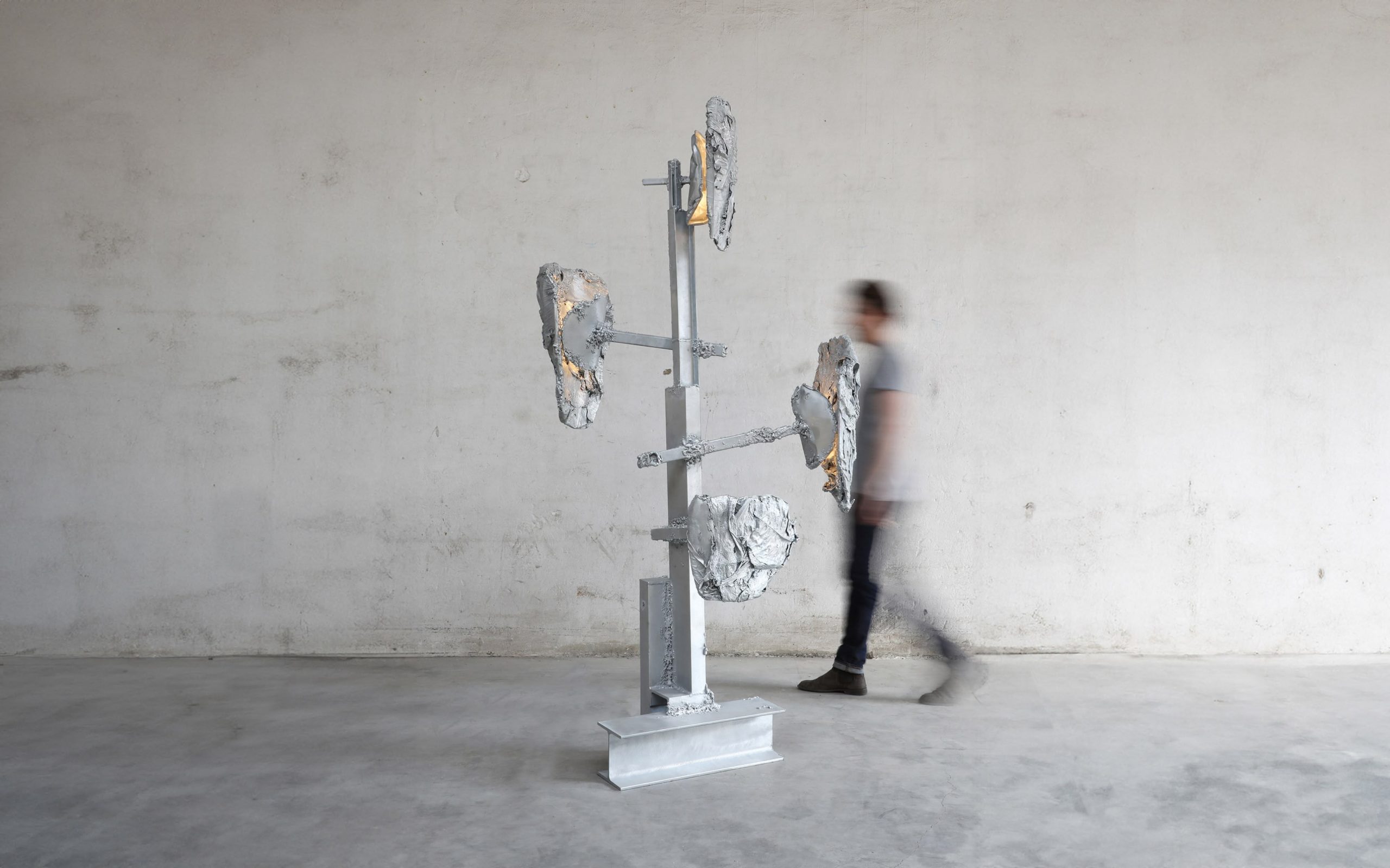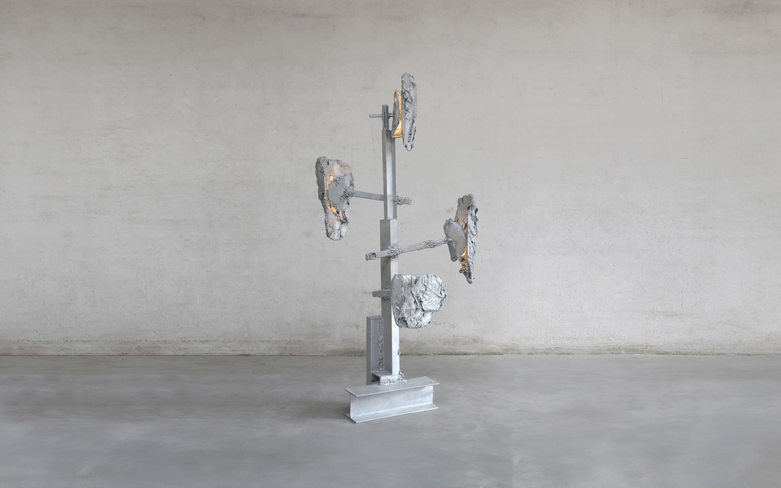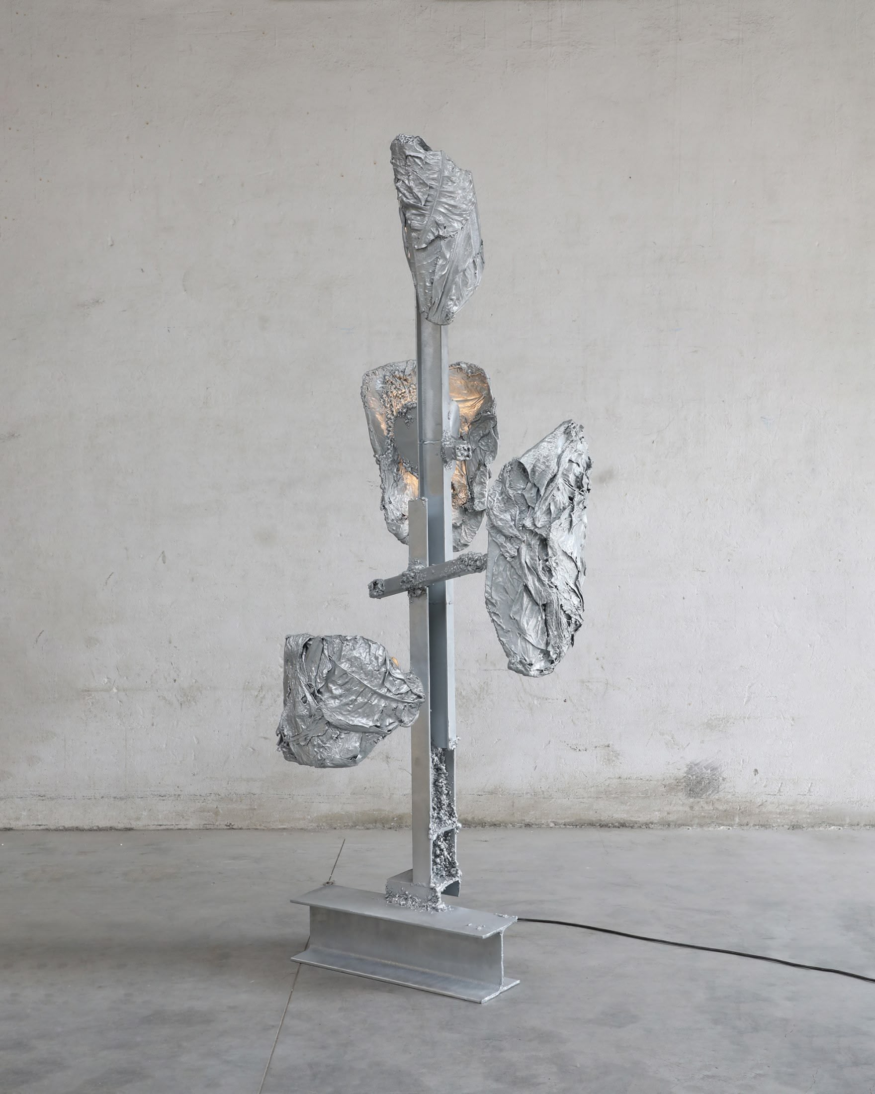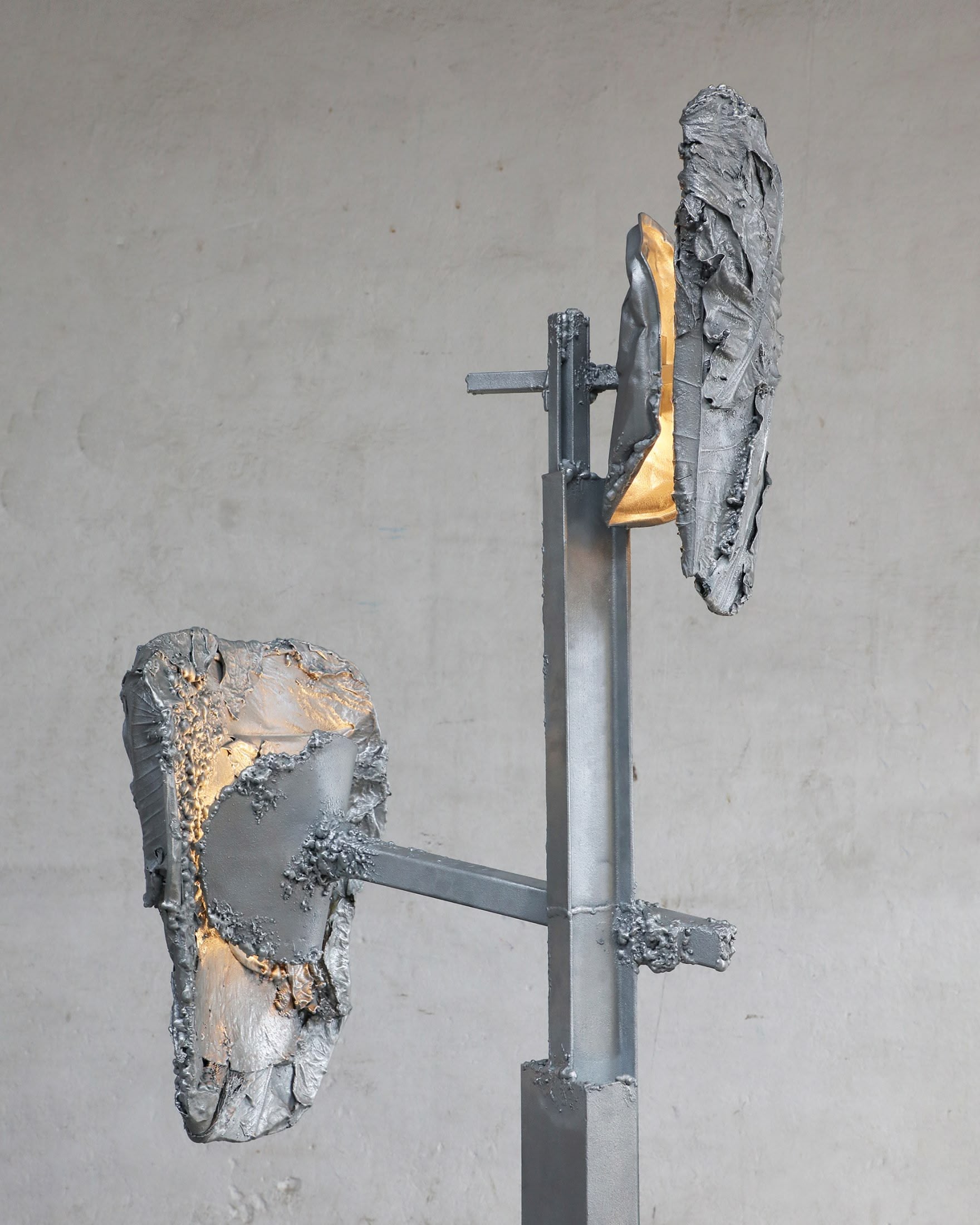 A unique, large standing light sculpture made with hand-welded found metal and specially processed exotic leaves. Finished in polished zinc. In Protoplasting Nature, metal and exotic leaves are combined to make opposing processes — life and death, renewal and decay — evident. Mounted on a welded steel structure, the abstract, sculptural lampshades are formed by real leaves from the exotic plant Thaumatococcus Daniellii, a rhizomatic herb widely cultivated in central Africa for its exceptionally sweet fruit and useful leaves. The entire sculpture is then coated in zinc using a thermo-coating process, thus permanently encasing the leaves within a thin metal shell.