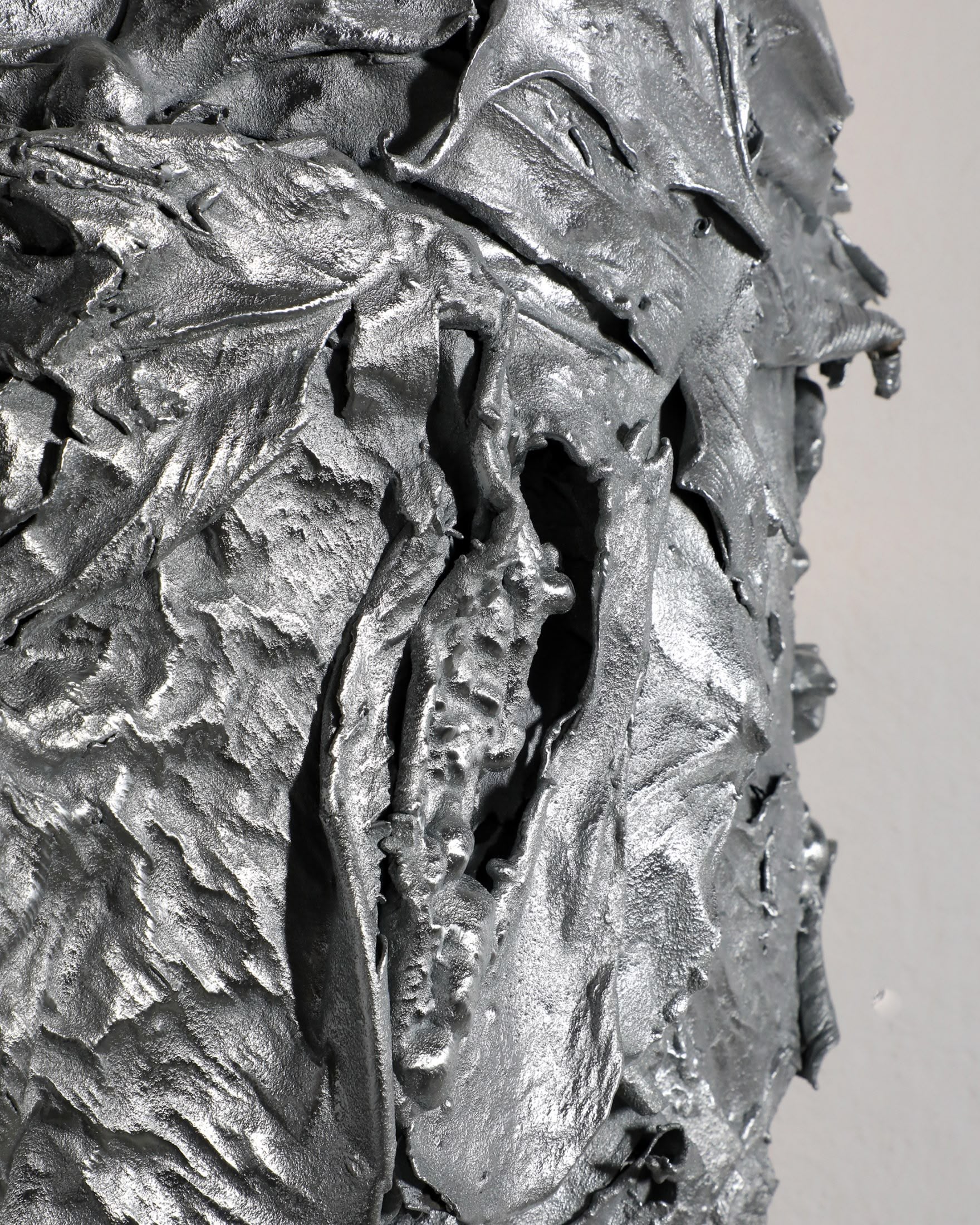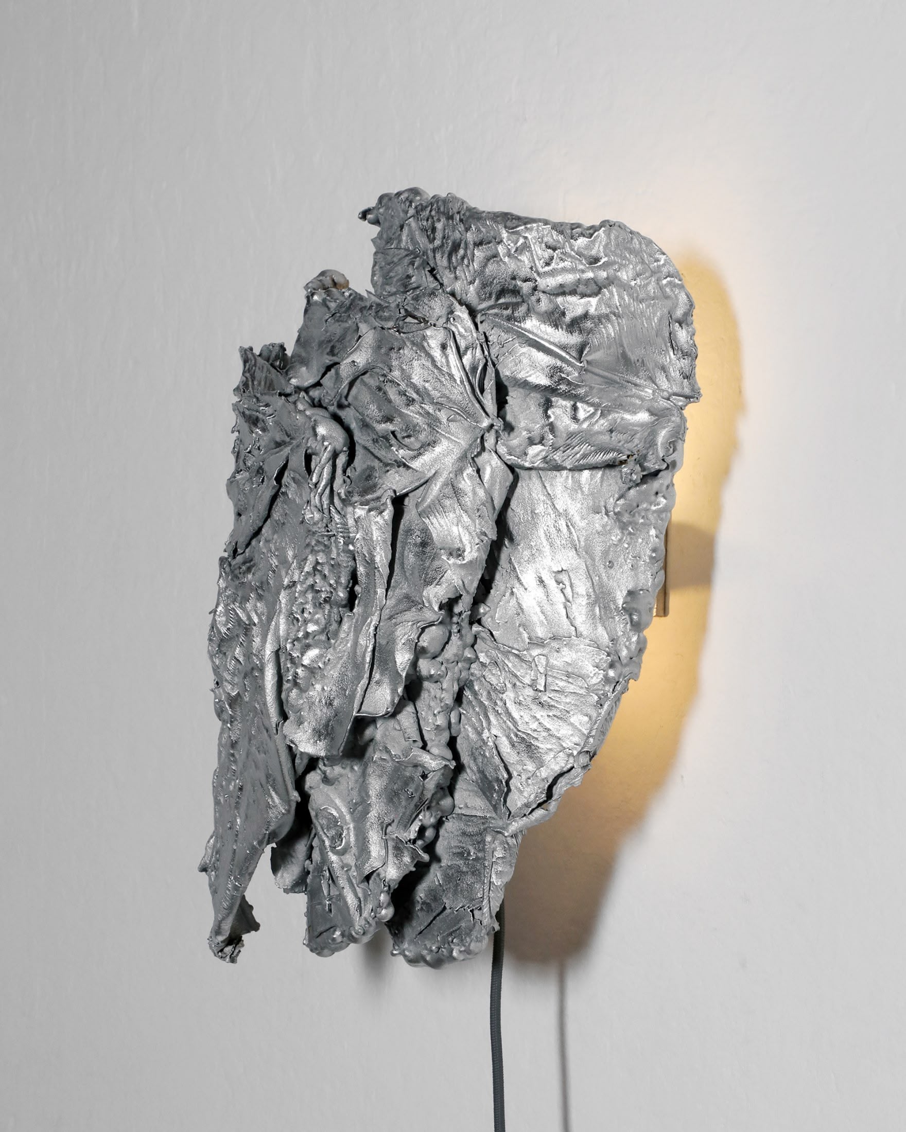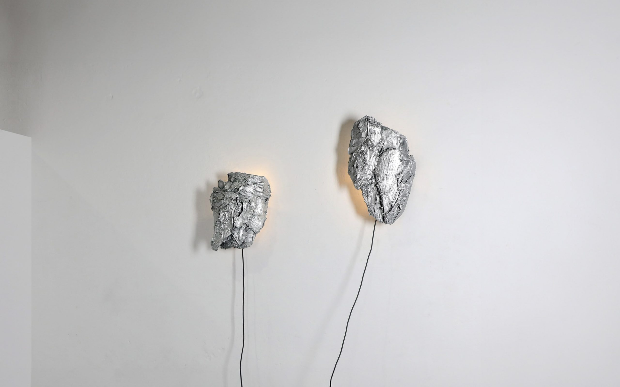 A sculptural wallhanging lamp made of specially processed exotic leaves metallised in a custom-developed thermo-coating process. Finished in polished zinc. In Protoplasting Nature, metal and exotic leaves are combined to make opposing processes — life and death, renewal and decay — evident. The sculptural lampshades of the sconces are formed by real leaves from the exotic plant Thaumatococcus Daniellii, a rhizomatic herb widely cultivated in central Africa for its exceptionally sweet fruit and useful leaves. The entire sculpture is then coated in zinc using a thermo-coating process, thus permanently encasing the leaves within a thin metal shell.