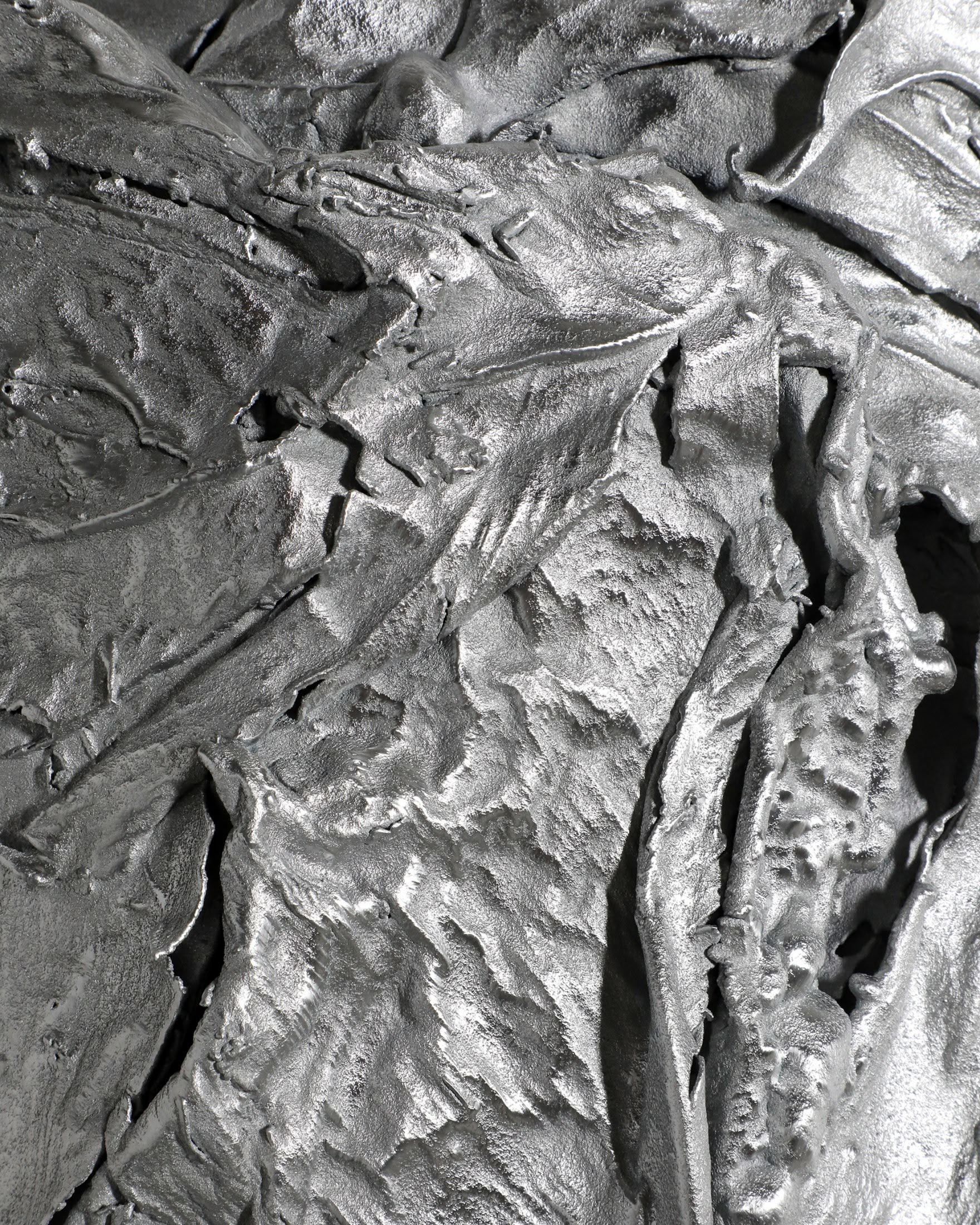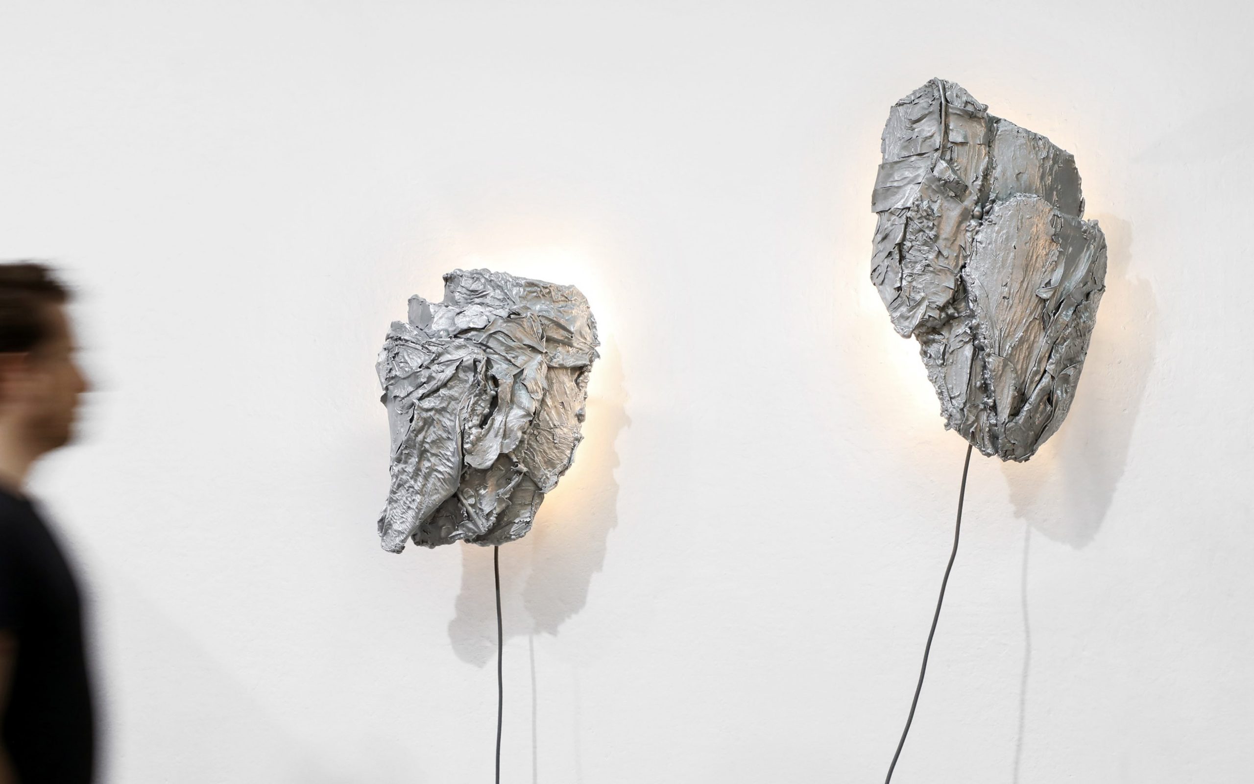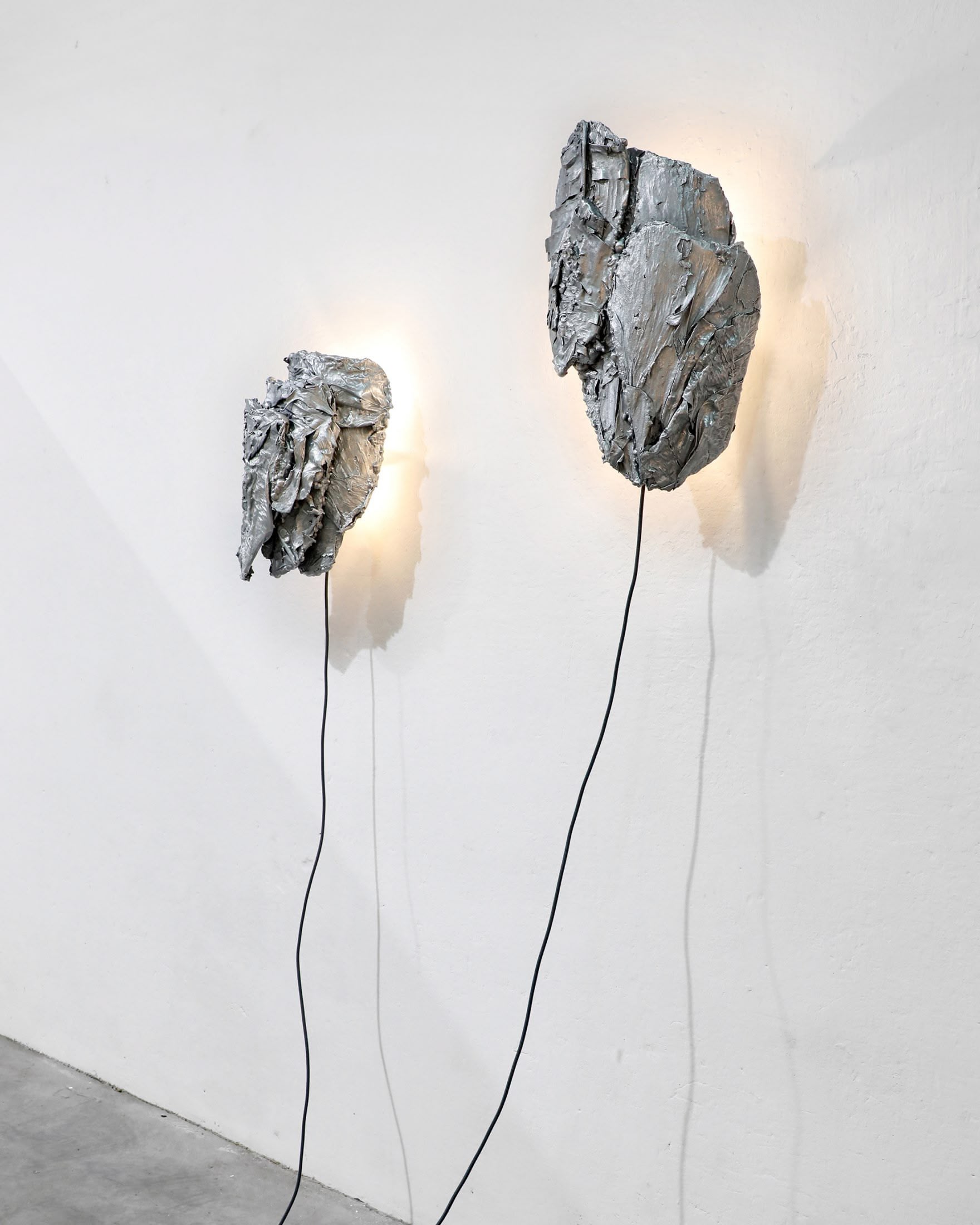 A sculptural wallhanging lamp made of specially processed exotic leaves metallised in a custom-developed thermo-coating process. Finished in polished zinc. In Protoplasting Nature, metal and exotic leaves are combined to make opposing processes — life and death, renewal and decay — evident. The sculptural lampshades of the sconces are formed by real leaves from the exotic plant Thaumatococcus Daniellii, a rhizomatic herb widely cultivated in central Africa for its exceptionally sweet fruit and useful leaves. The entire sculpture is then coated in zinc using a thermo-coating process, thus permanently encasing the leaves within a thin metal shell.