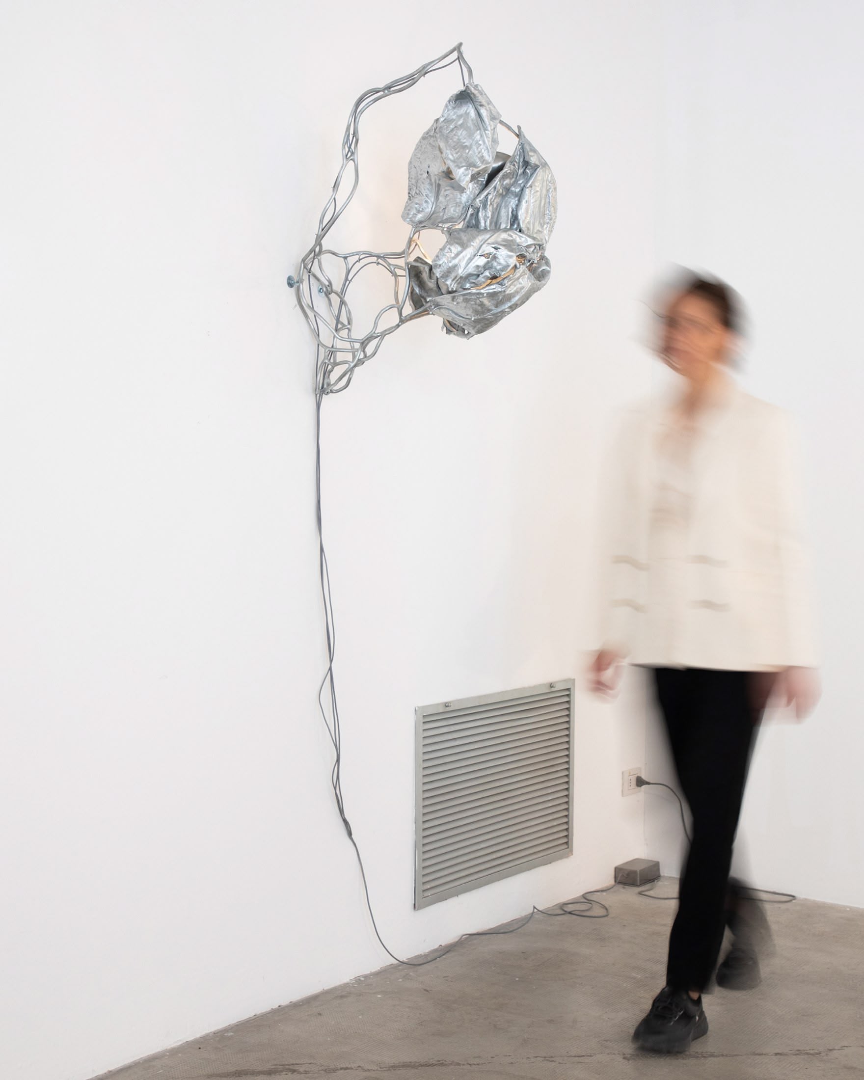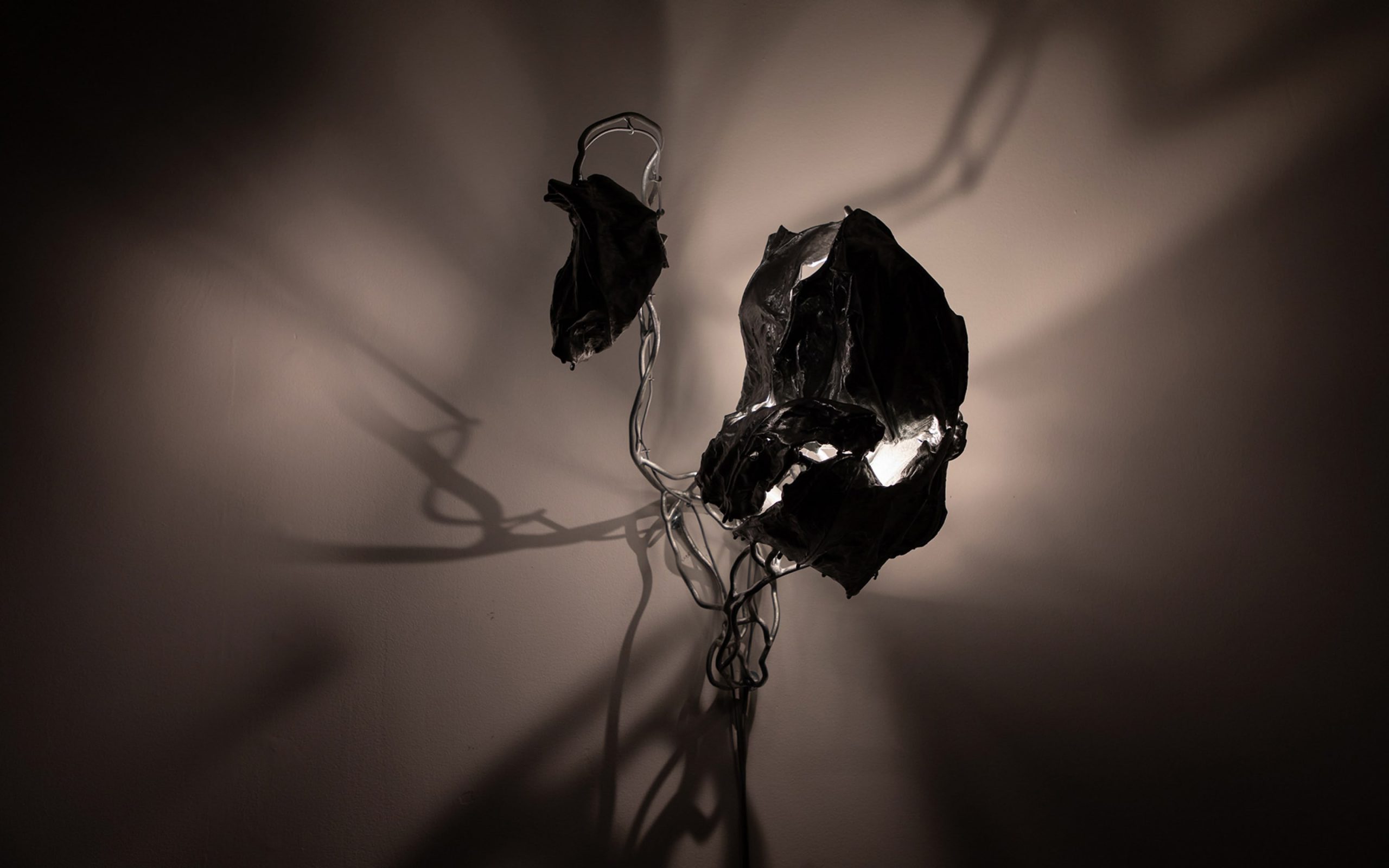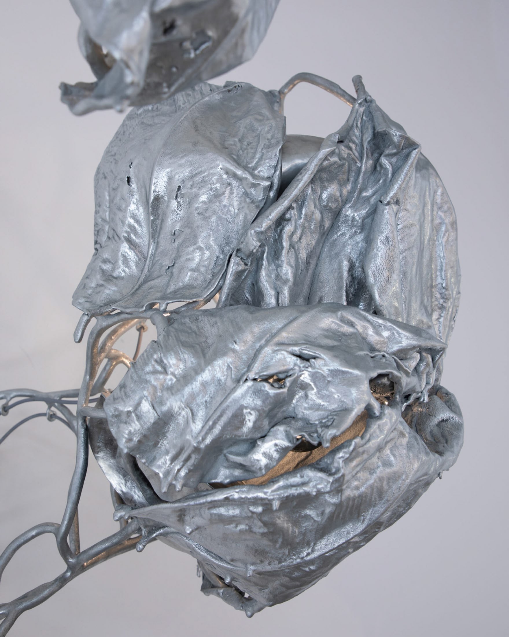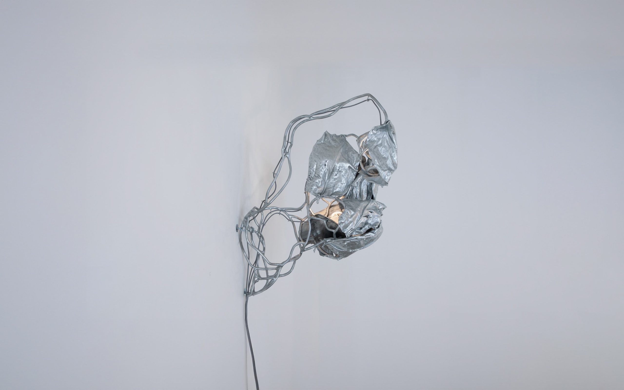 A sculptural wallhanging lamp made of hand-welded steel wire and specially processed exotic leaves. Finished in polished zinc. In Protoplasting Nature, metal and exotic leaves are combined to make opposing processes — life and death, renewal and decay — evident. A load-bearing structure, formed by hand using welded steel, evokes organic shapes and ornate historical furnishings. The abstract, sculptural lampshade is formed by real leaves from the exotic plant Thaumatococcus Daniellii, a rhizomatic herb widely cultivated in central Africa for its exceptionally sweet fruit and useful leaves. The entire sculpture is then coated in zinc using a thermo-coating process, thus permanently encasing the leaves within a thin metal shell.