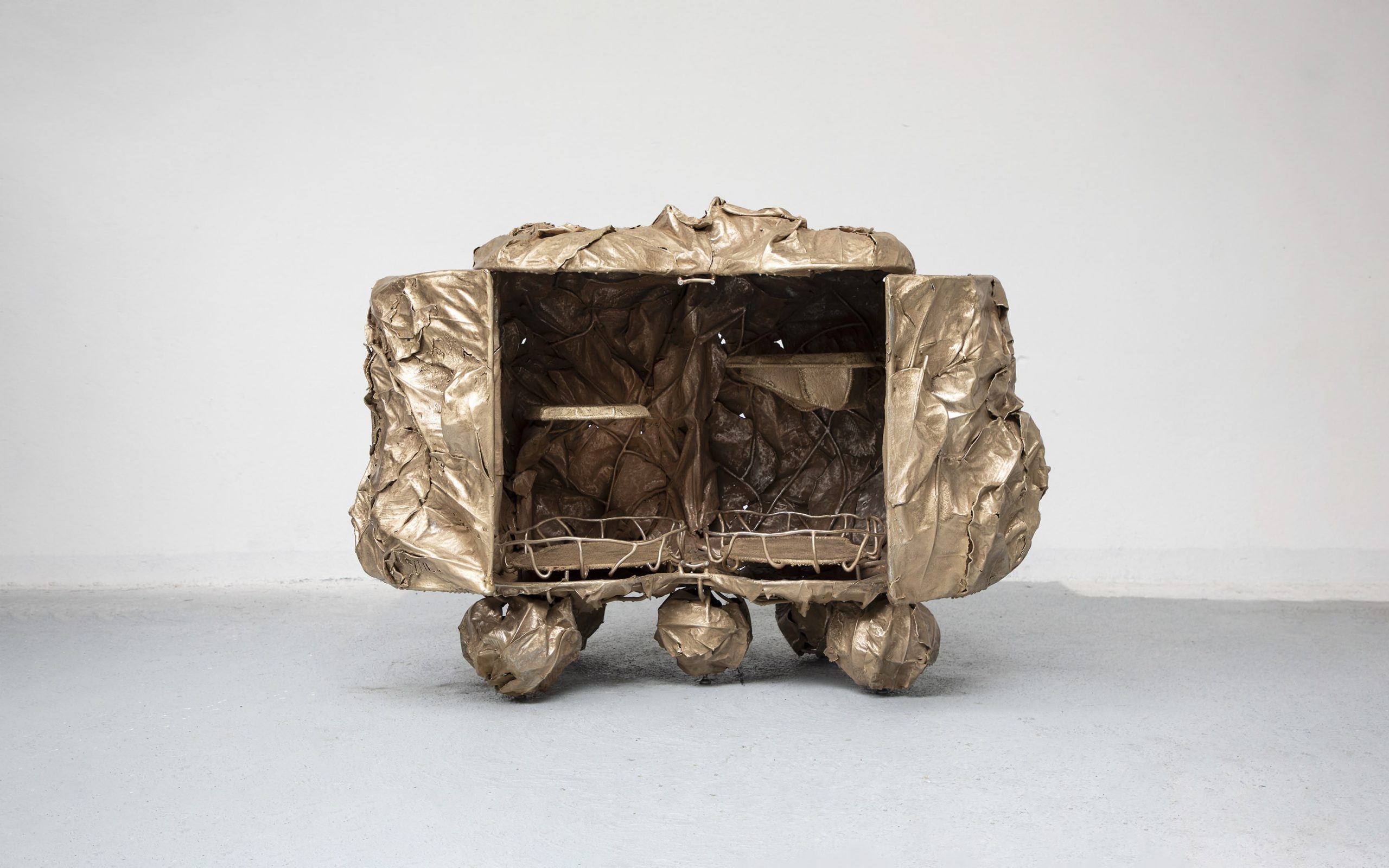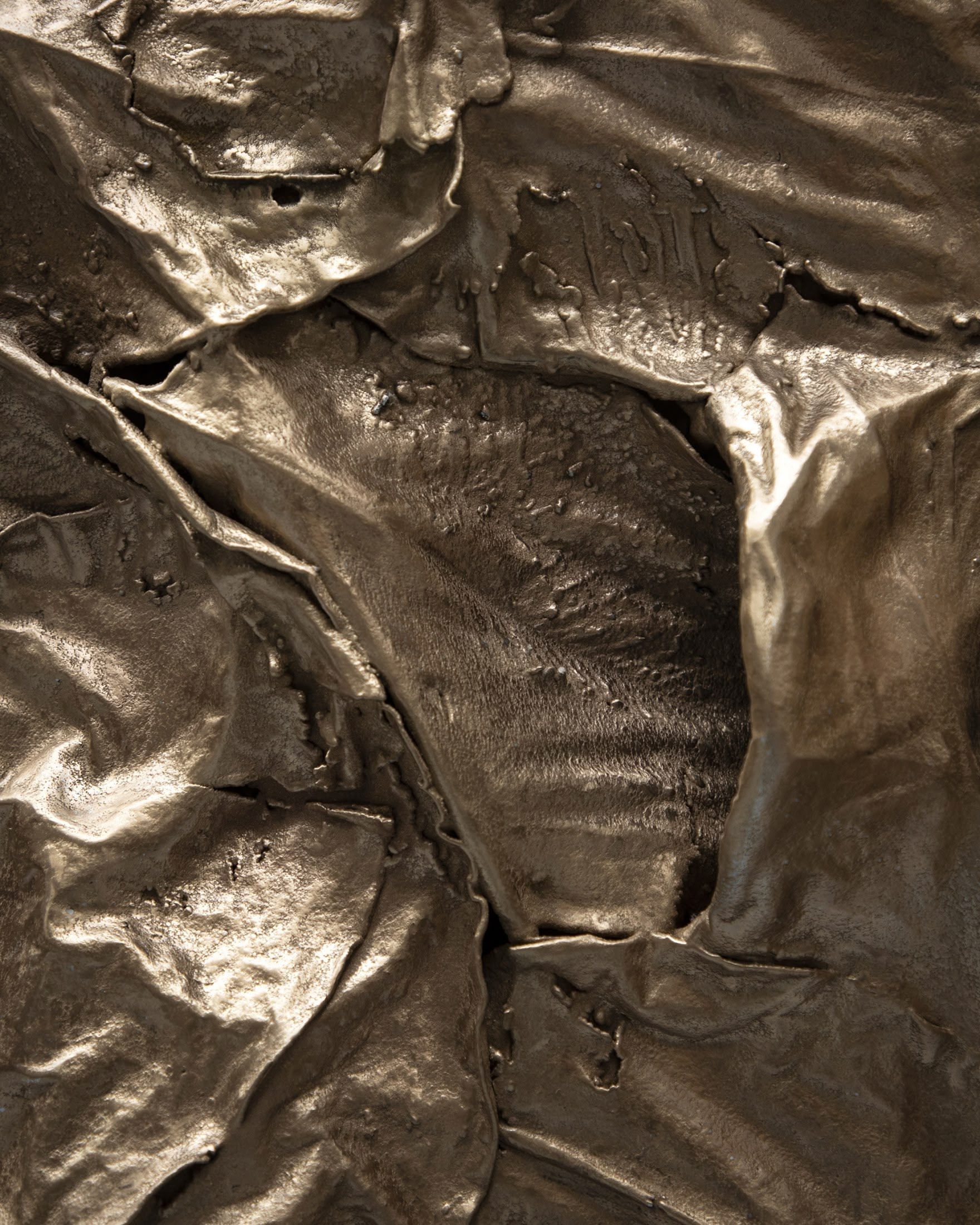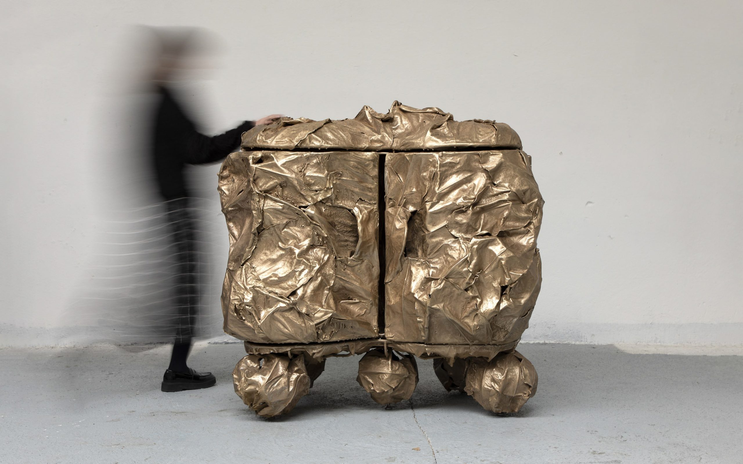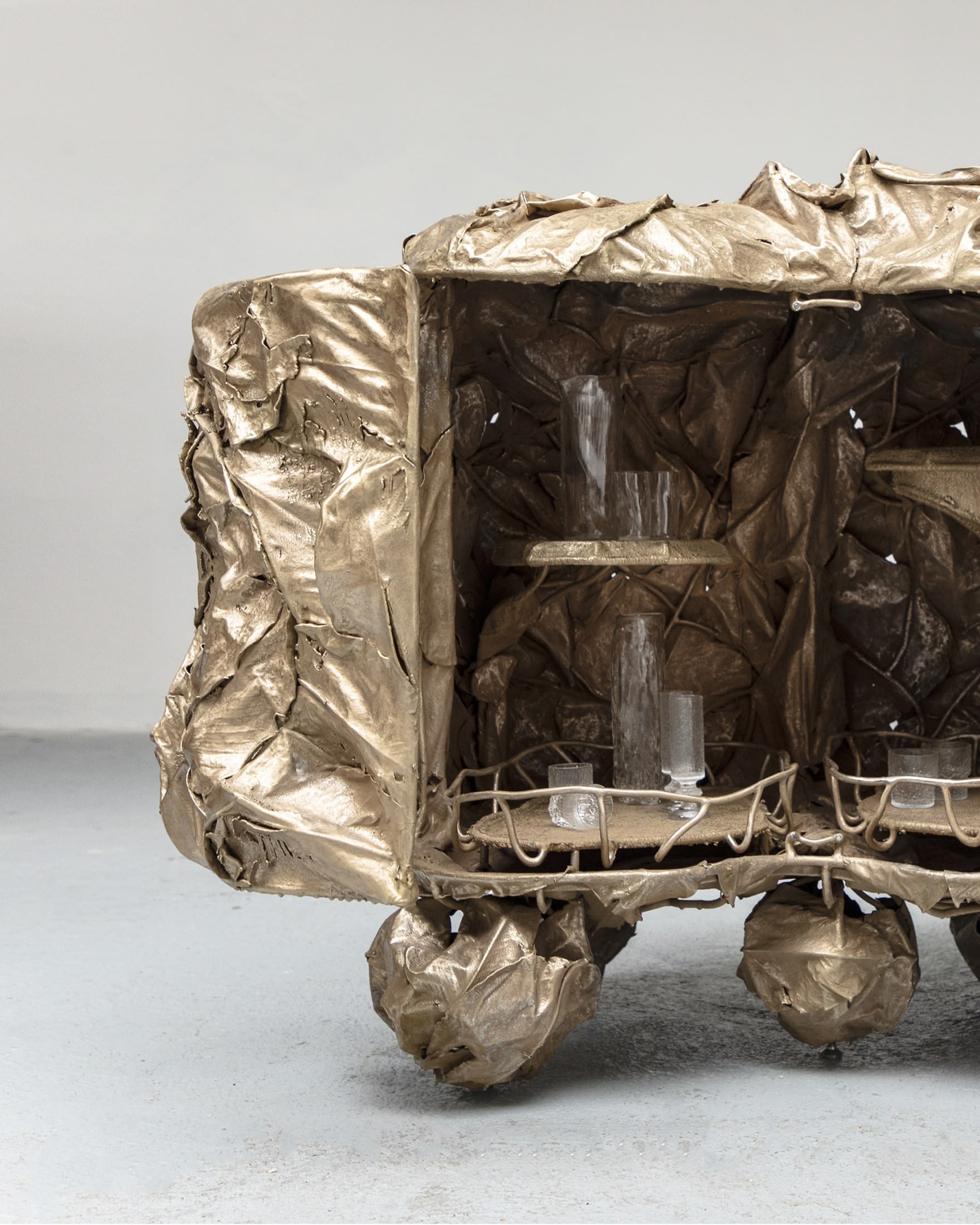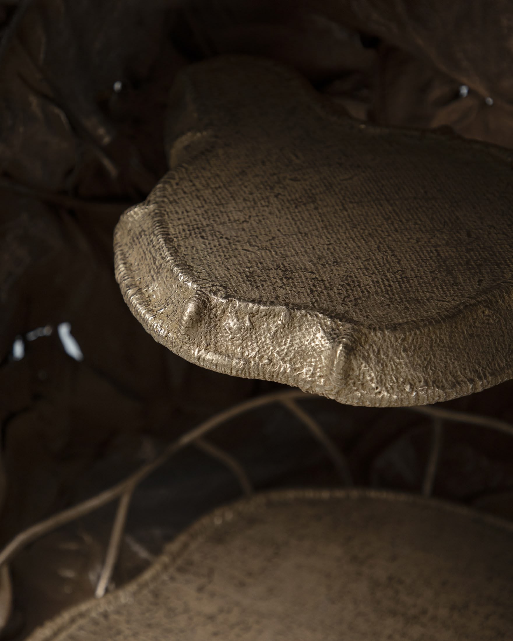 The leaves of Thaumatococcus daniellii – a plant widely used in Africa as a building material – make up the walls of the Protoplasting Nature Cabinet Bronze, while natural jute is used to compose the shelves. Enveloped with polished bronze applied through a bespoke thermo-coating process, the organic materials are solidified inside, leaving a mere memory of what was once pulsating with life. Inspired by Josef Frank’s ‘Flora Cabinet’ and paying tribute to a historical archetype, the piece is part of the Flora Contemporaria limited edition series.