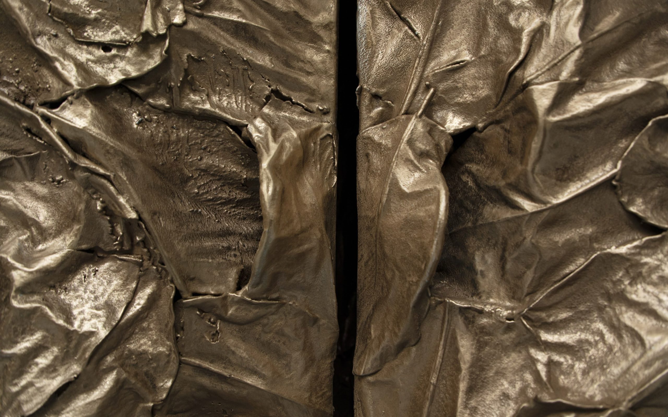 Selected and processed Thaumatococcus daniellii leaves, natural jute, bronze, steel.