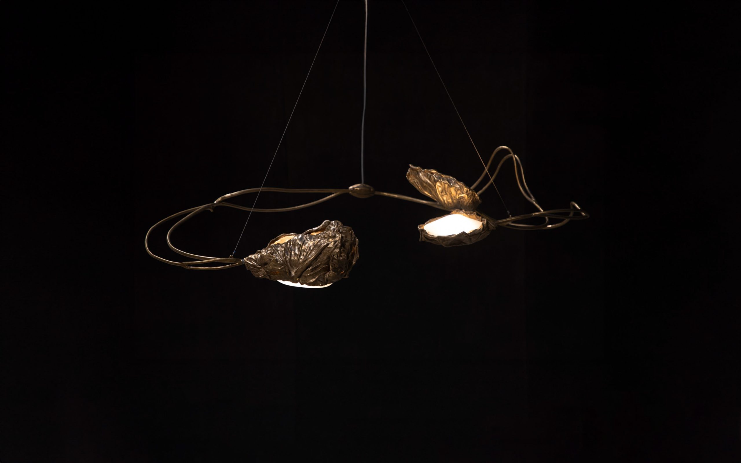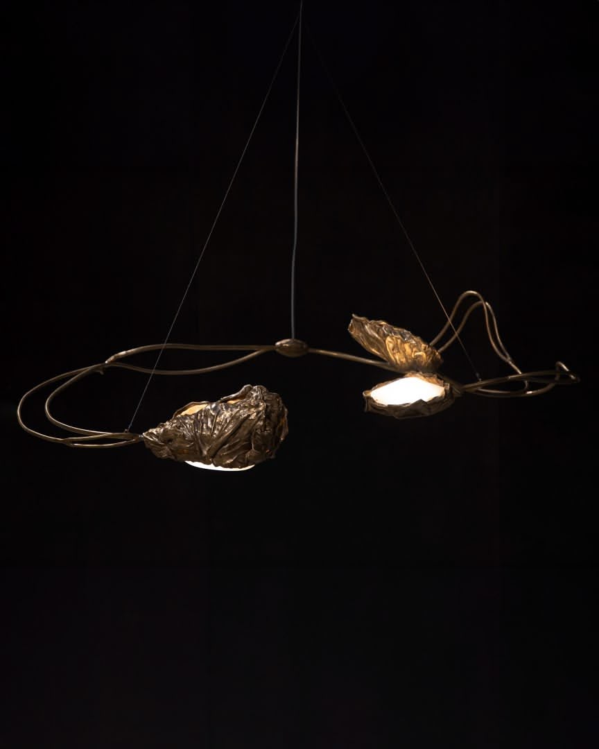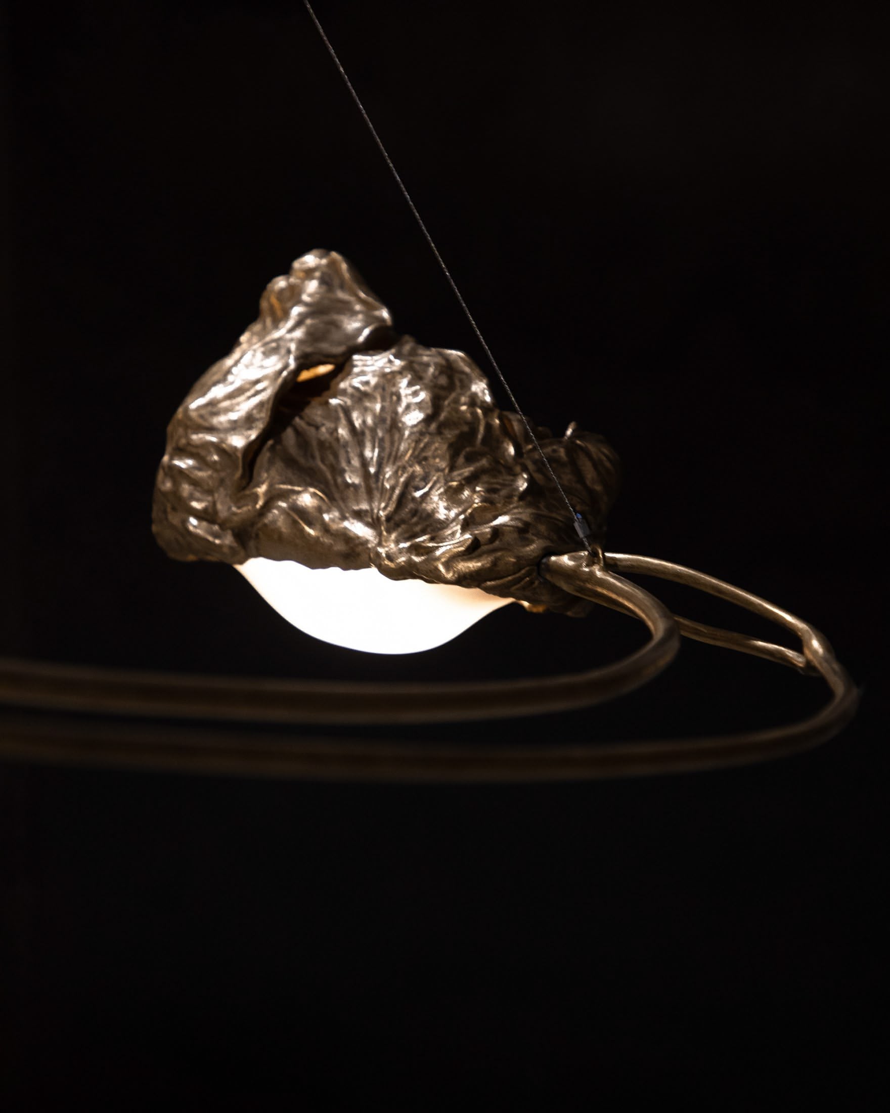 A unique light sculpture combining artisanal creation with the advancements of digital fabrication. The abstract, sculptural shades are digitally modelled based on spear-shaped Anthurium spathes. Cantilevered on a hand-welded steel wire frame, they create a dynamic, kinetic form that is metallised in polished bronze, evoking the shapes of botanical anatomical parts, with buds and petals gently hovering on delicate metal stems.