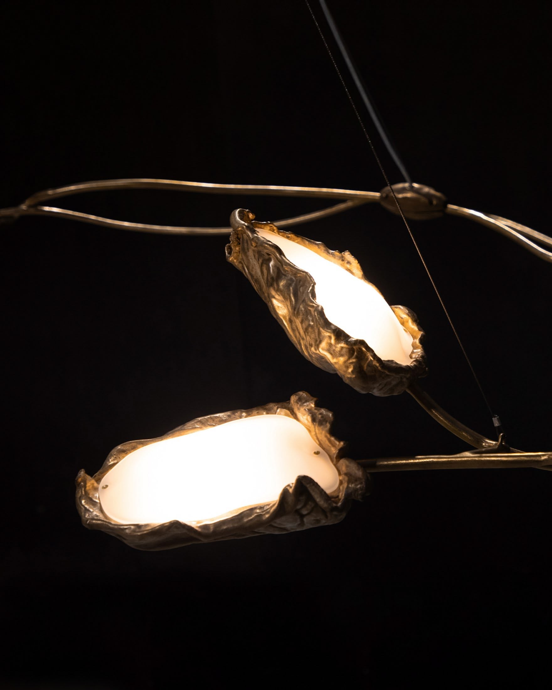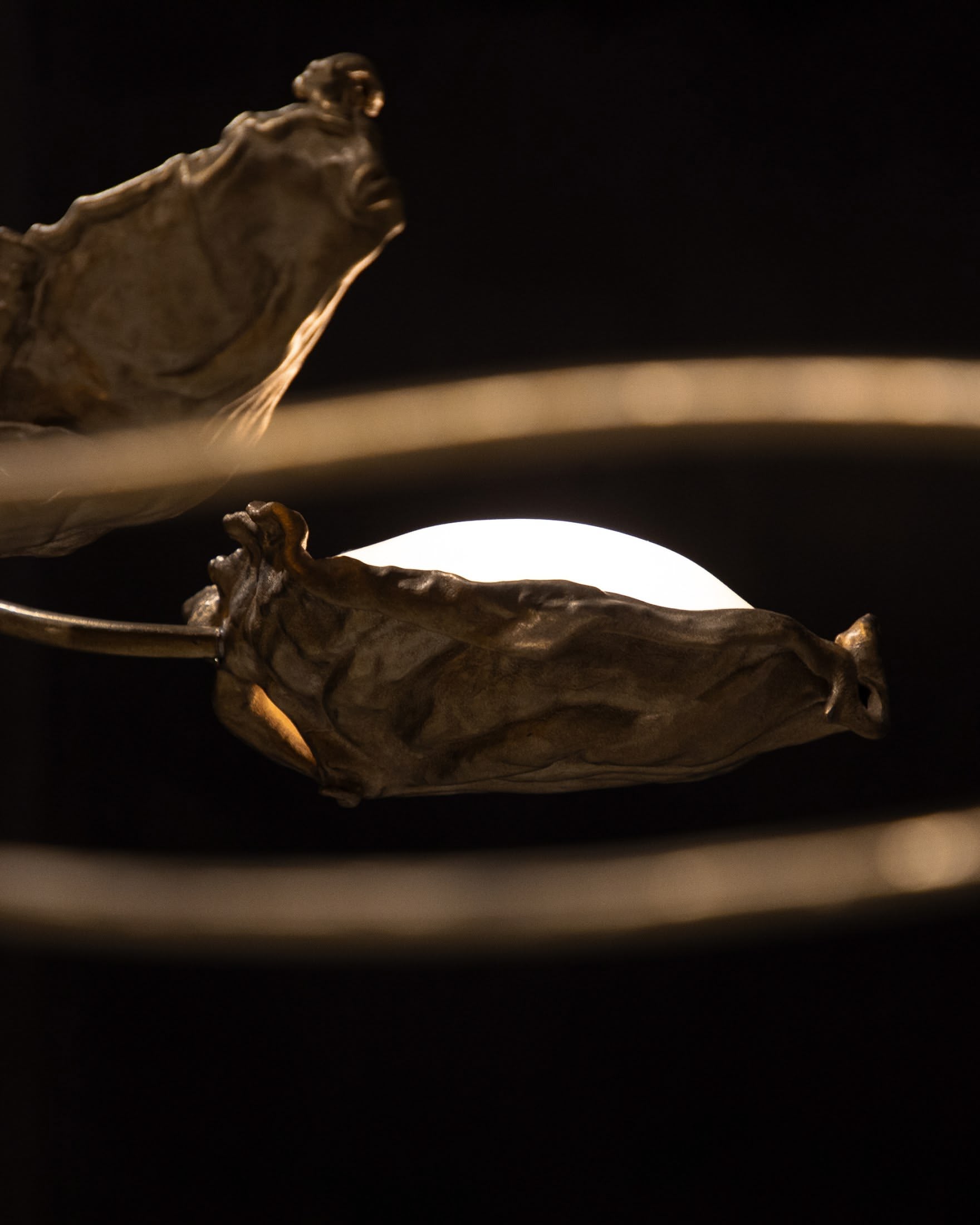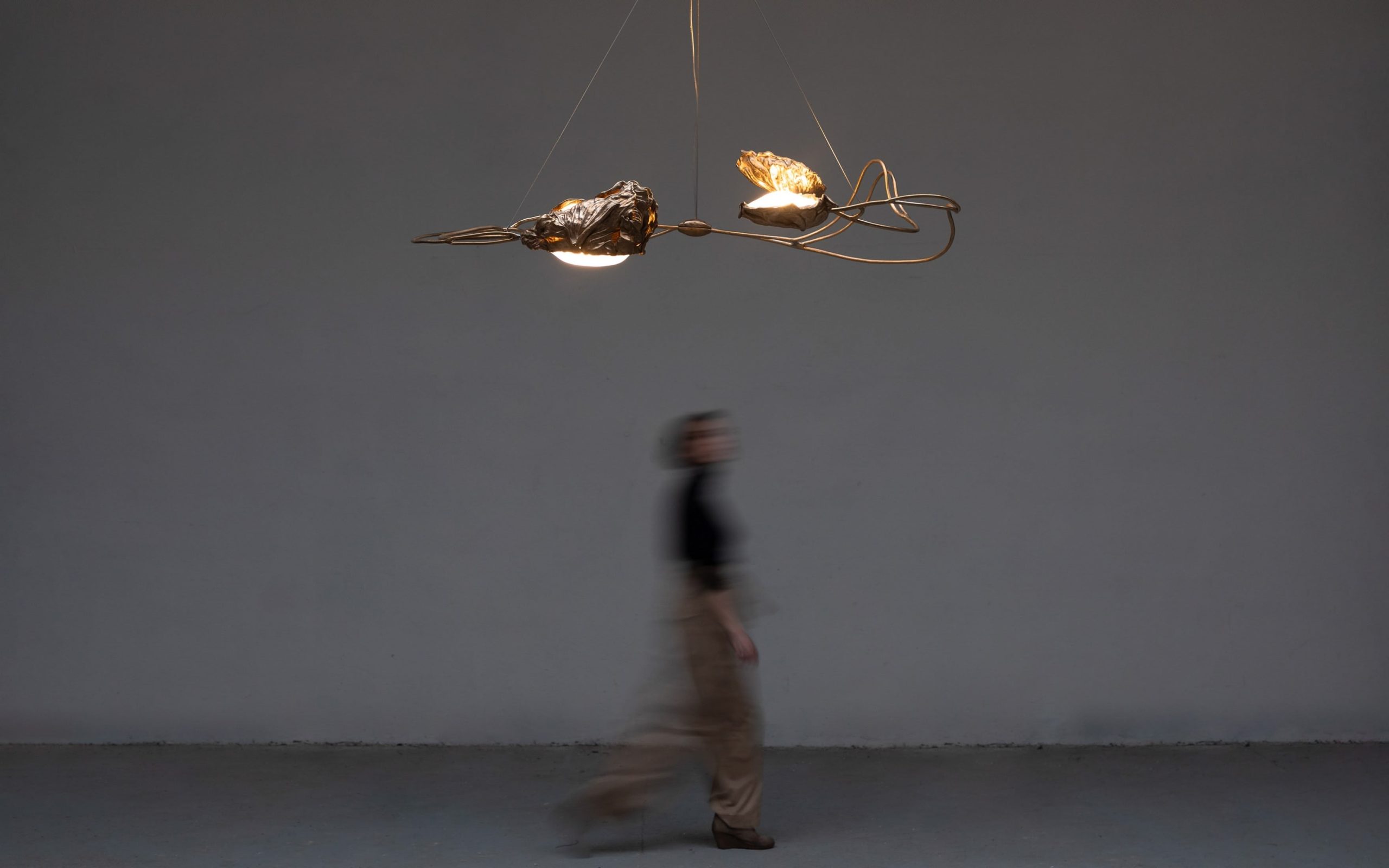 A unique light sculpture combining artisanal creation with the advancements of digital fabrication. The abstract, sculptural shades are digitally modelled based on spear-shaped Anthurium spathes. Cantilevered on a hand-welded steel wire frame, they create a dynamic, kinetic form that is metallised in polished bronze, evoking the shapes of botanical anatomical parts, with buds and petals gently hovering on delicate metal stems.