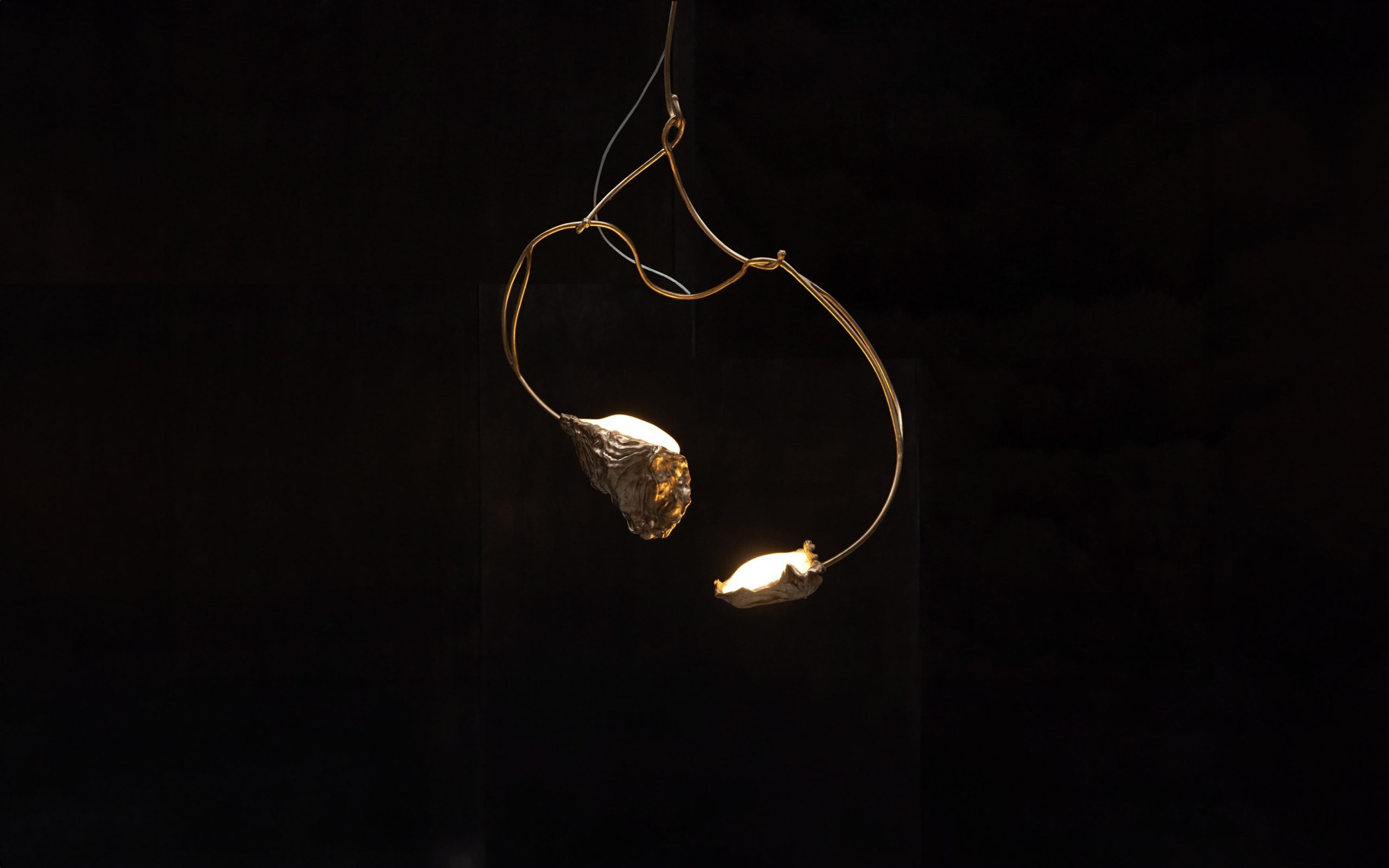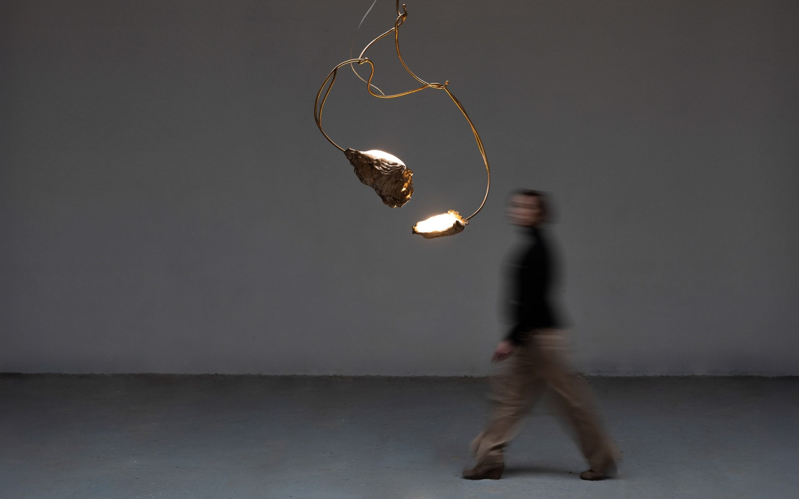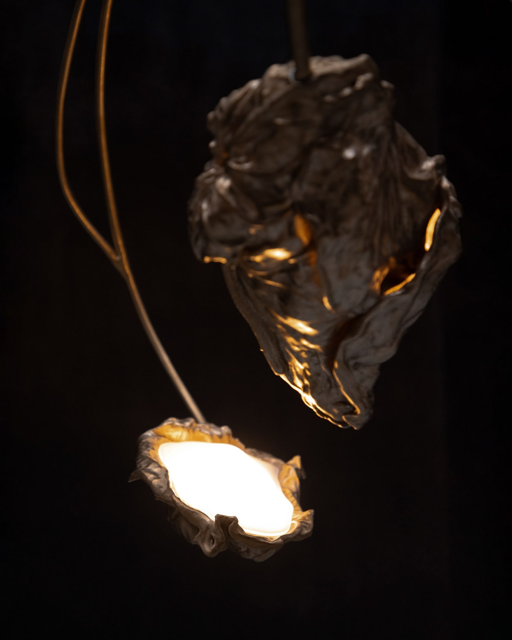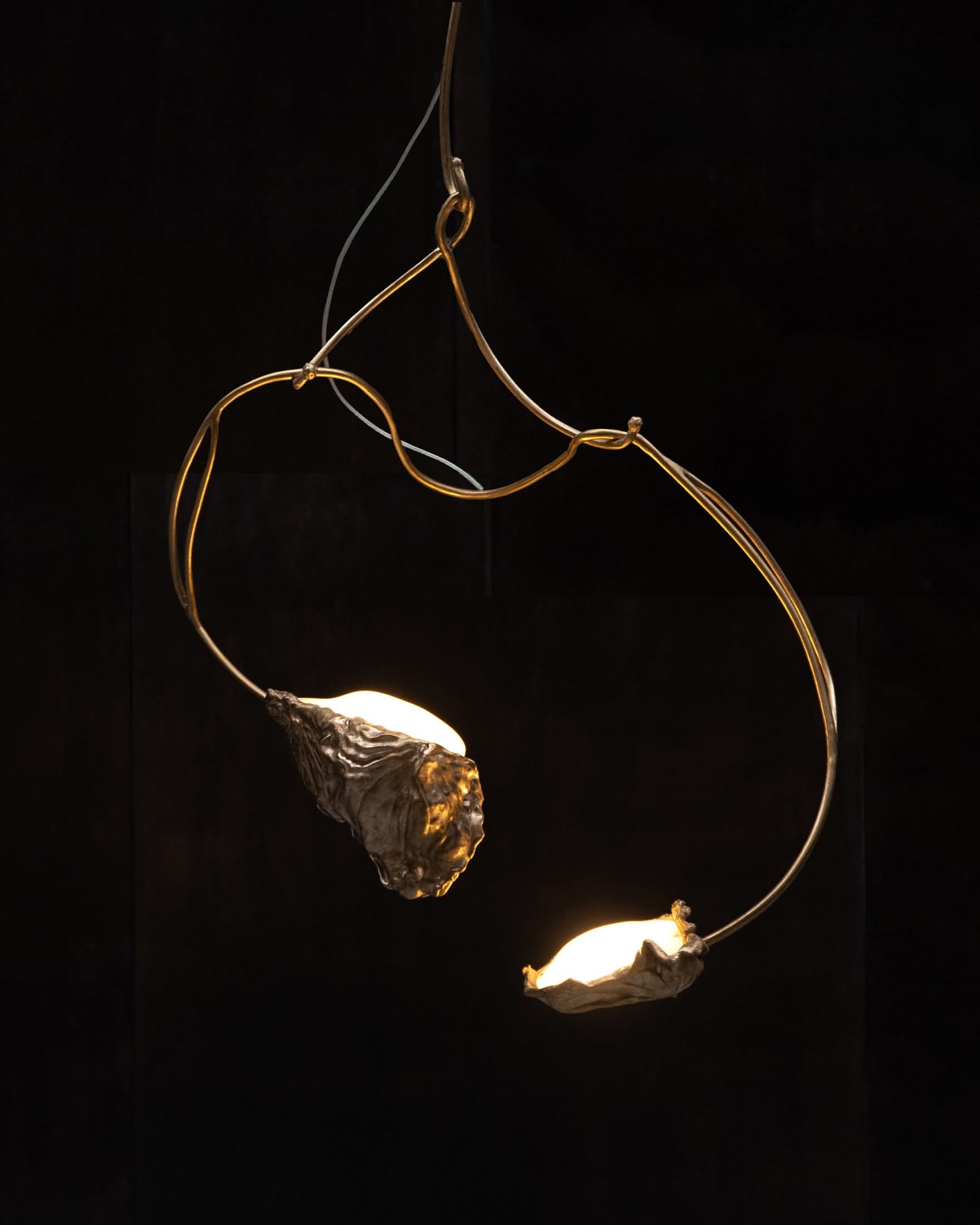 A unique light sculpture combining artisanal creation with the advancements of digital fabrication. The abstract, sculptural shades are digitally modelled based on spear-shaped Anthurium spathes. Cantilevered on a hand-welded steel wire frame, they create a dynamic, kinetic form that is metallised in polished bronze, evoking the shapes of botanical anatomical parts, with buds and petals gently hovering on delicate metal stems.